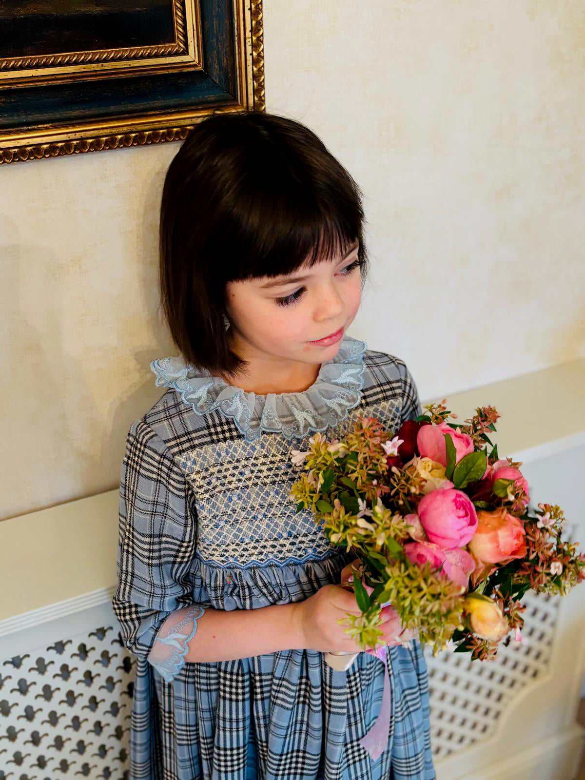 We believe true style does not always lie in predictability but in thoughtful juxtaposition. In this dress strength and delicacy dance together. Through this design we have united two different worlds: the rugged beauty of Highland landscapes with the refined gentleness of cottage gardens. A reminder that little girls can be both bold and gentle, adventurous and refined.