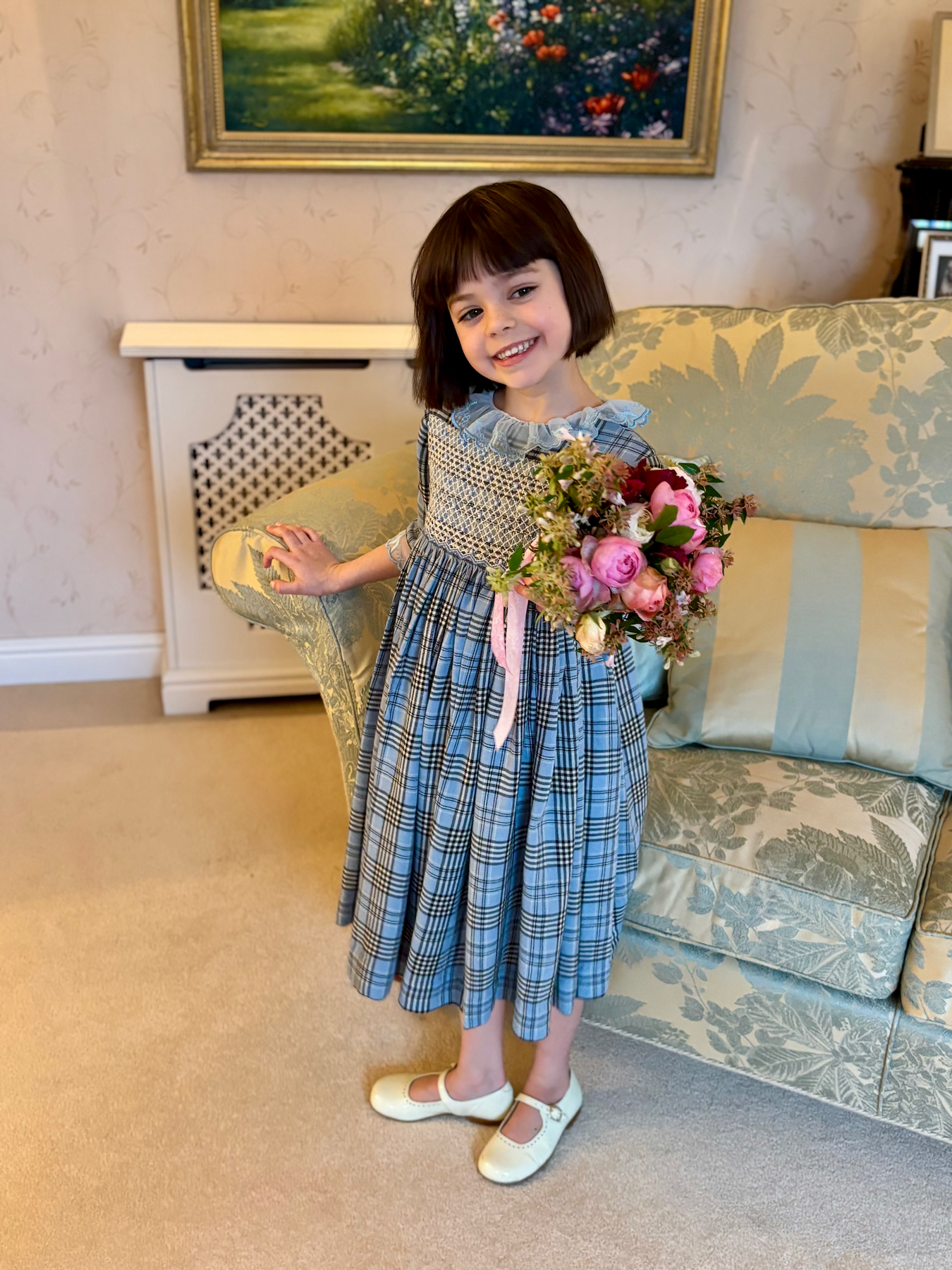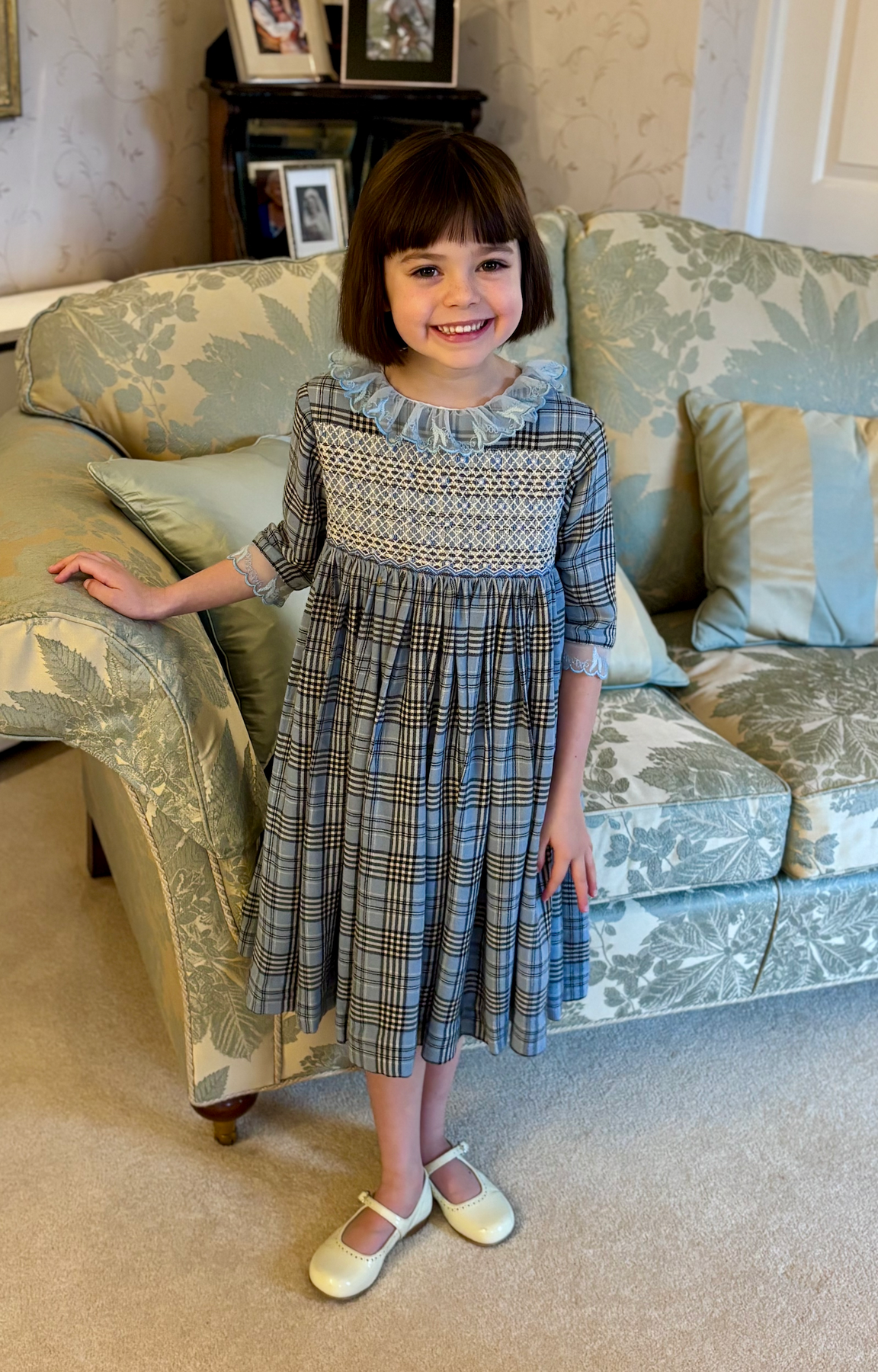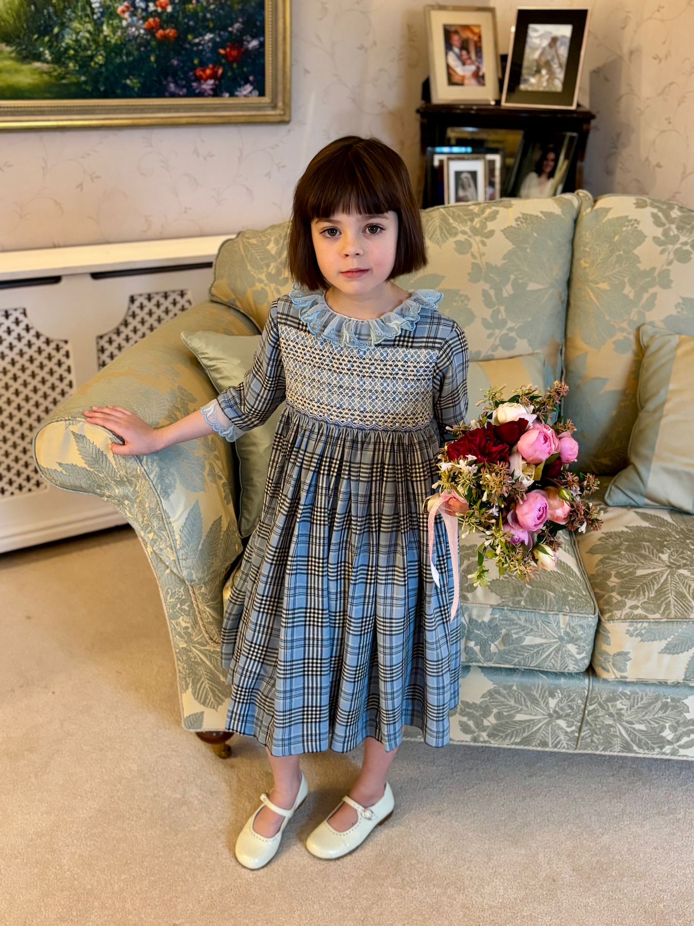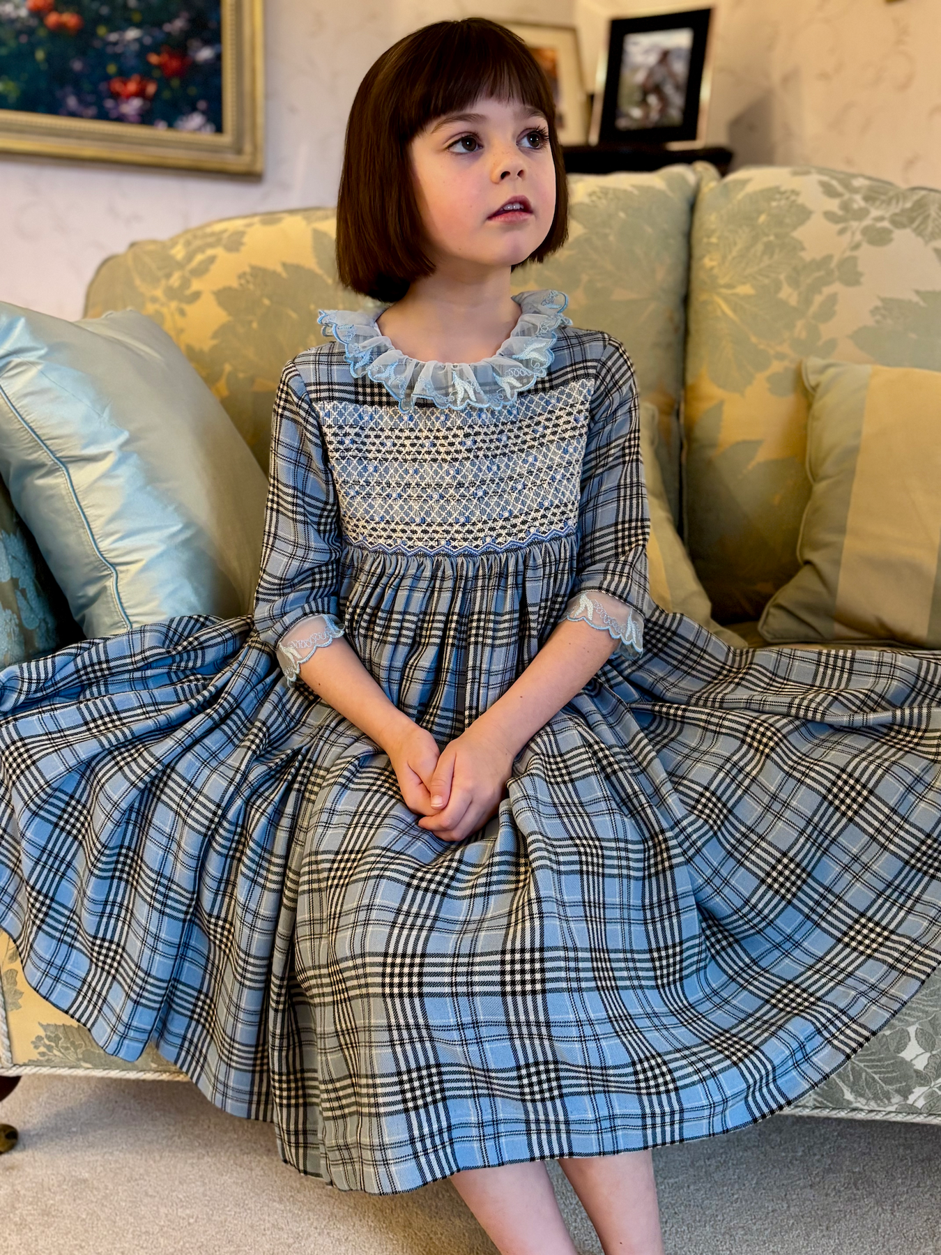 A celebration of contrasts, this captivating dress unites two seemingly disparate textile traditions into harmonious poetry. The sky blue and black tartan brings strength and heritage, its bold plaid evoking Scottish glens and moorland landscapes. Against this structured backdrop, delicate details emerge like wildflowers pushing through rocky terrain: an ethereal lace ruffle collar with scalloped edges, intricate smocking adorned with blue rosebuds, and graceful three-quarter sleeves finished with matching lace cuffs.