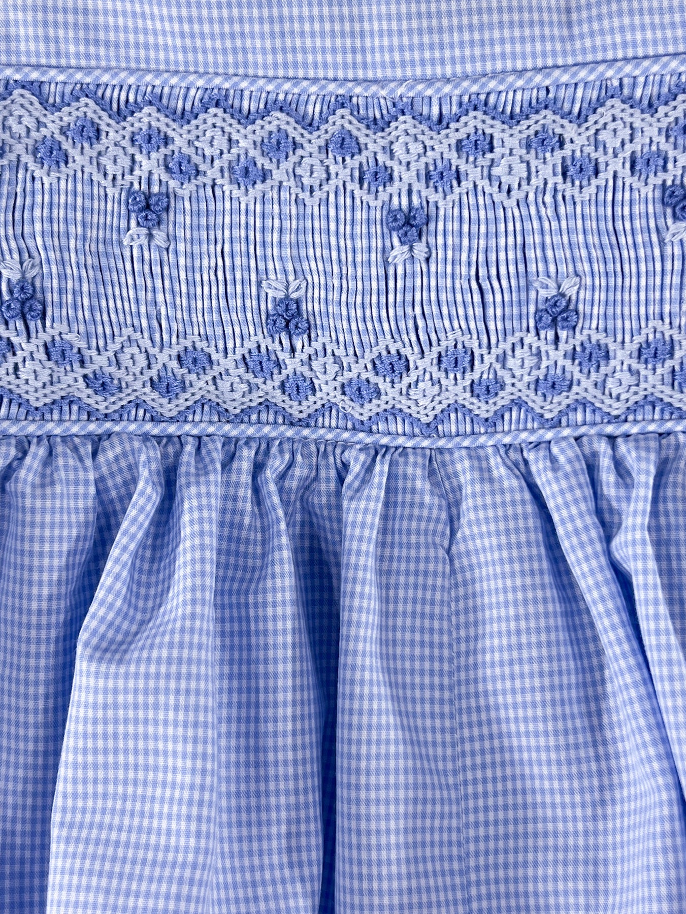 This blue bubble romper coordinates beautifully with its dress counterpart, featuring the same gentle mini checked blue and white satin cotton which recalls the freshness of early hours. The smocked chest band showcases intricate geometric patterns in blue tones, while the collar and short sleeves maintain the classic silhouette in miniature.