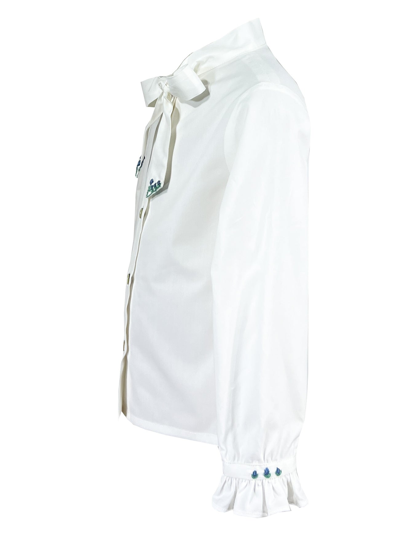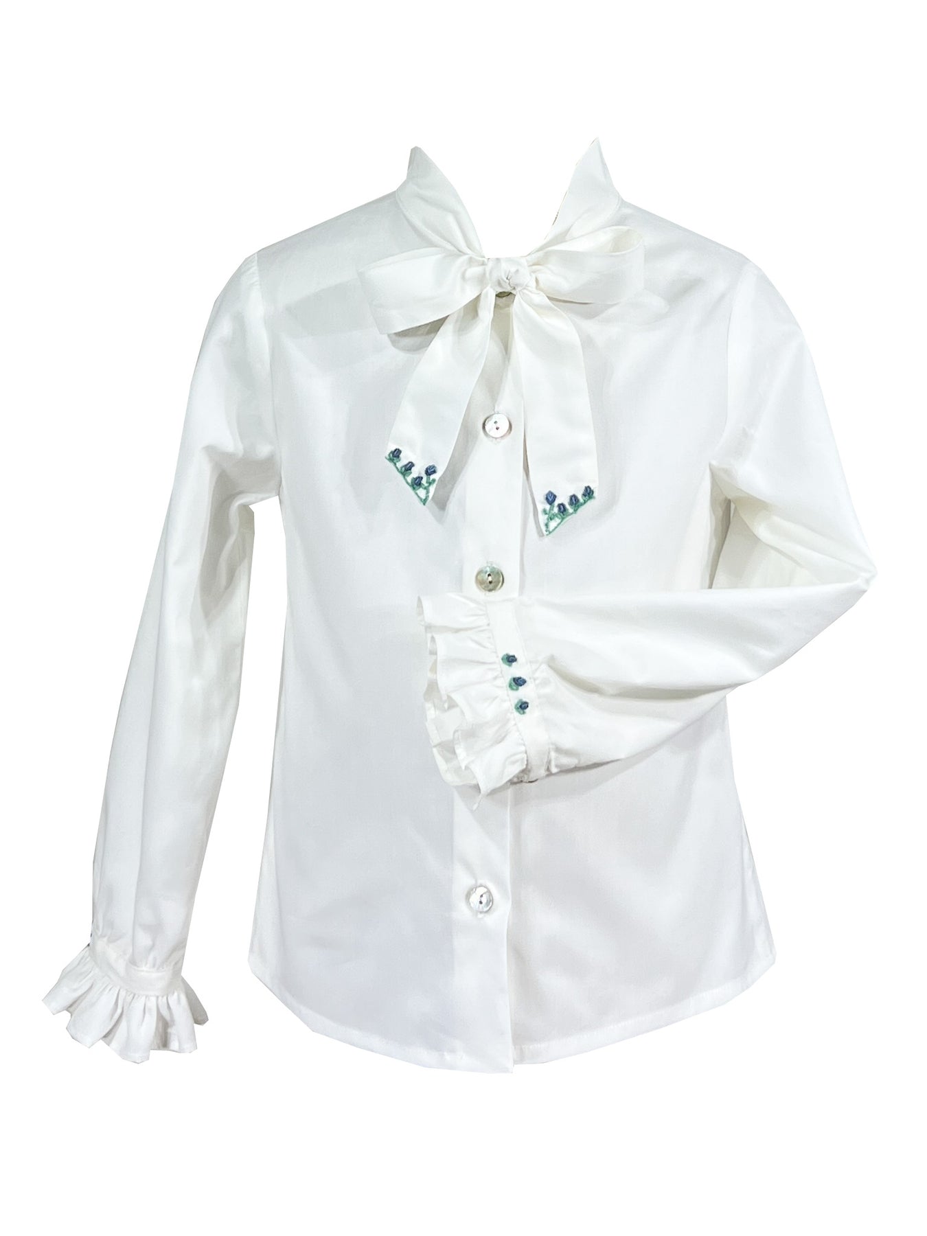 The pinafore is designed to be worn over a crisp white cotton blouse with a distinctive Lavallière bow collar, a detail that traces back to the elegance of Versailles. The collar is finished with embroidery in blue and mint that echoes the smocking, while long sleeves with ruffled cuffs feature matching embroidered details. Together, the pieces create a refined ensemble that balances formality with playful charm.
