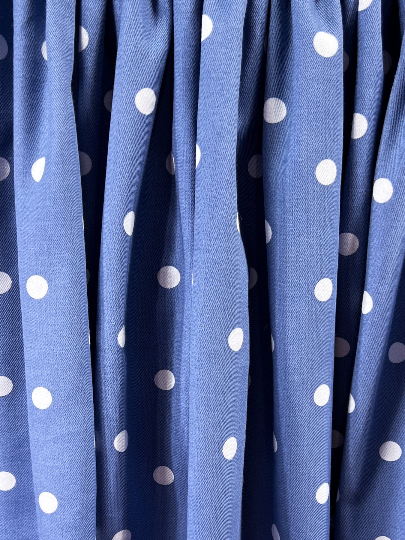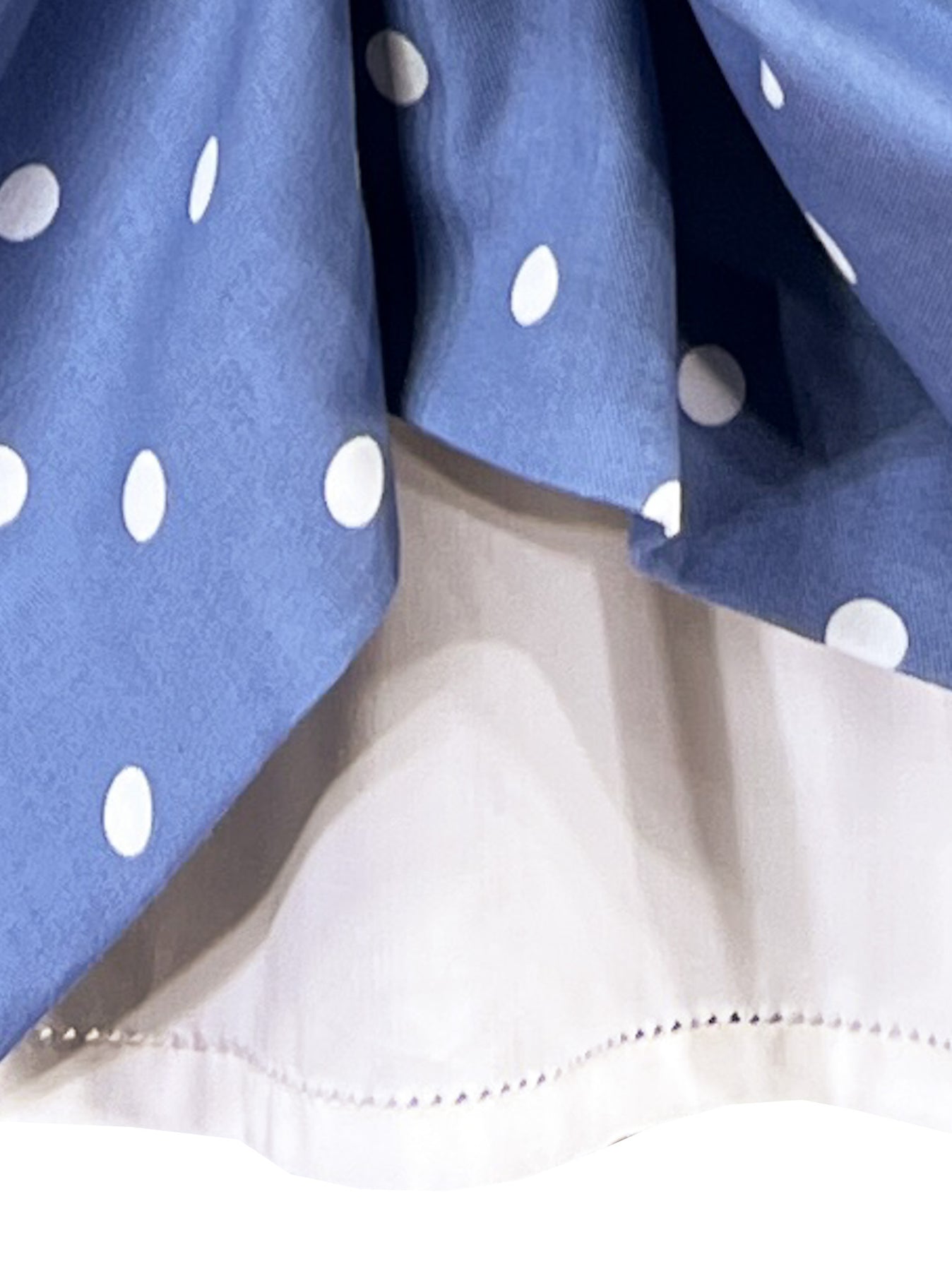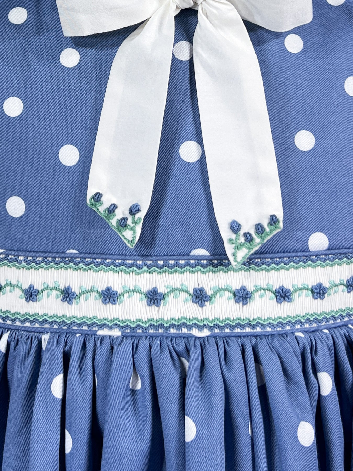 The Dot to Dot pinafore brings together heritage and whimsy in cornflower blue cotton scattered with white polka dots. The soft, supple fabric drapes beautifully, while the white smocked waistband features a delicate frieze of blue daisies with mint green foliage. Side belts and self covered buttons meticulously crafted from the white dots themselves blend in perfectly with the design.
