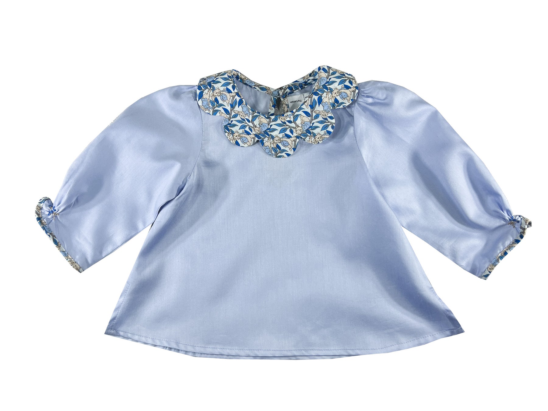 The Peter Rabbit style scallop baby girl blouse offers a charming interpretation of storybook dressing. The body is crafted in soft periwinkle blue, while the distinctive scallop petal collar and long sleeves piping showcase the enchanting Liberty print on white background, featuring gentle rabbits in soft beige with pale blue jackets nestled among delicate blue foliage.