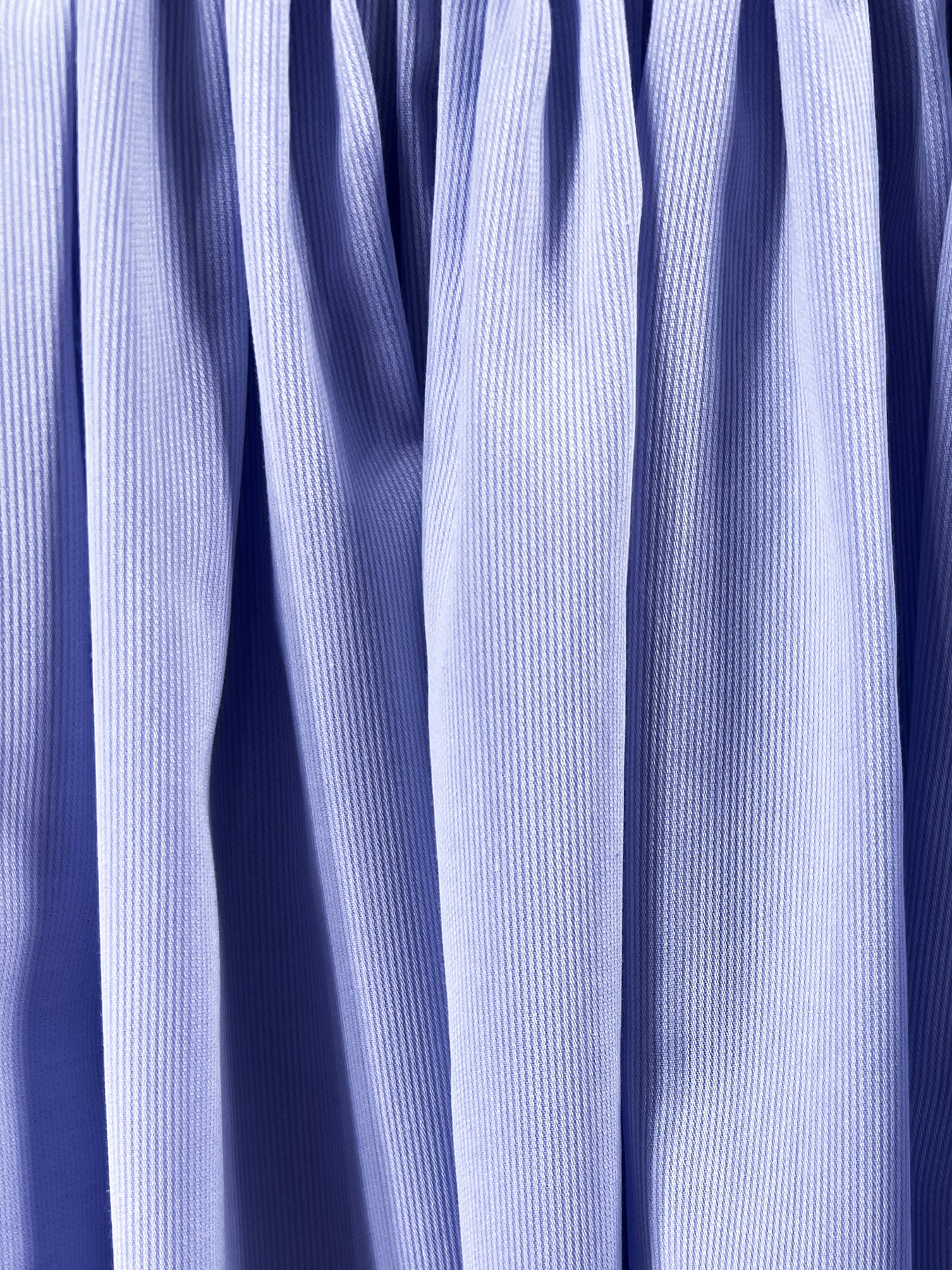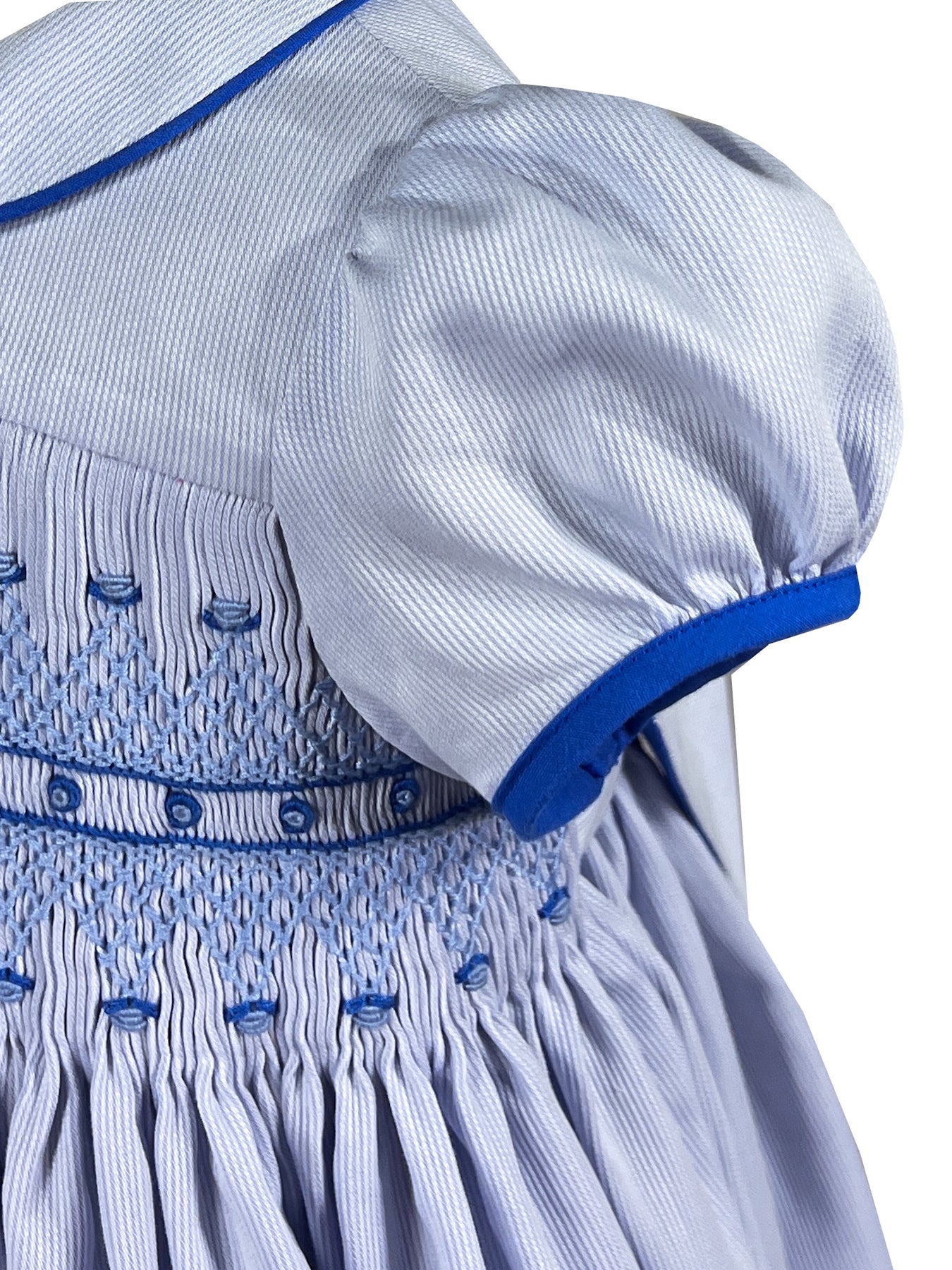 The Perpetual Blue dress is crafted in very fine blue and white thinly striped cotton that creates a subtle, sophisticated texture. The bodice features intricate geometric smocking that extends across the chest, showcasing the precision and artistry of traditional handwork. A Peter Pan collar trimmed with royal blue piping frames the neckline, while puffed sleeves echo the same crisp piping detail.