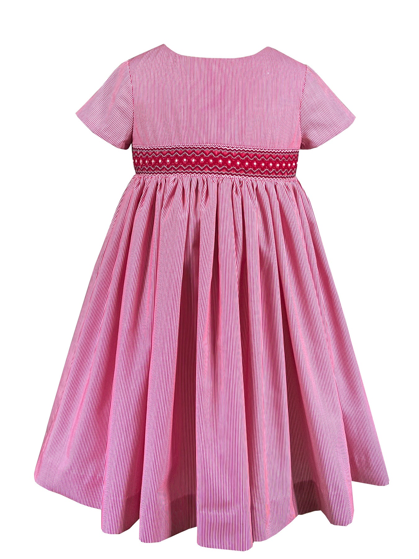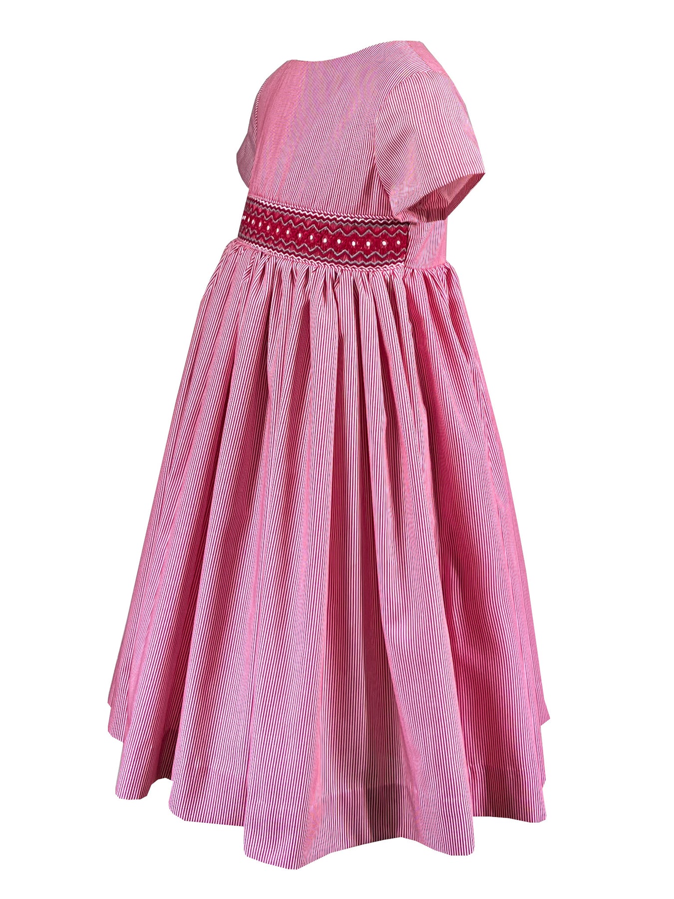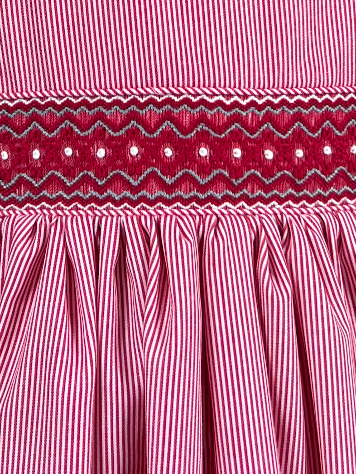 The Red Meridian dress draws its name from those defining lines that connect distant places, much like the stripes that traverse this dress. The handsmocked waistband is where the metamorphosis truly happens: traditional red transforms through subtle gradations of grey and white, proving that even the most classic stripe can be reimagined with artistry. This is heritage craftsmanship meeting modern sensibility, a piece for the collector who appreciates nuance within simplicity.