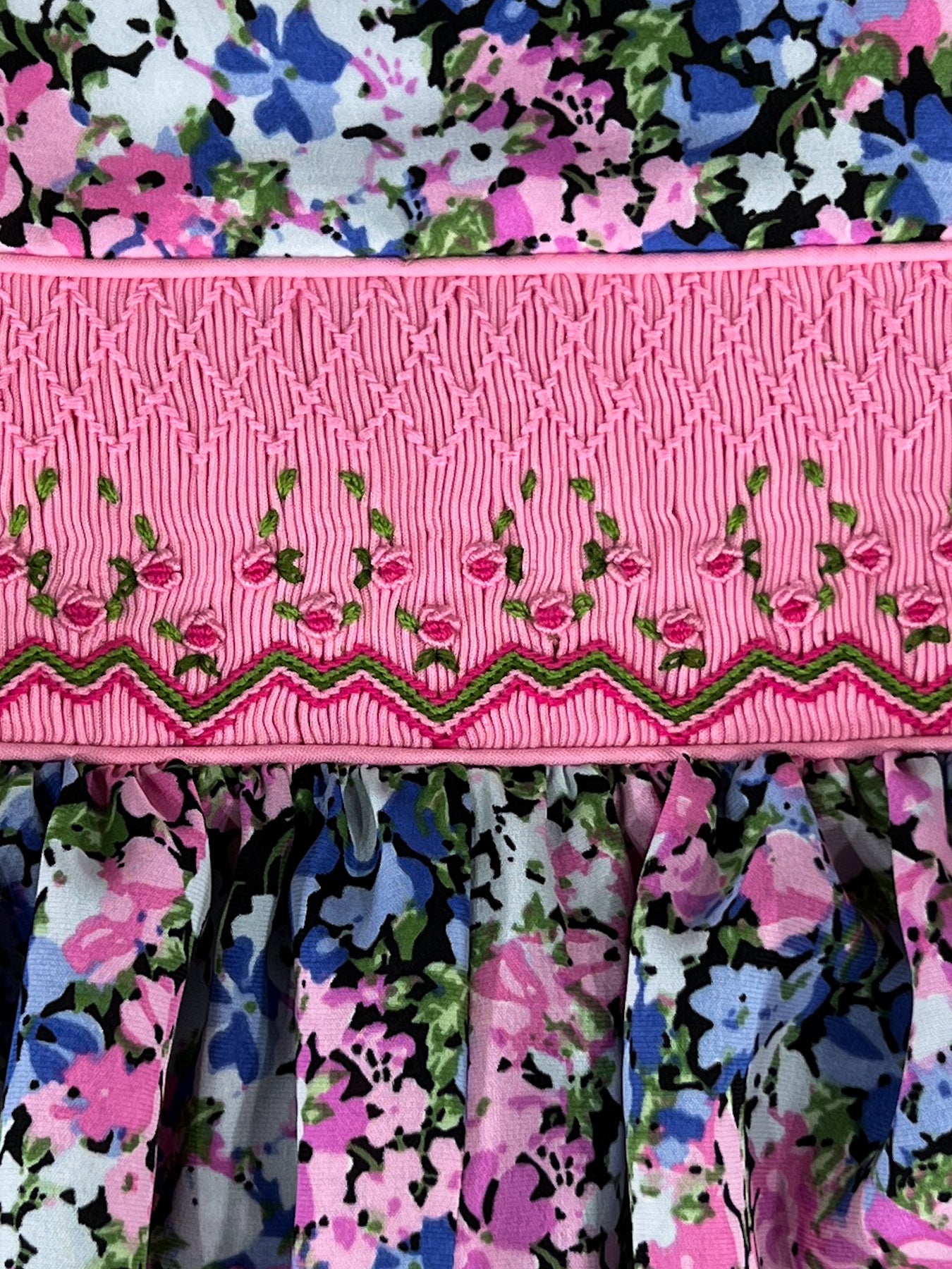The Thousand Blooms bubble captures the same spirit of joyful abundance as the matching dress. The smocked band in bright pink features an intricate diamond pattern adorned with delicate rick rack lines and miniature rosebuds. The rest of the silhouette features a profusion of tiny multi-colored blooms scattered across black fabric creating a garden of endless discovery, where pink, blue, white, and green flowers dance together in cheerful harmony.