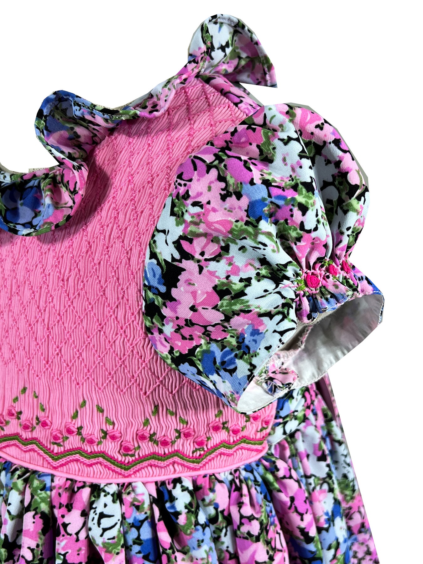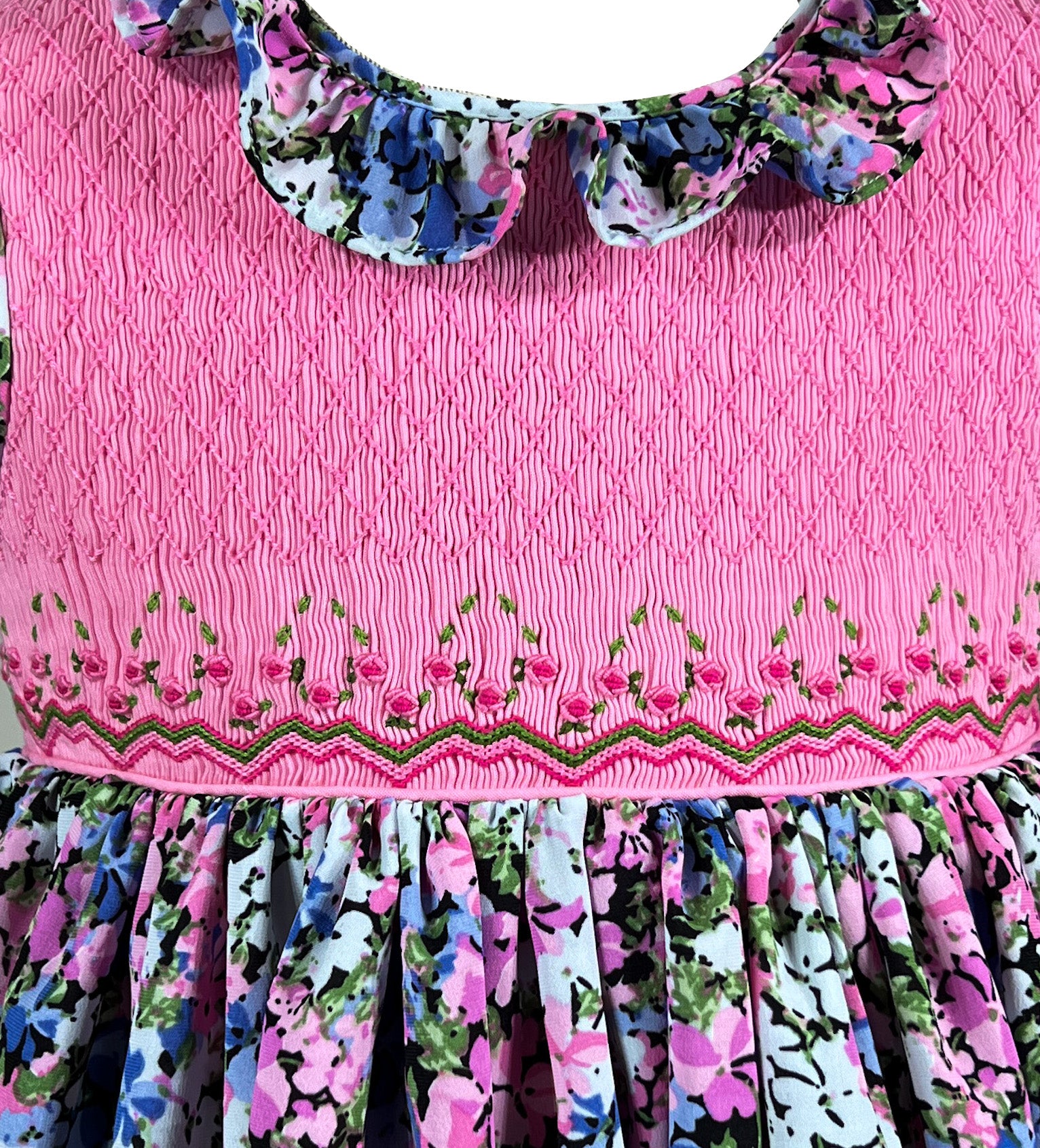 This dress celebrates nature's infinite variety. The fully smocked bodice in bright pink extends from neckline to shoulder, featuring an intricate diamond pattern adorned with delicate rick rack lines and miniature florals. The rest of the silhouette features a profusion of tiny multi-colored blooms scattered across black fabric creating a garden of endless discovery, where pink, blue, white, and green flowers dance together in cheerful harmony.