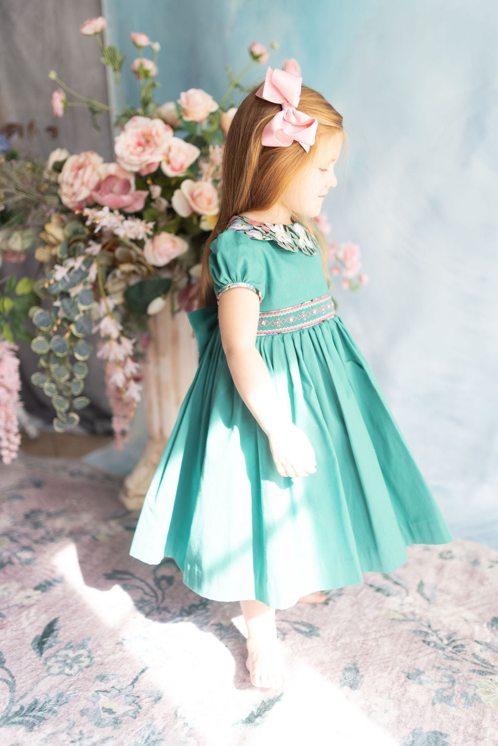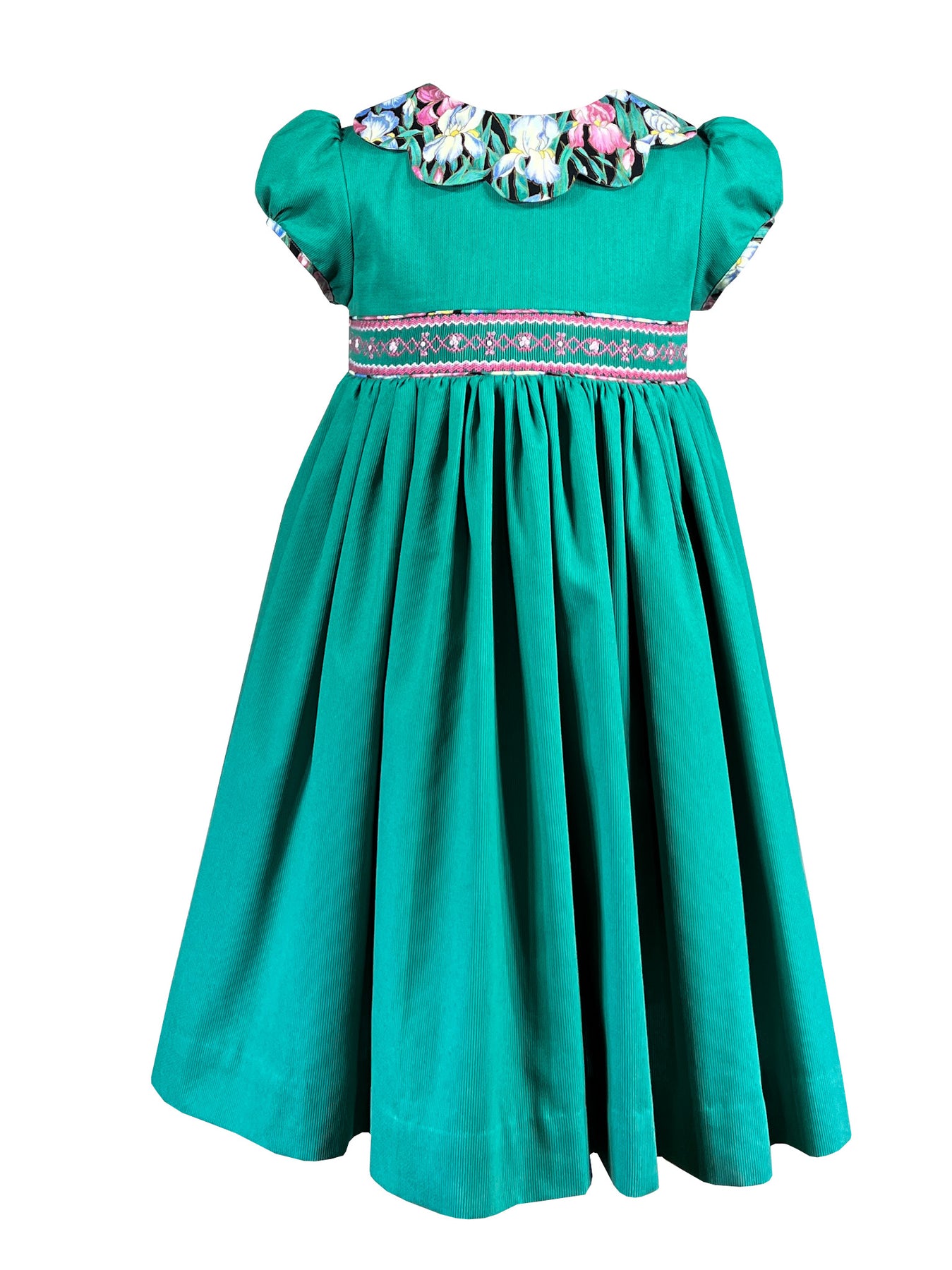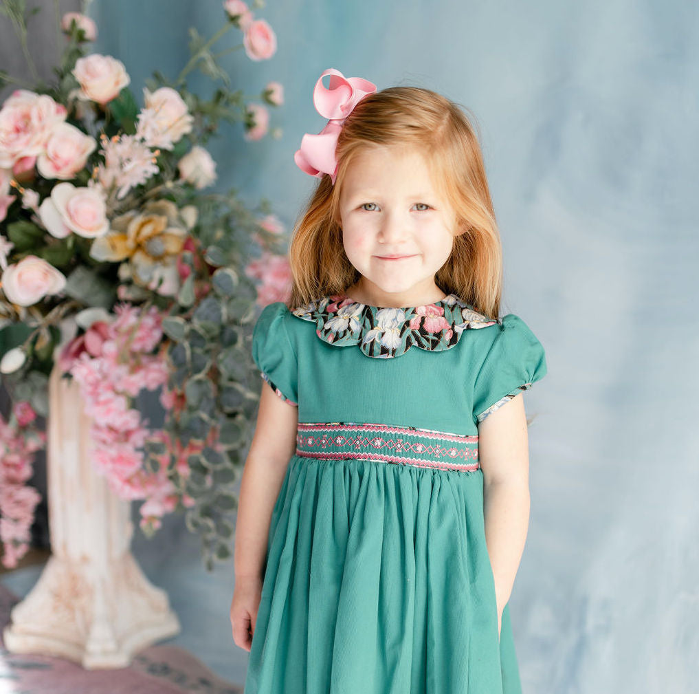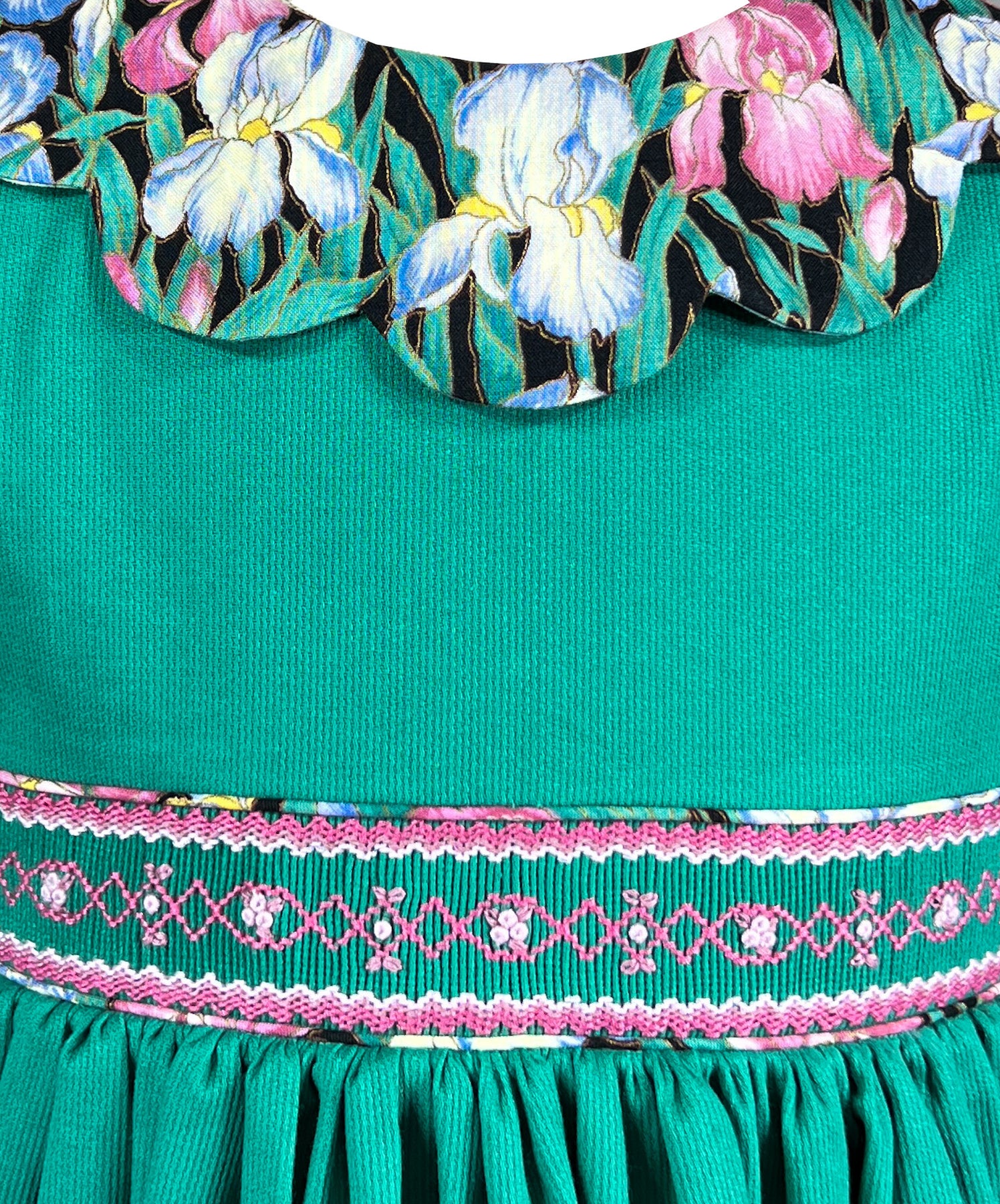 The bodice is adorned with meticulous handsmocking at the waistband, where perfectly matched thread tones echo the subtle hues within the floral print of the piping above and below.