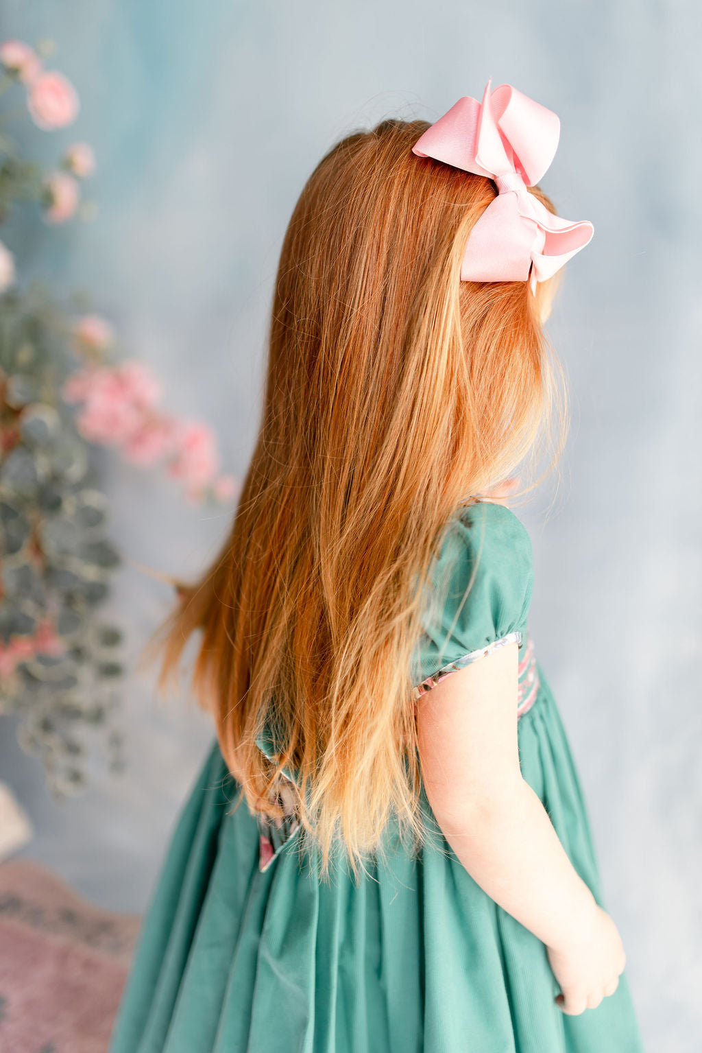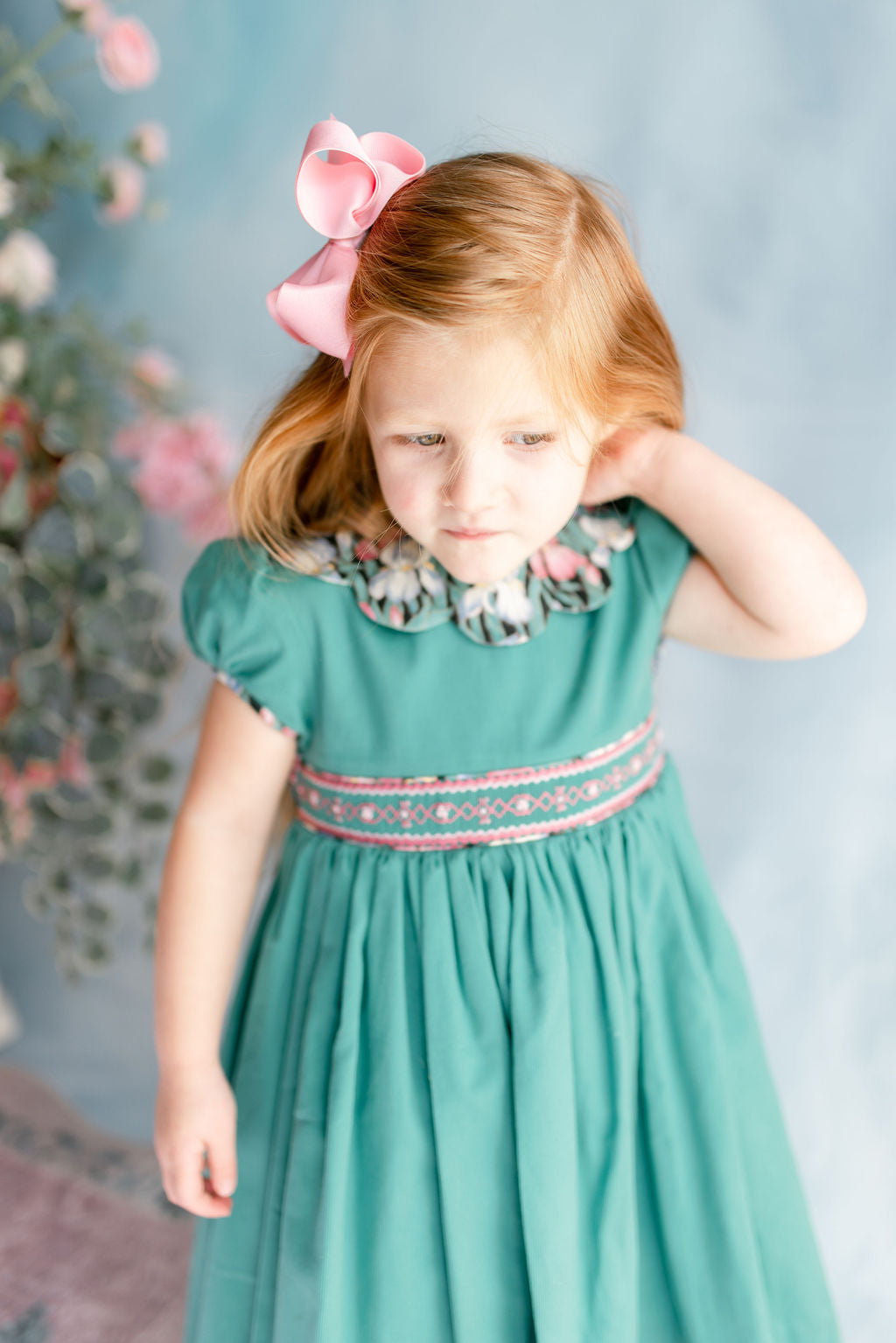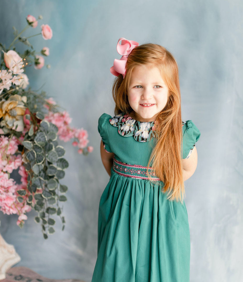 The bodice is adorned with meticulous handsmocking at the waistband, where perfectly matched thread tones echo the subtle hues within the floral print of the piping above and below.