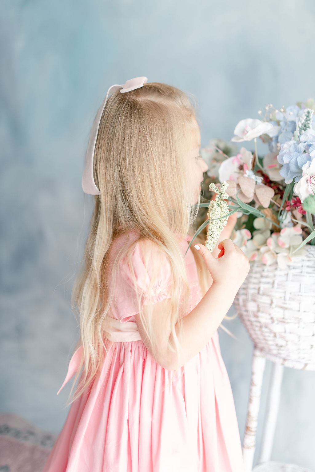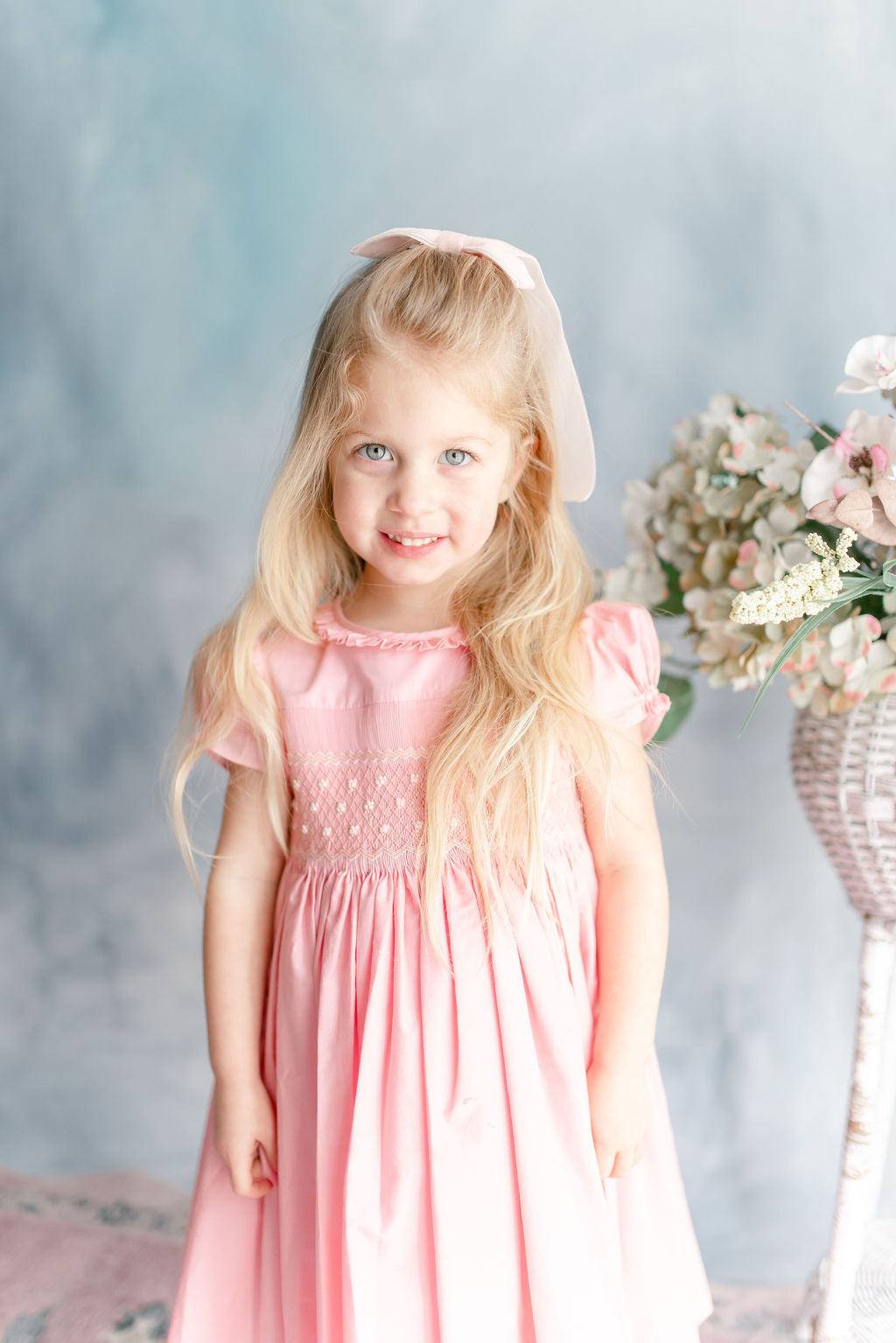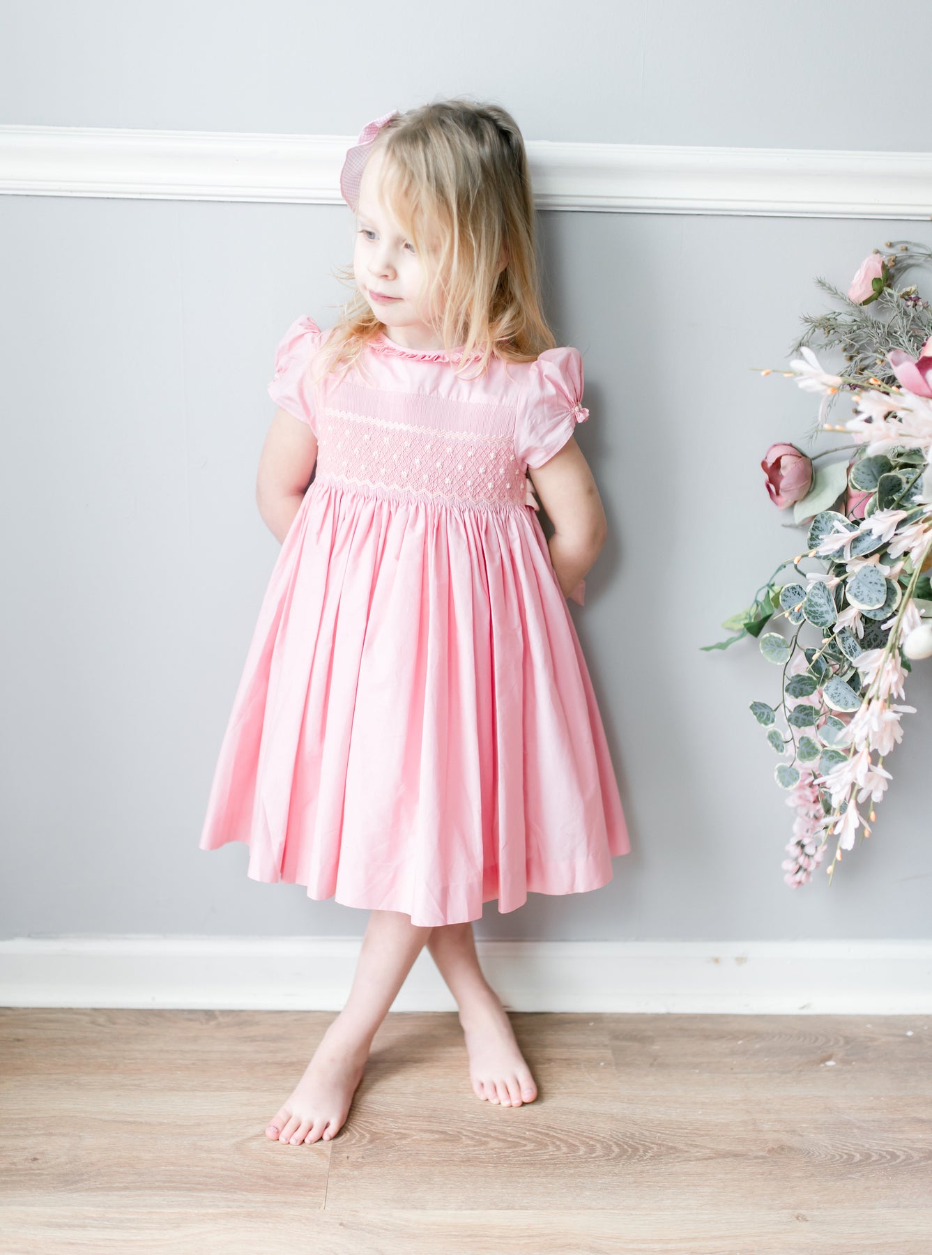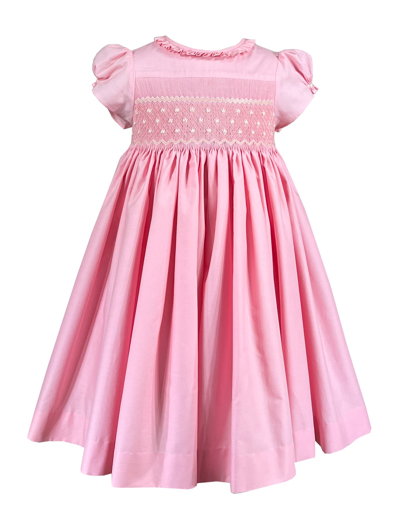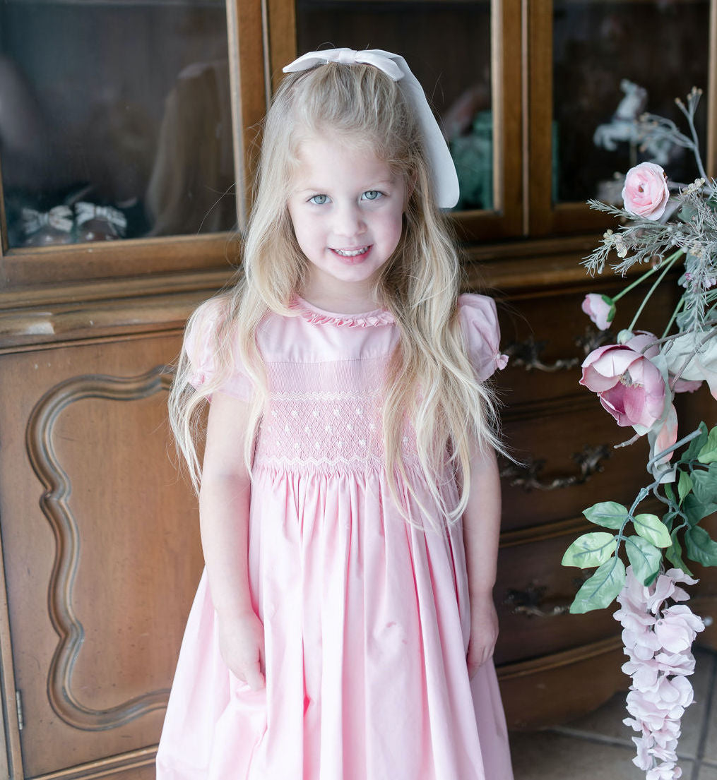 The signature puffed sleeves are gathered at the cuffs with delicate rosebud embroideries, a charming detail that speaks to careful craftsmanship. A frilled pleated collar frames the neckline with romantic flair, while the pink and cream smocked bodice creates subtle texture. A butterfly bow sash at the back and self covered buttons complete this enchanting piece.