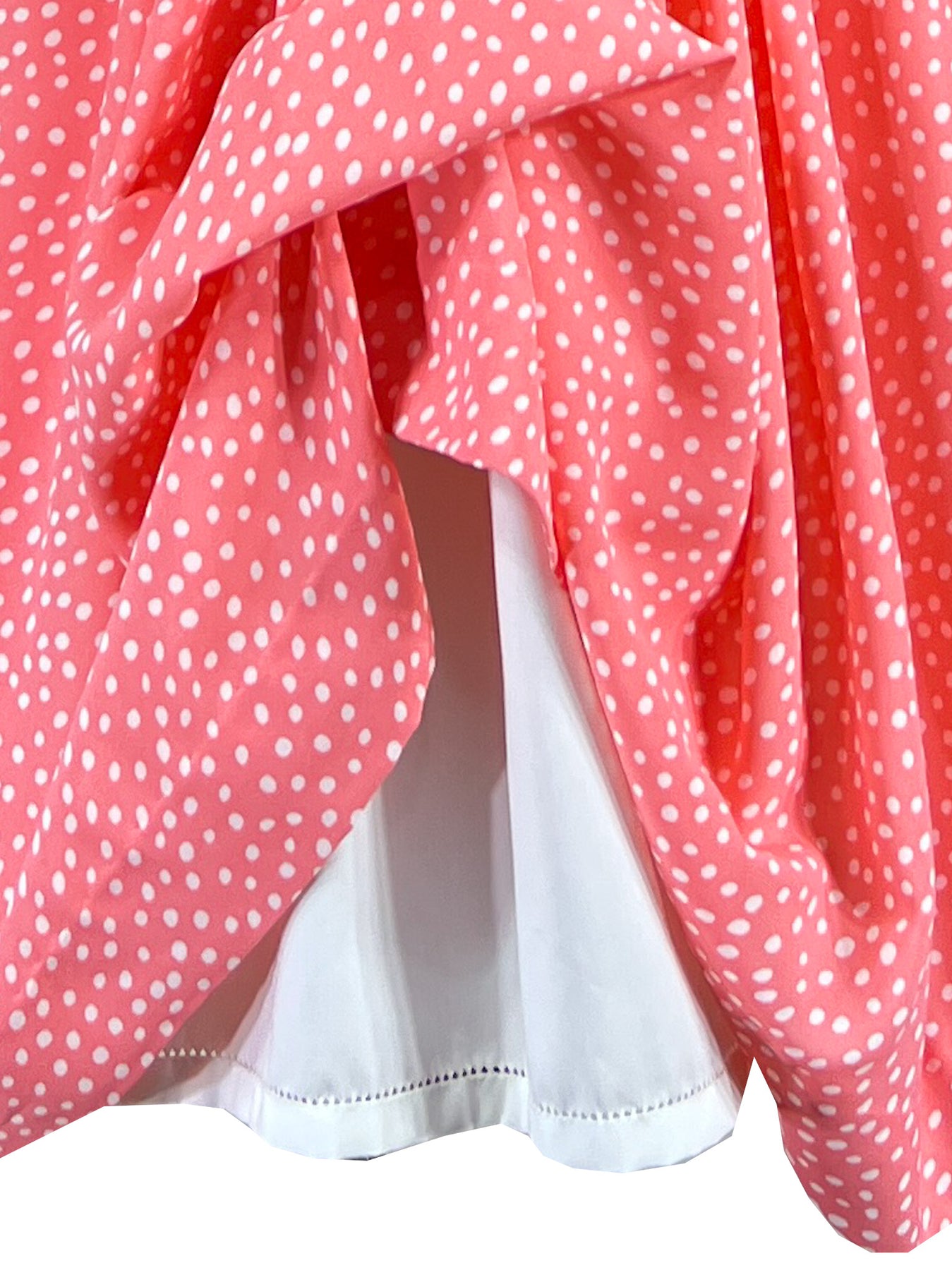 There is something irresistibly cheerful about a polka dot. This dress revisits this timeless motif with fresh energy, where coral meets white in perfect rhythm. It embodies the confluence of precision and play, proving that geometric simplicity can be just as enchanting as elaborate florals. It is the collector's piece for those who appreciate joy in its purest form.