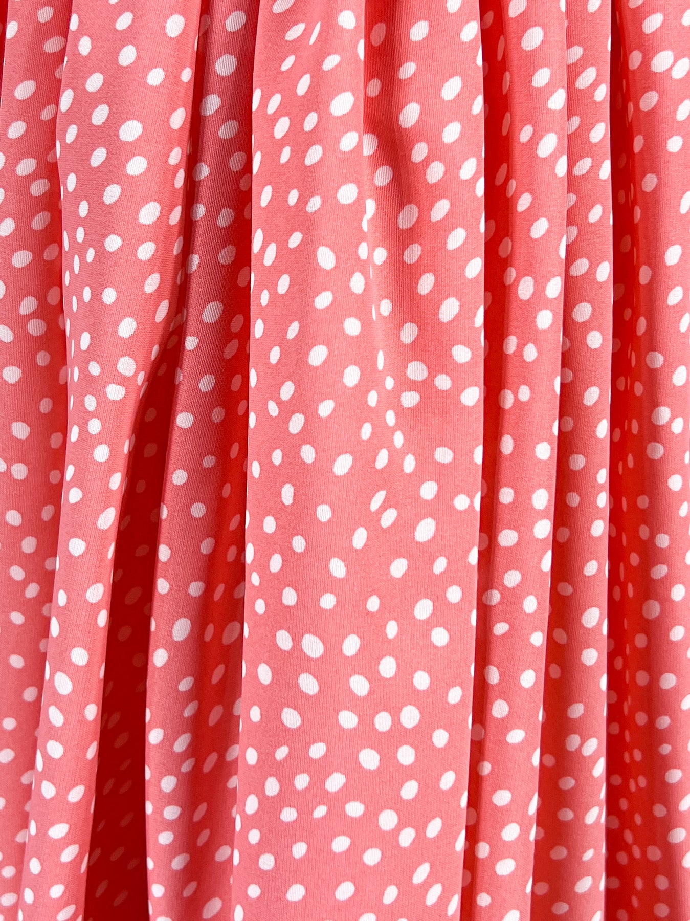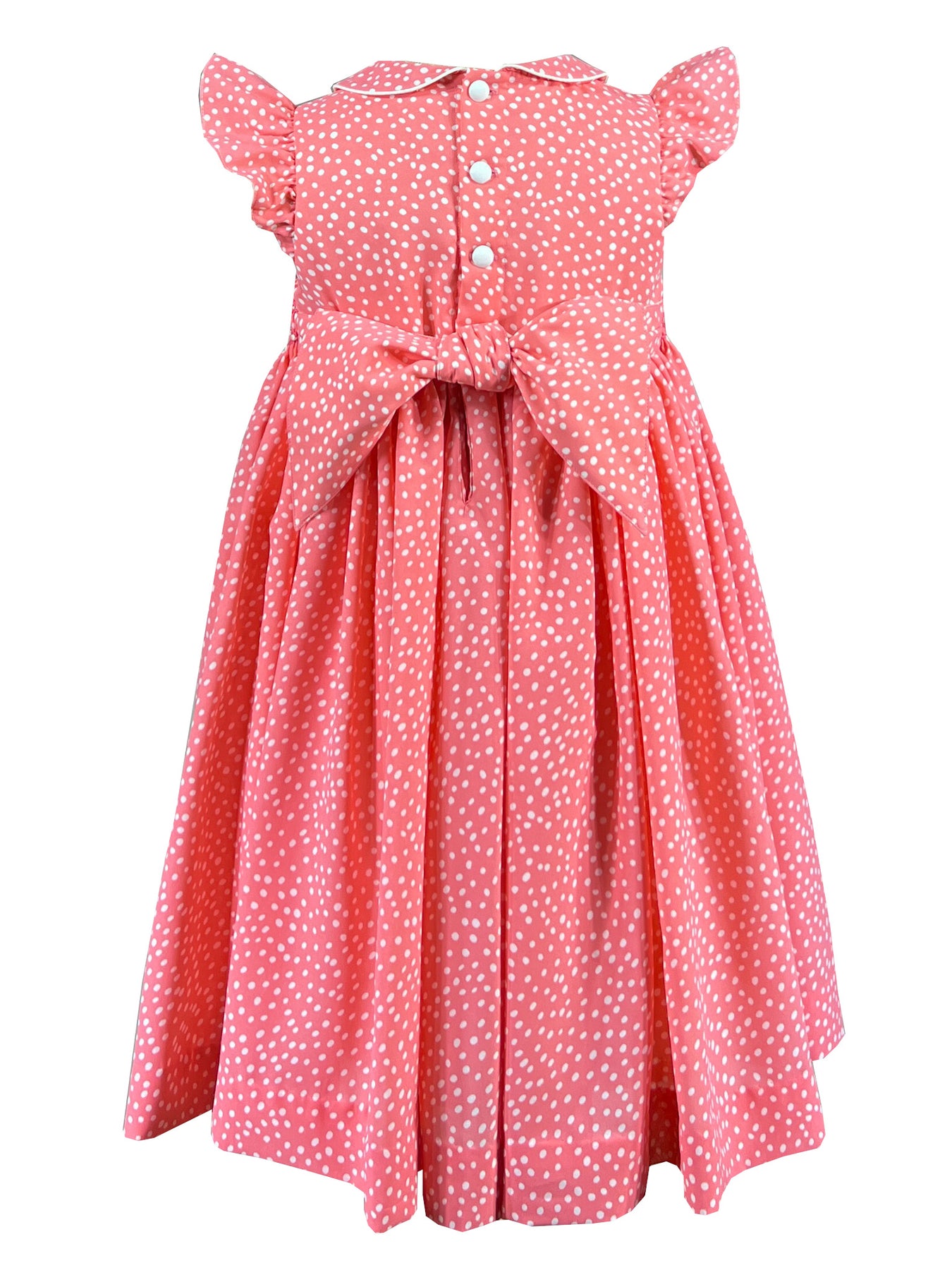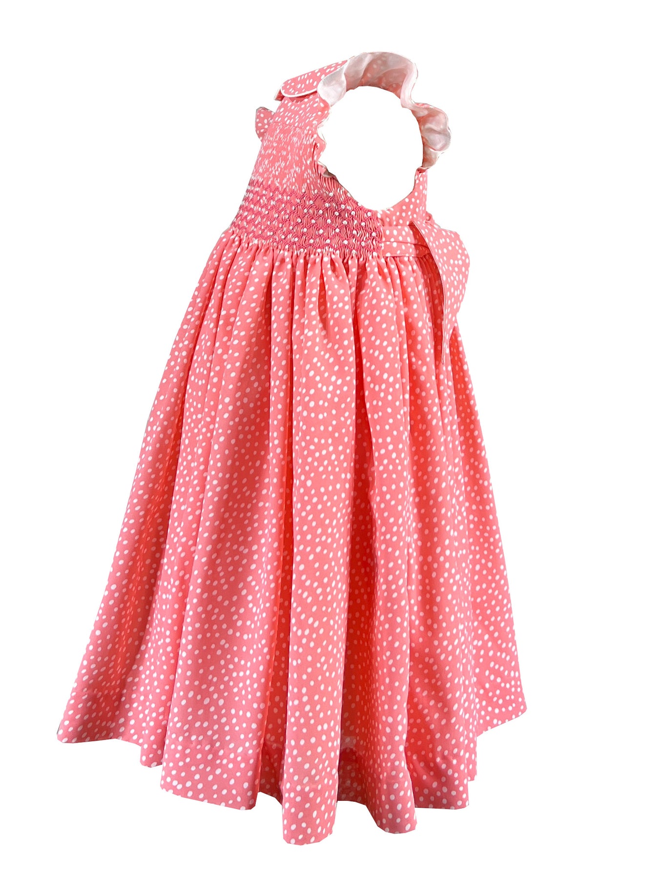 Joyful and spirited, the Spot On dress is rendered in soft, flowy fabric. Its coral background is scattered with white polka dots. The smocked bodice features a geometric pattern punctuated by white dots at each intersection, creating a playful interplay between structure and whimsy.