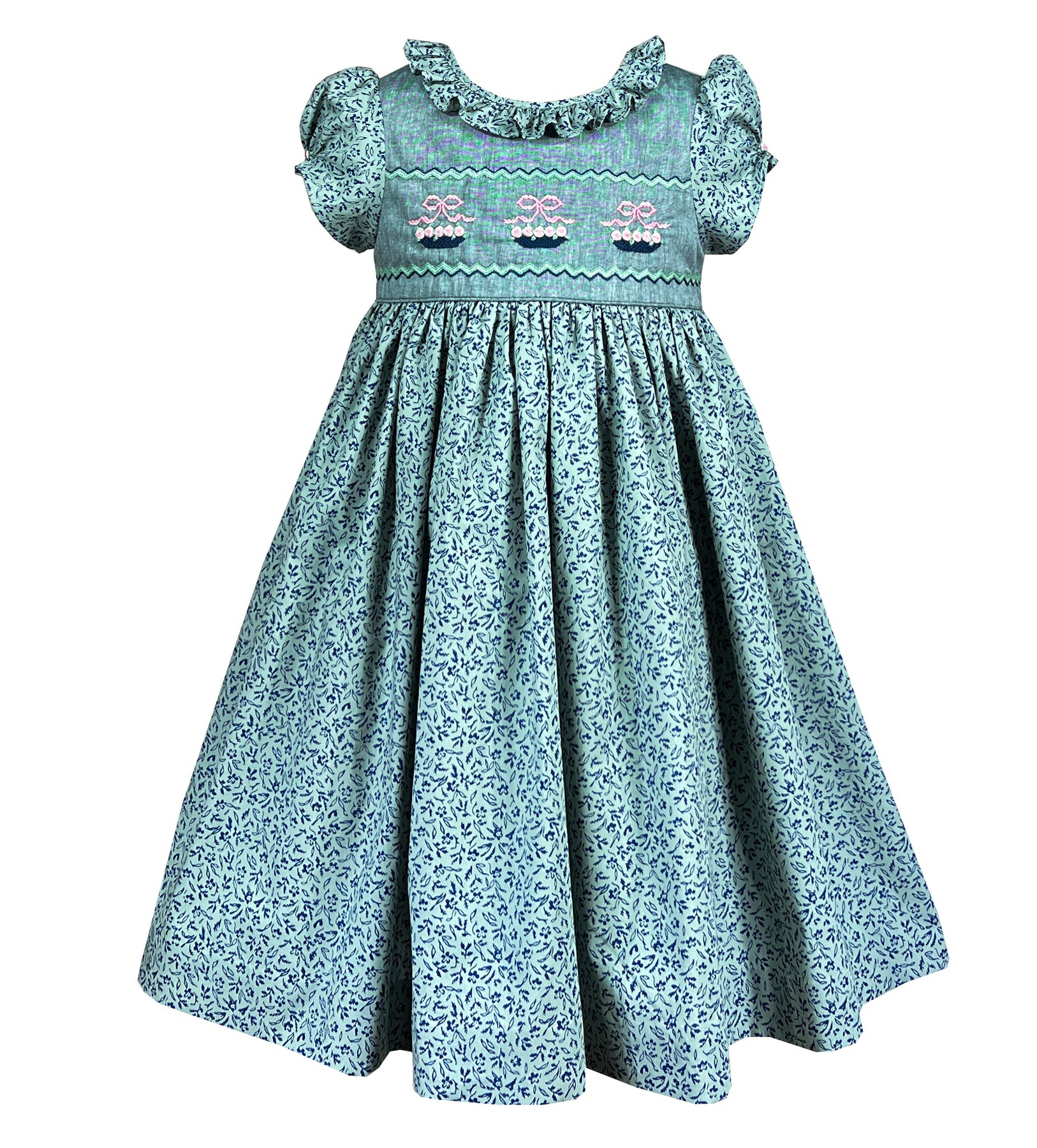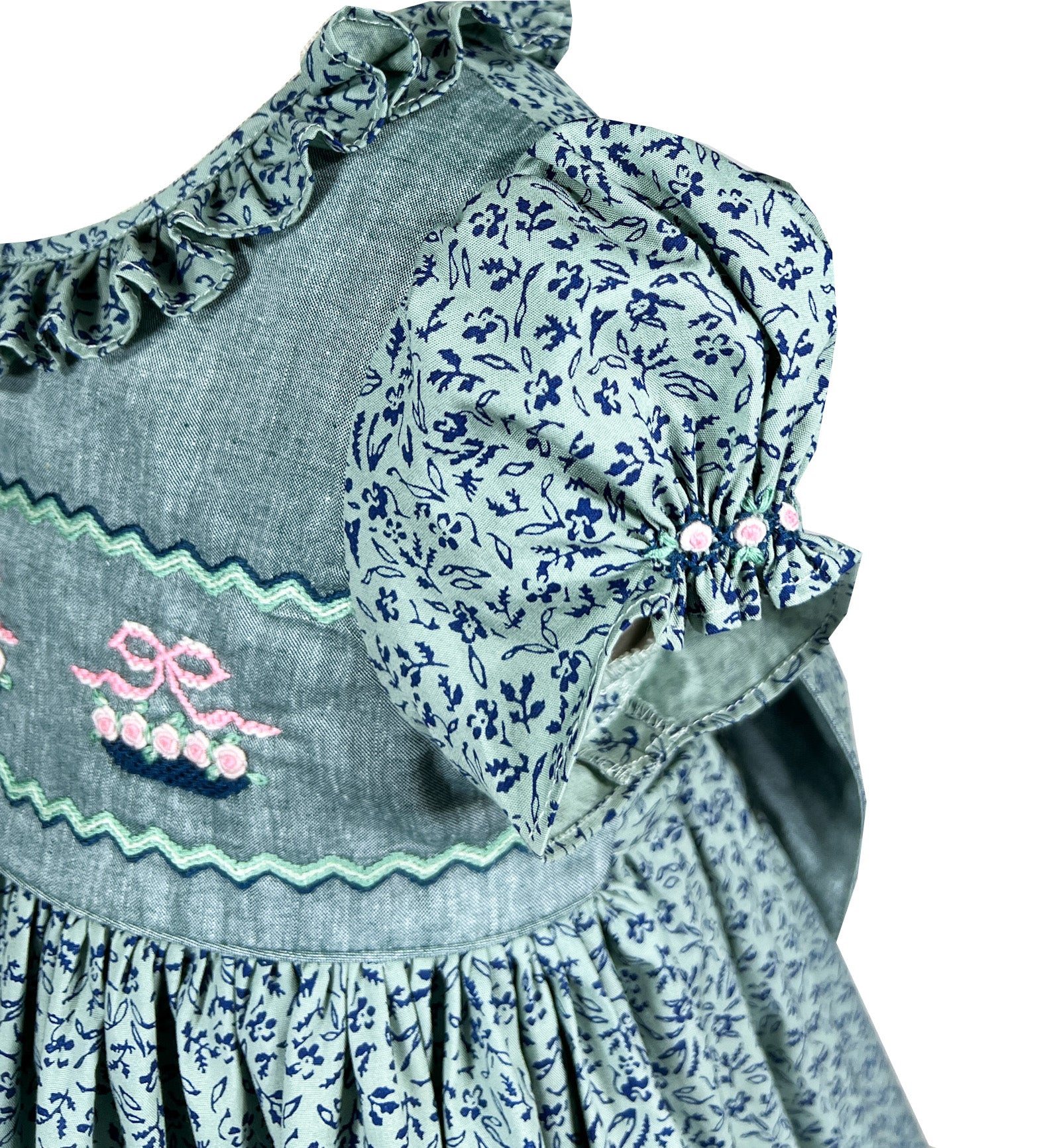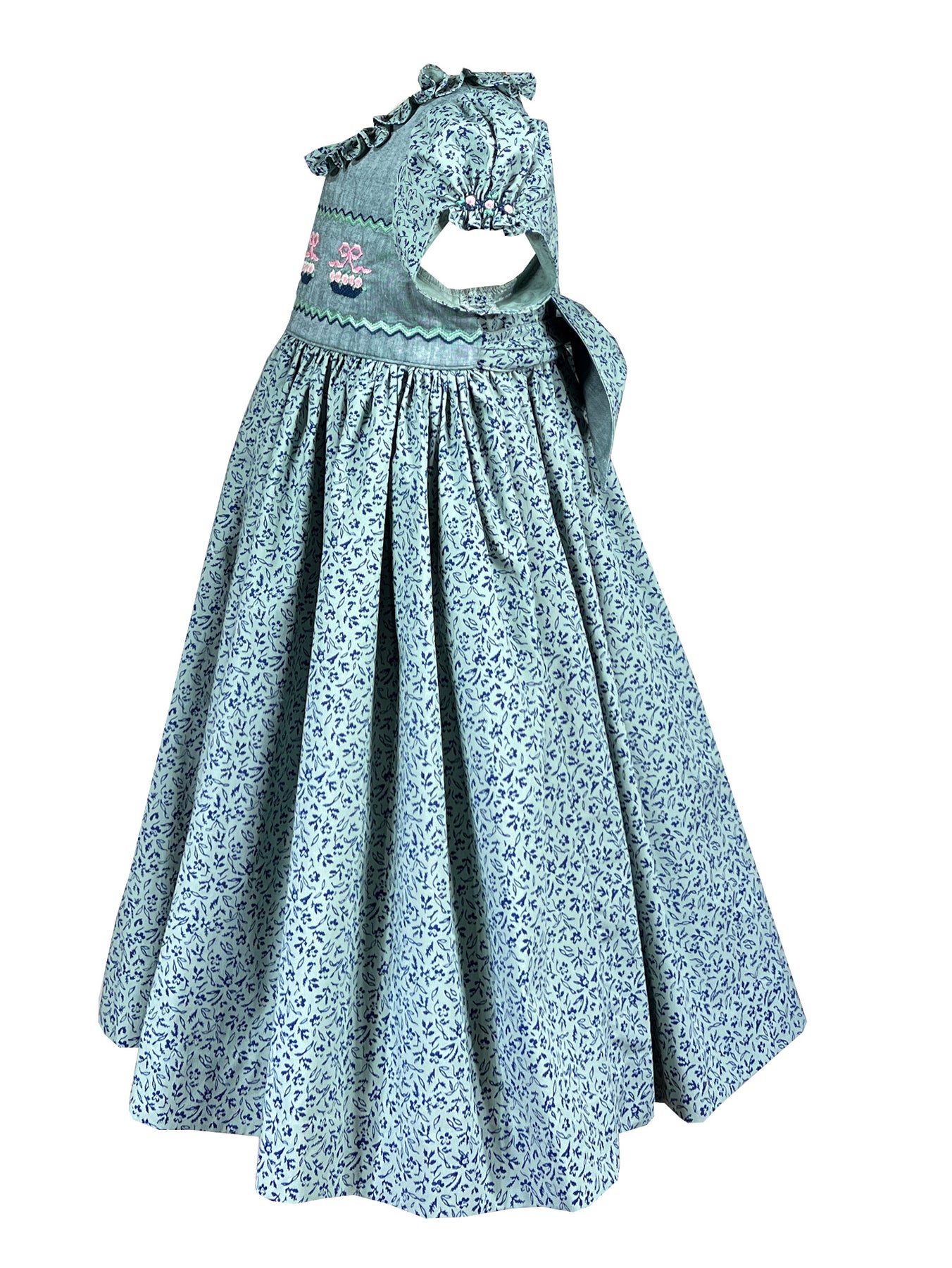 The dress is crafted in a romantic floral print featuring tiny navy flowers and foliage upon the green backdrop. The front chest is made in a solid fabric coordinating beautifully and showcasing exquisite hand made embroideries. Flower baskets in pink and navy tied with a delicate bow and filled with blooming roses and rick rack patterns adorn the bodice. The attention to detail is remarqable, with each flower and leaf carefully stitched to create portable gardens across the chest.