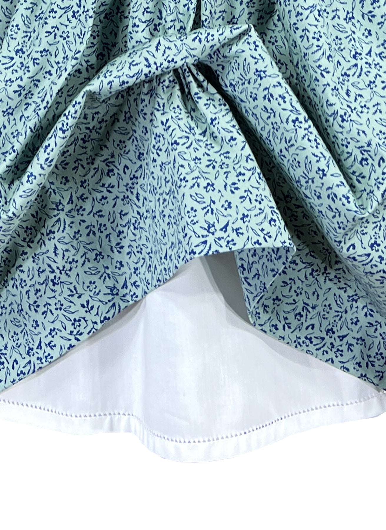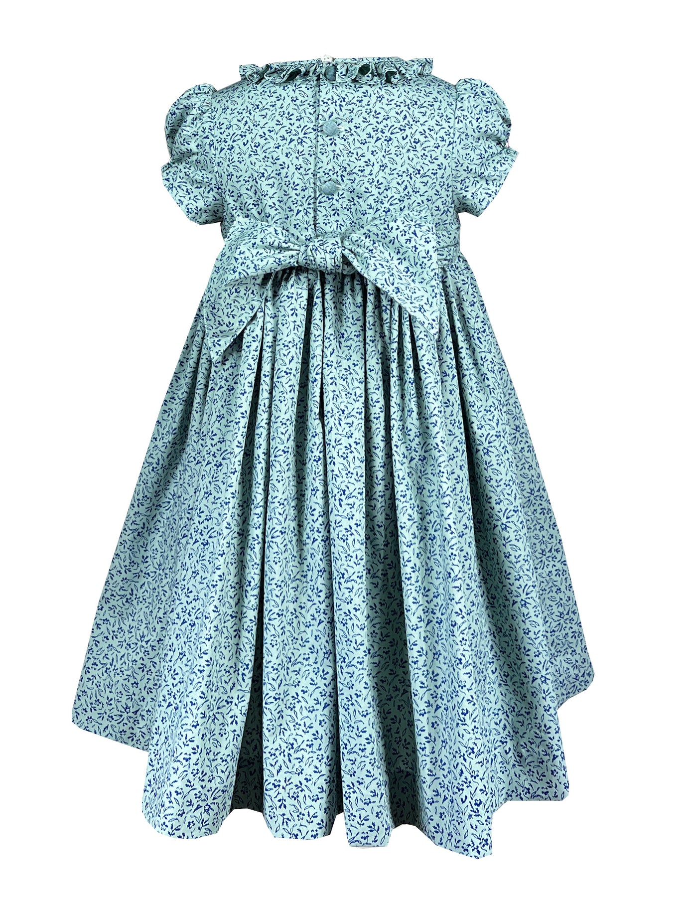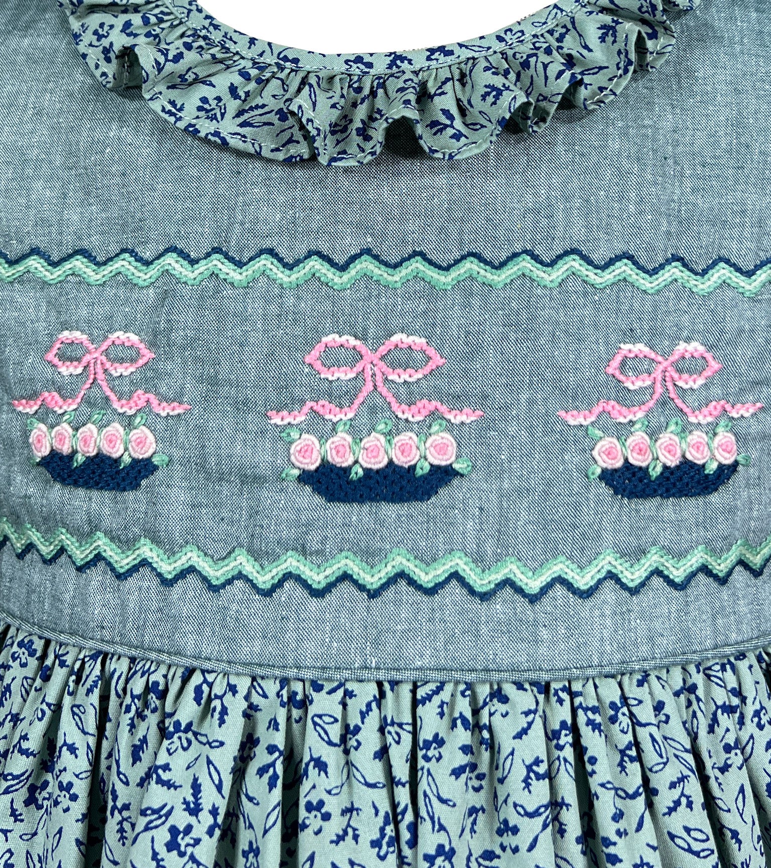 The dress is crafted in a romantic floral print featuring tiny navy flowers and foliage upon the green backdrop. The front chest is made in a solid fabric coordinating beautifully and showcasing exquisite hand made embroideries. Flower baskets in pink and navy tied with a delicate bow and filled with blooming roses and rick rack patterns adorn the bodice. The attention to detail is remarqable, with each flower and leaf carefully stitched to create portable gardens across the chest.