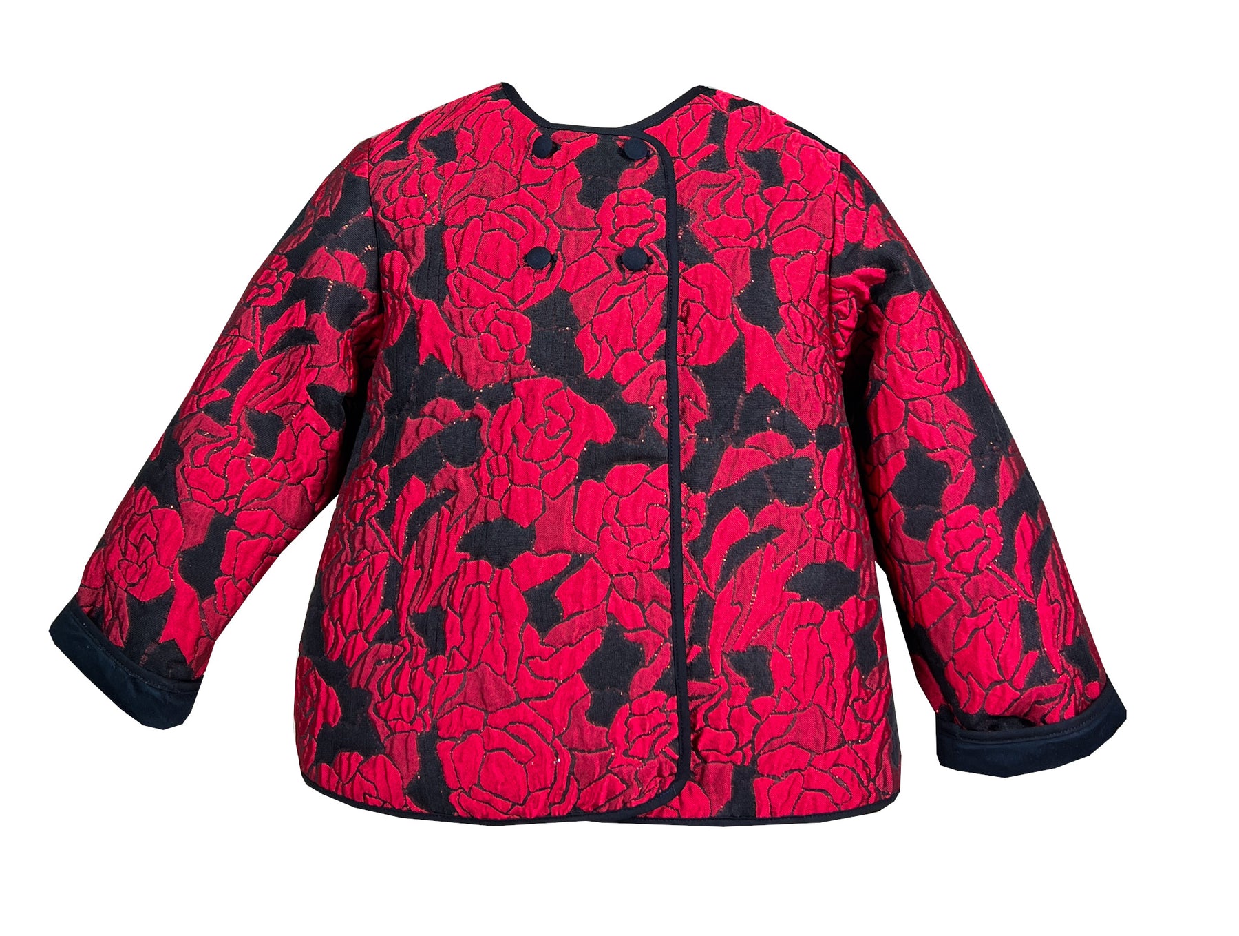 A statement of theatrical elegance, the Rose Royale jacket transforms outerwear into art. Bold crimson roses bloom in luxurious relief against a deep black background, creating a sophisticated floral tapestry that captures attention and admiration. The quilted jacquard fabric features raised rose patterns that add beautiful dimension and texture. Its subtle glittery threads add a discreet glow.
