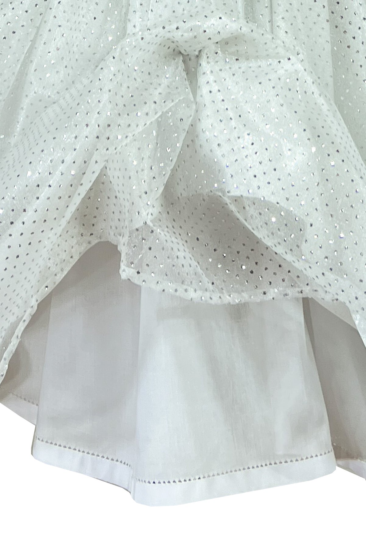 The full gathered skirt crafted in sheer silver polka dot organza and lined with white cotton creates the perfect silhouette for twirling like a princess. Self covered buttons fasten down the back.