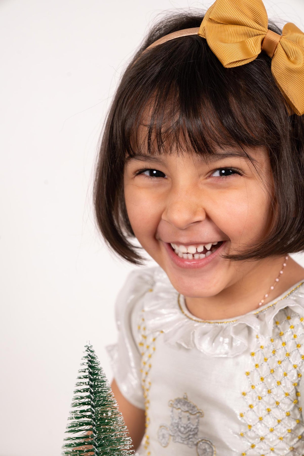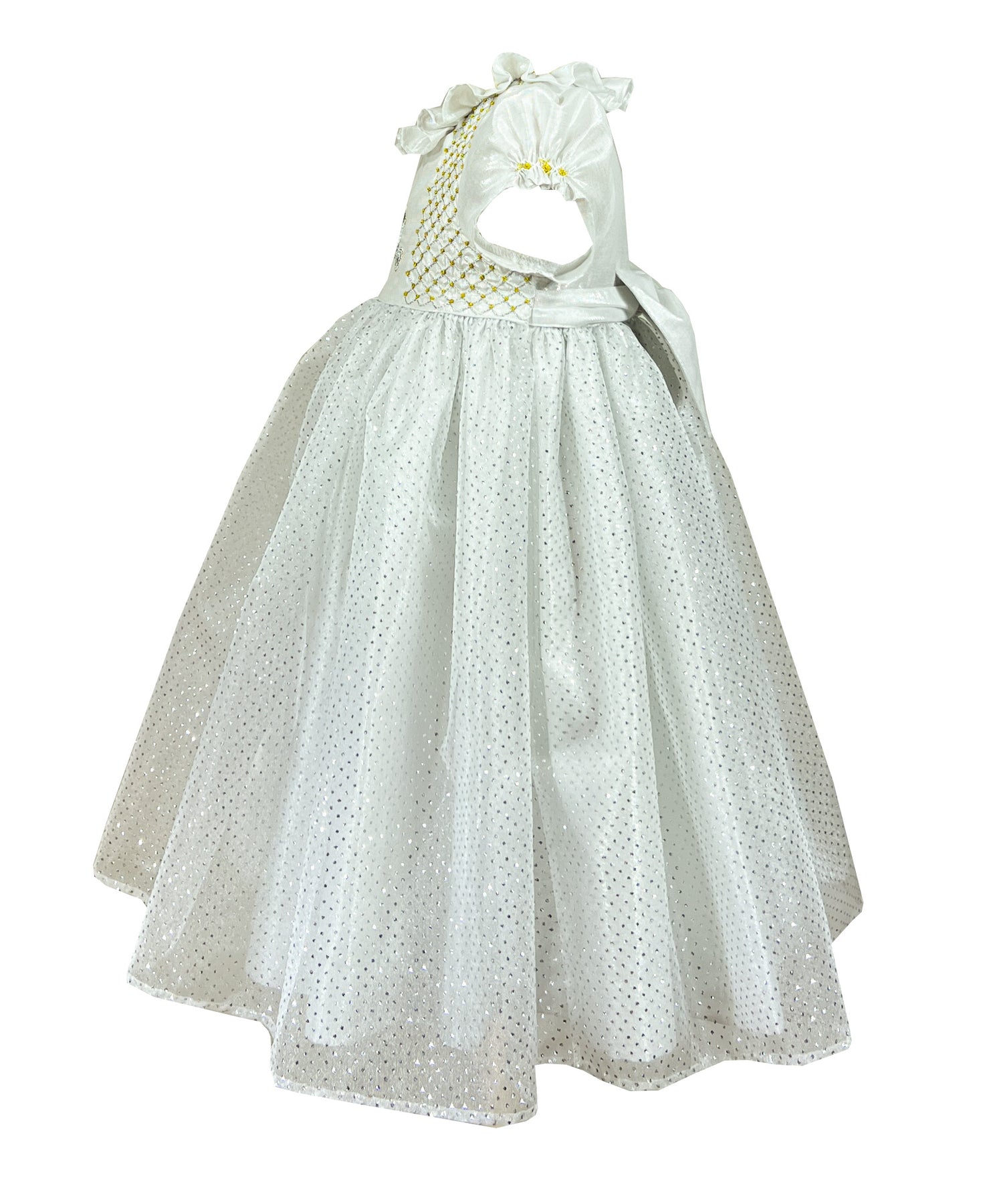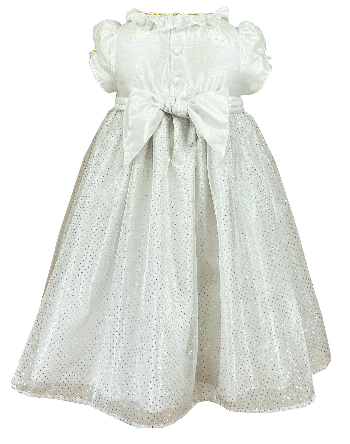 Its bodice, sleeves and butterfly bow sash are crafted in white cotton with subtle silver thread inserts creating a discreet, almost magical glow.
