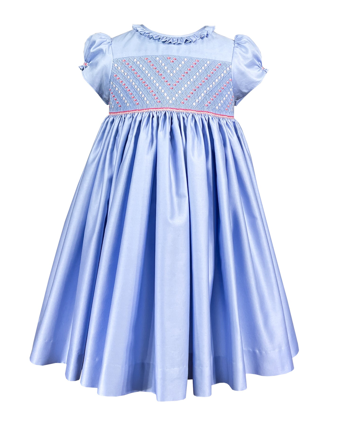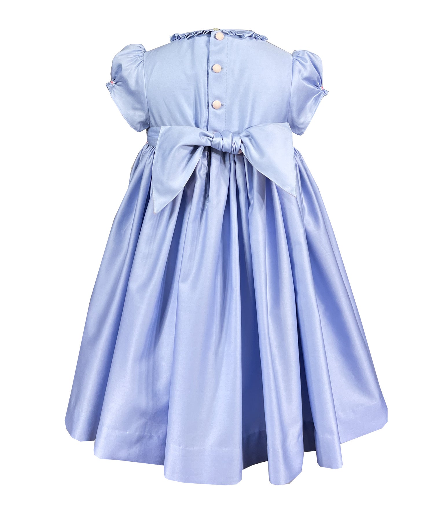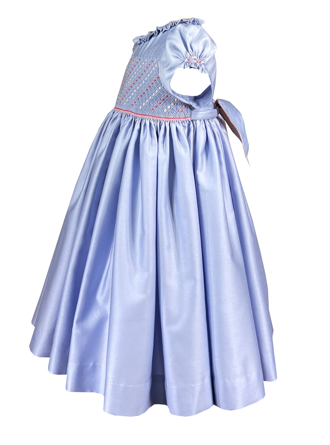 Our signature frilled pleated collar and puffed sleeves gathered at the cuffs add a charming feminine touch. The full gathered skirt flows from the hand-smocked bodice and drapes beautifully. Self covered buttons fasten down the back and a gorgeous butterfly wing shaped sash provides the ultimate chic finishing touch. The dress is fully lined for comfort showcasing our attention to every detail.