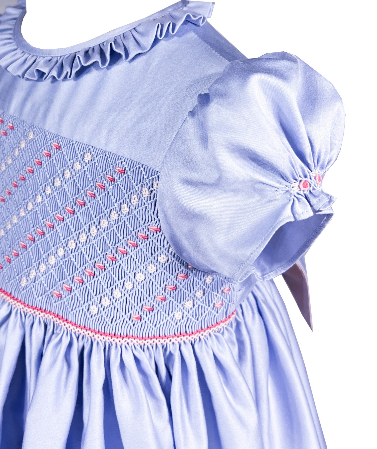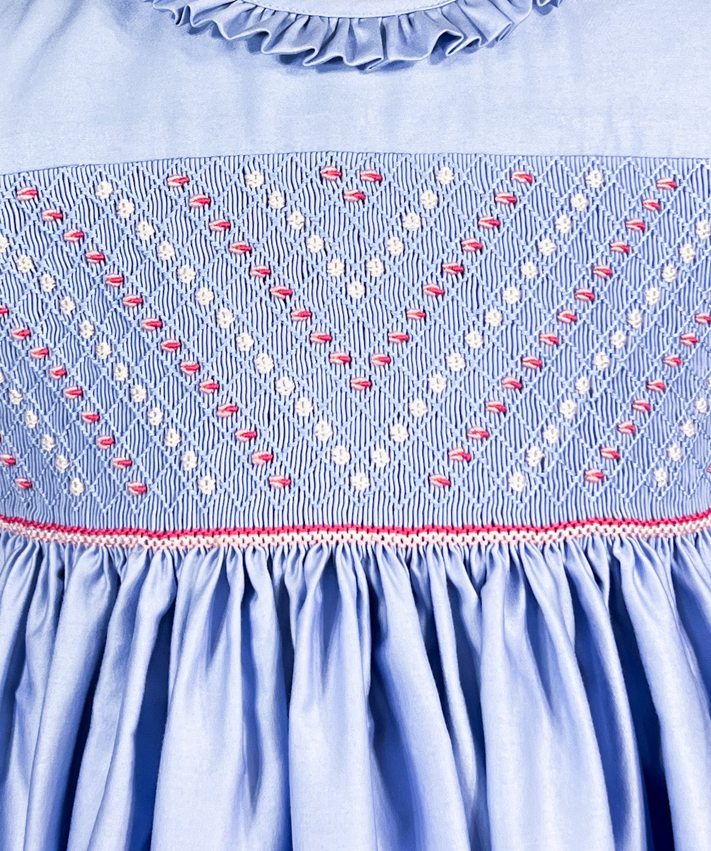 A woodland fairy tale brought to life, the Bluebell Wood Amandine dress enchants in the softest powder blue. The bodice showcases exceptional hand smocking adorned with delicate embroidered flowers in pink and white, creating a garden of blooms across the chest. Each tiny flower is carefully stitched, celebrating the beauty of nature's smallest treasures.