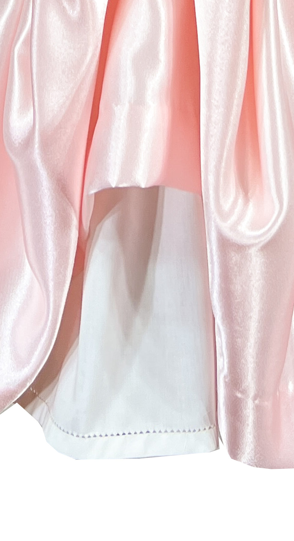 The Crystal Rose Garden dress captures ethereal beauty in its purest form. Crafted in luminous pink satin that catches the light with every movement, this enchanting piece has a subtle shimmer, reminiscent of morning dew on rose petals.