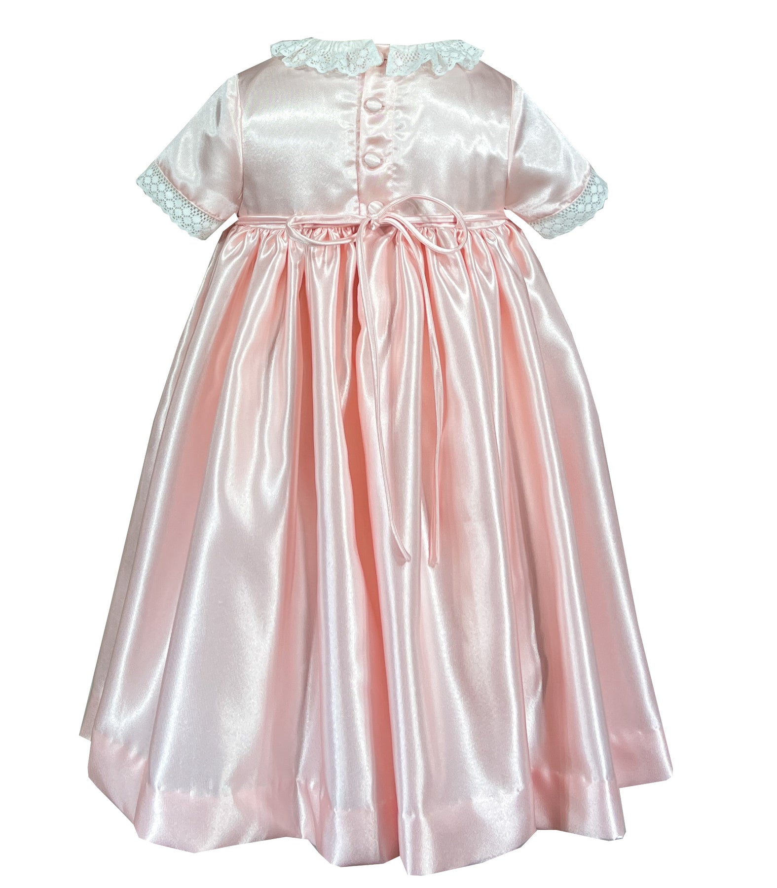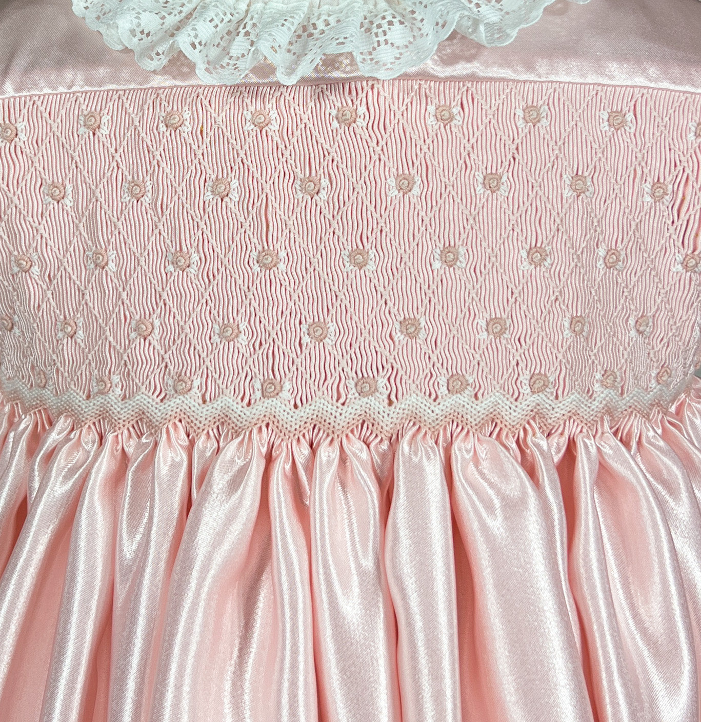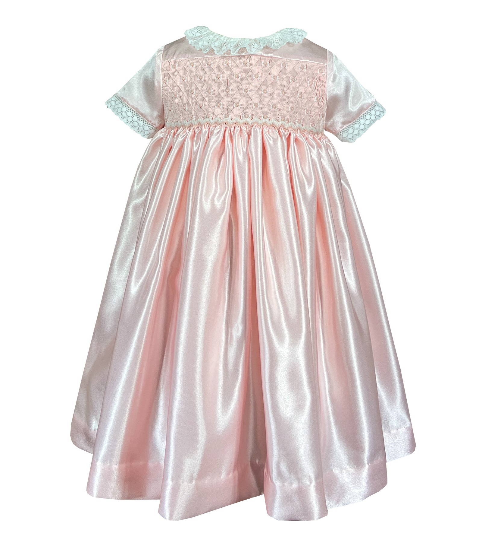 It features a bodice of intricate hand smocking adorned with delicate white and pink rosebuds upon a lattice diamond like pattern. Poetic vintage lace trims the neckline and short sleeve edges, adding a whisper of feminity that enhances the romantic palette. Self covered buttons fasten down the back and a thin tie ensures a perfect fit.
