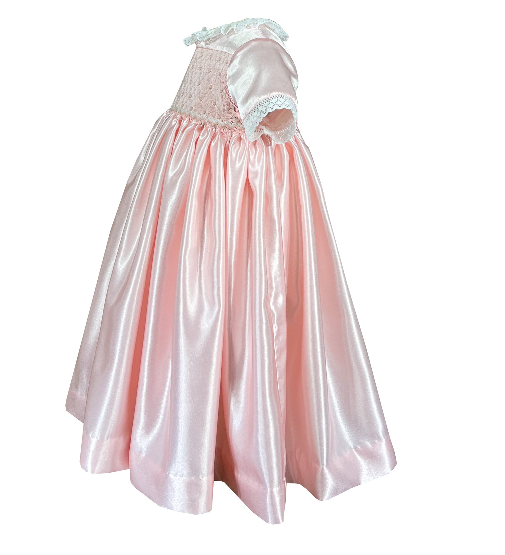 The full gathered skirt flows gracefully from the smocked bodice, the satin's natural sheen creating beautiful movement with every twirl. It is fully lined in cotton for comfort.