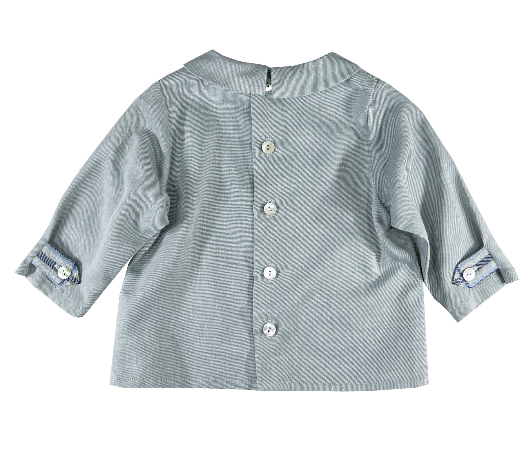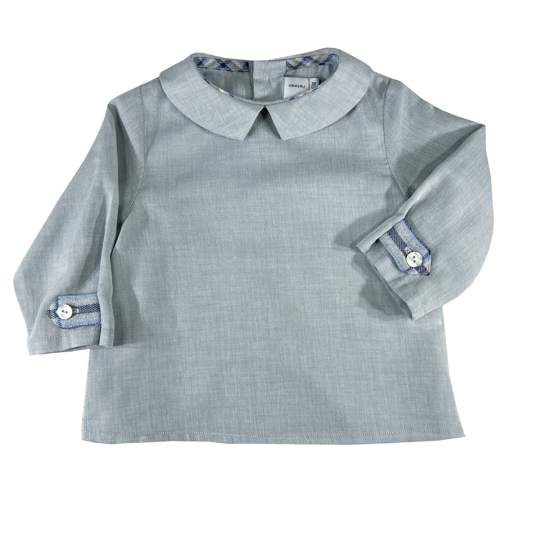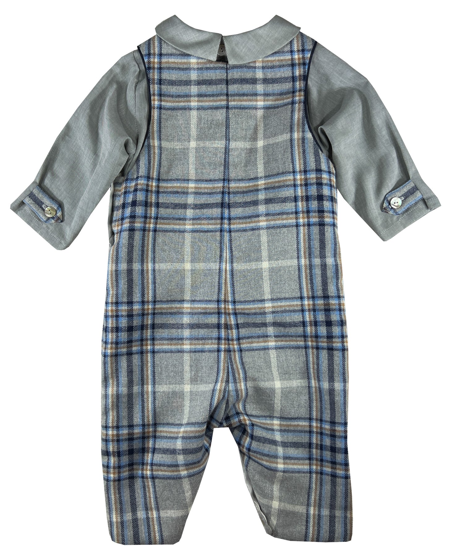 cette salopette et chemise capture le même esprit nordique dans une silhouette ludique et pratique pour garçon. Confectionnée dans le même tartan gris doux avec ses accents bleus doux, marine et beige, l'ensemble crée un look coordonné sophistiqué.