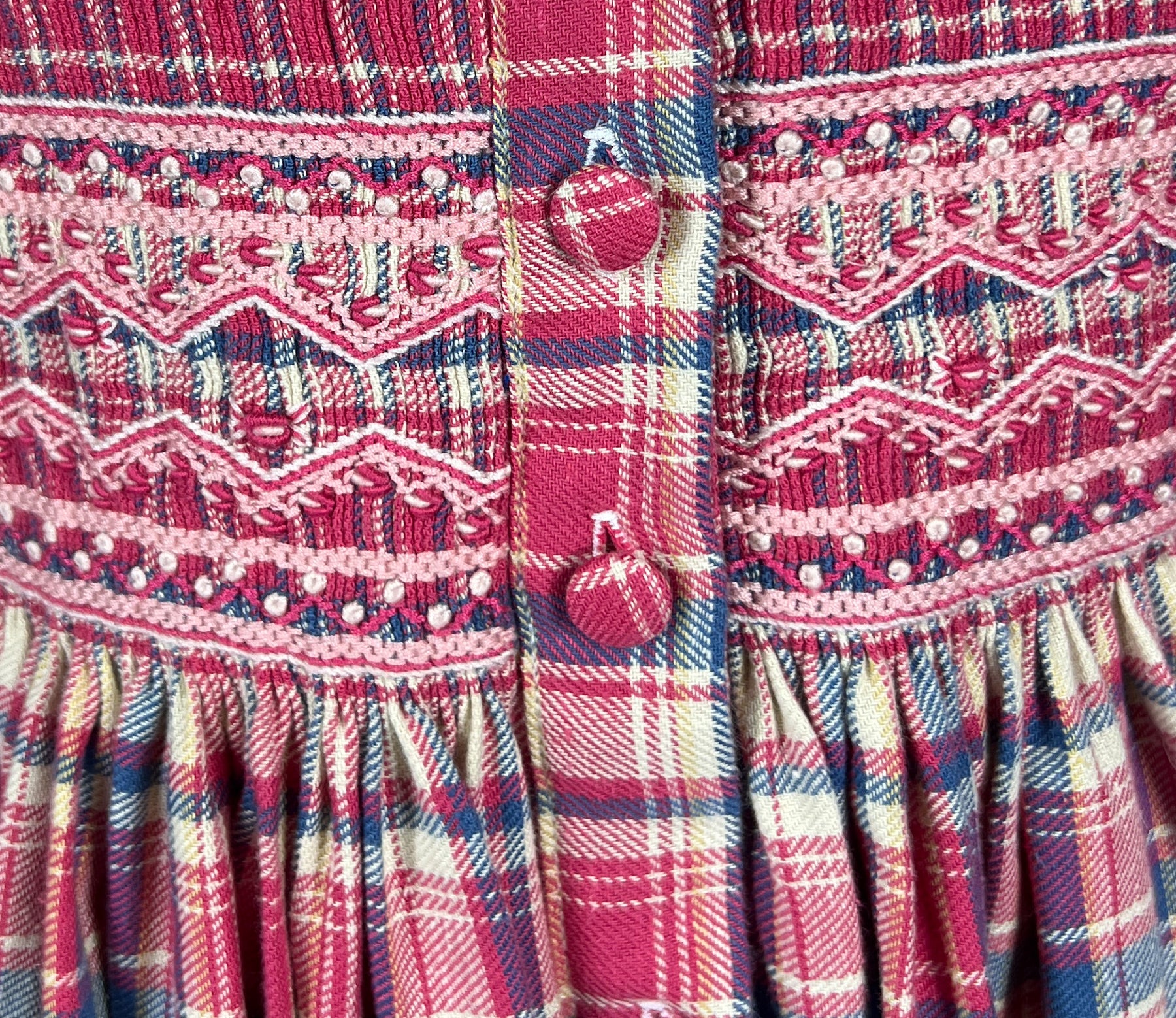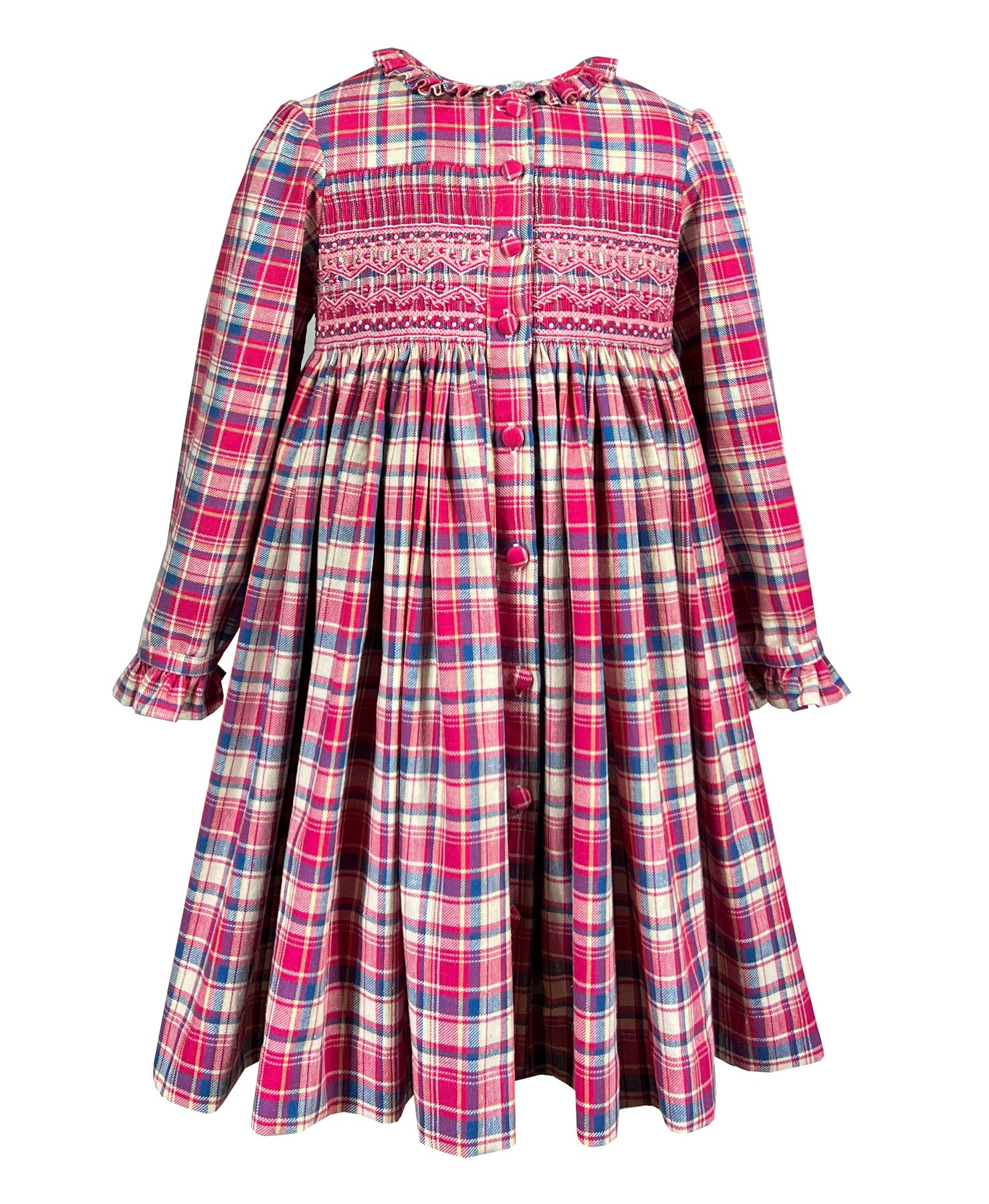 Cette charmante robe évoque l'atmosphère accueillante d'un chalet alpin, avec un tartan audacieux associé à des smocks géométriques détaillés qui célèbrent les traditions montagnardes. Le tartan vif associe rose framboise, bleu marine profond et crème douce dans un motif qui rayonne de luminosité tout au long des mois froids.
