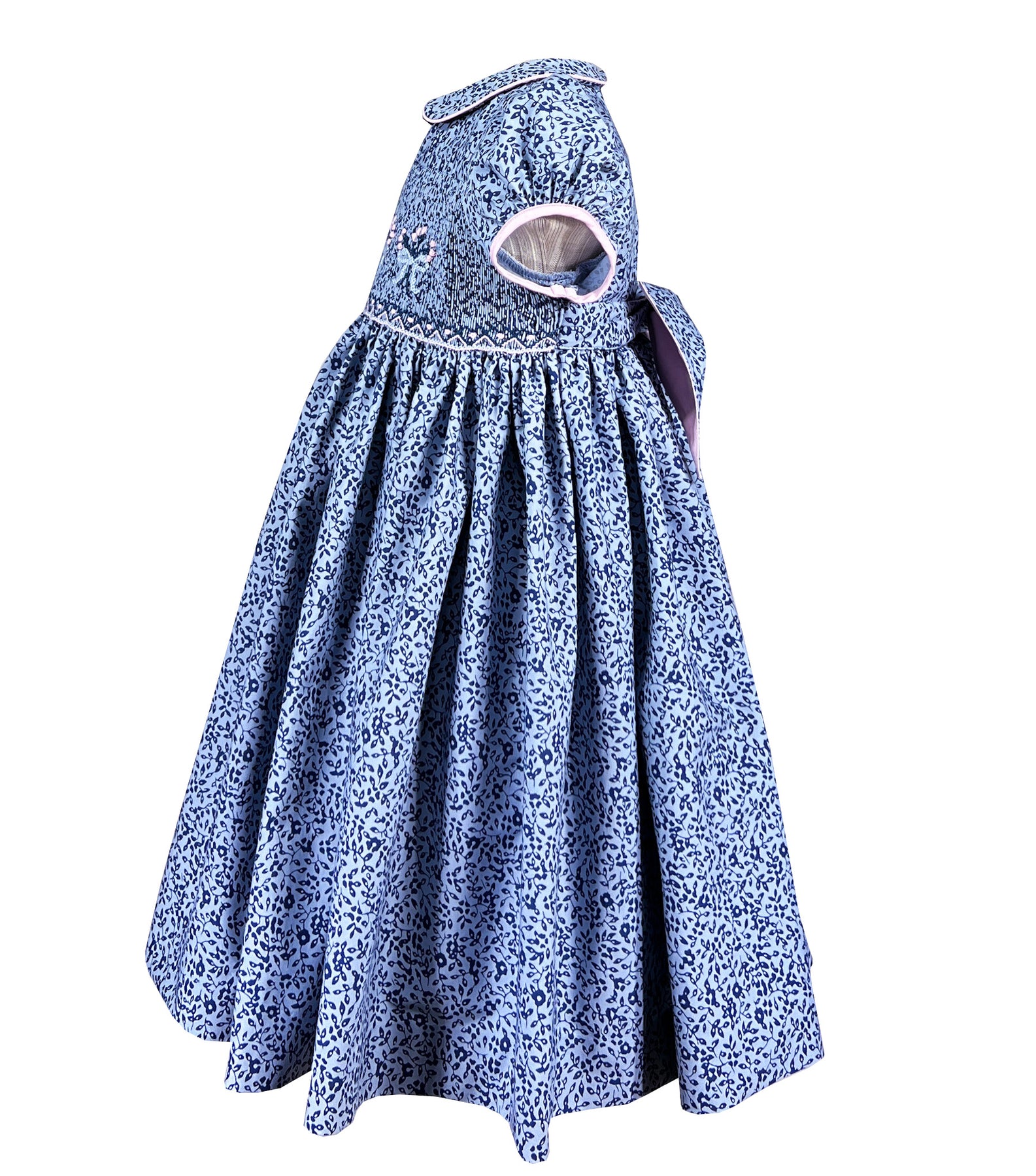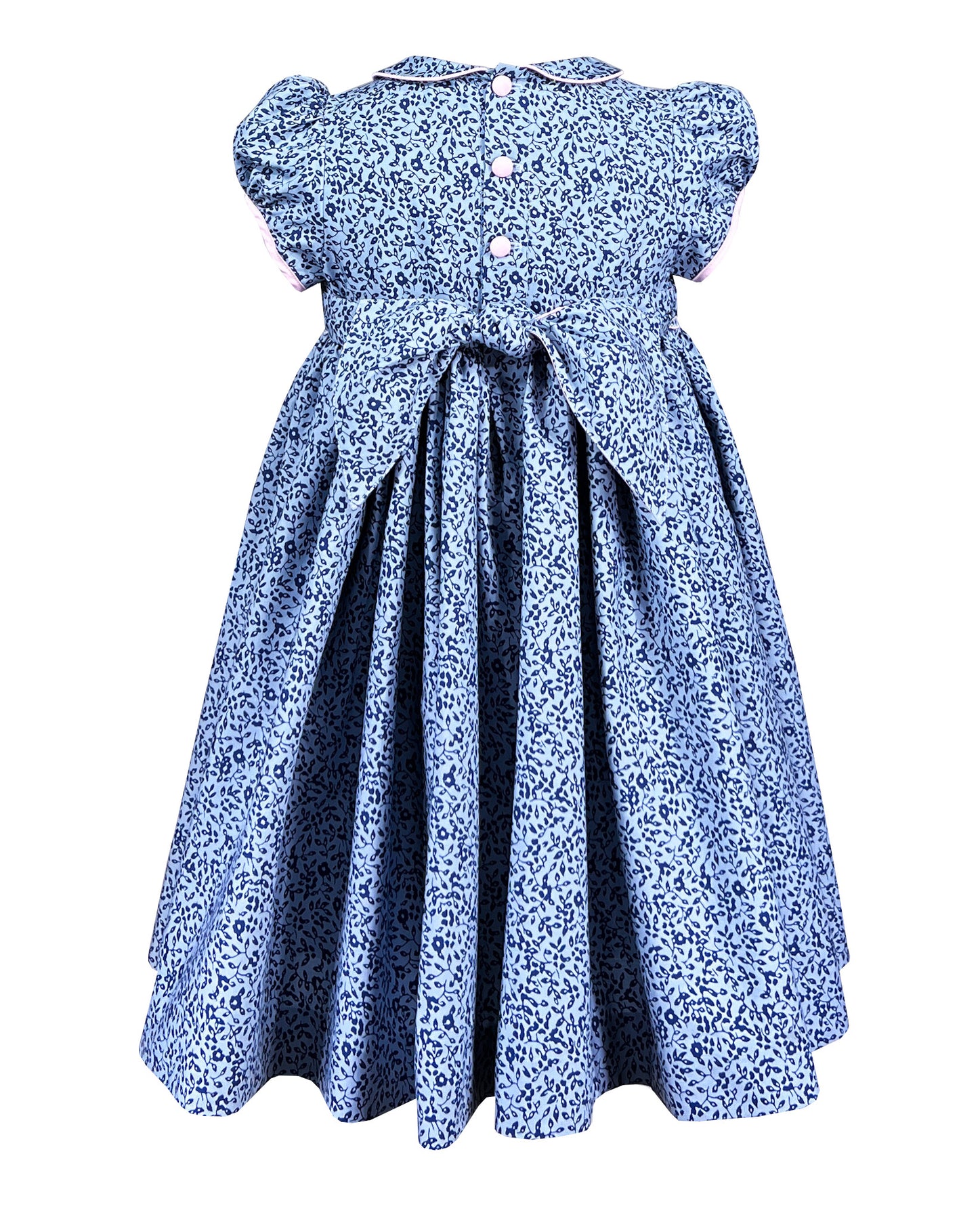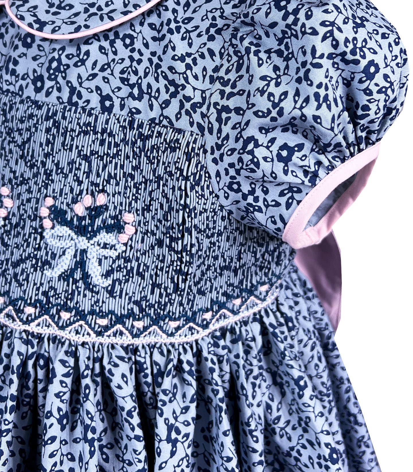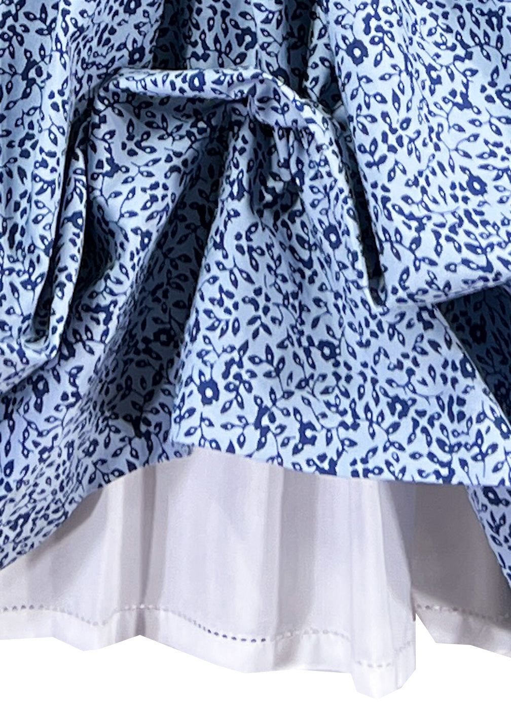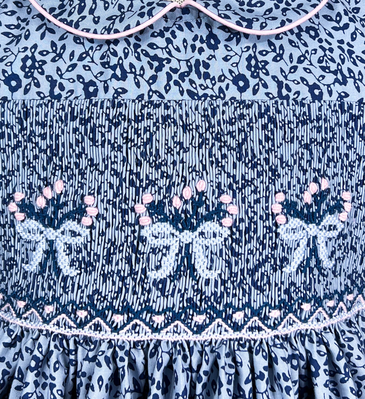 Le corsage présente nos smocks iconiques faits main et raconte une histoire visuelle en fils. Contre les plis serrés, des nœuds de ruban bleu pastel émergent en parfaite symétrie. De petites roses flottent au-dessus des nœuds comme des confettis, ajoutant des touches de couleur tendre.