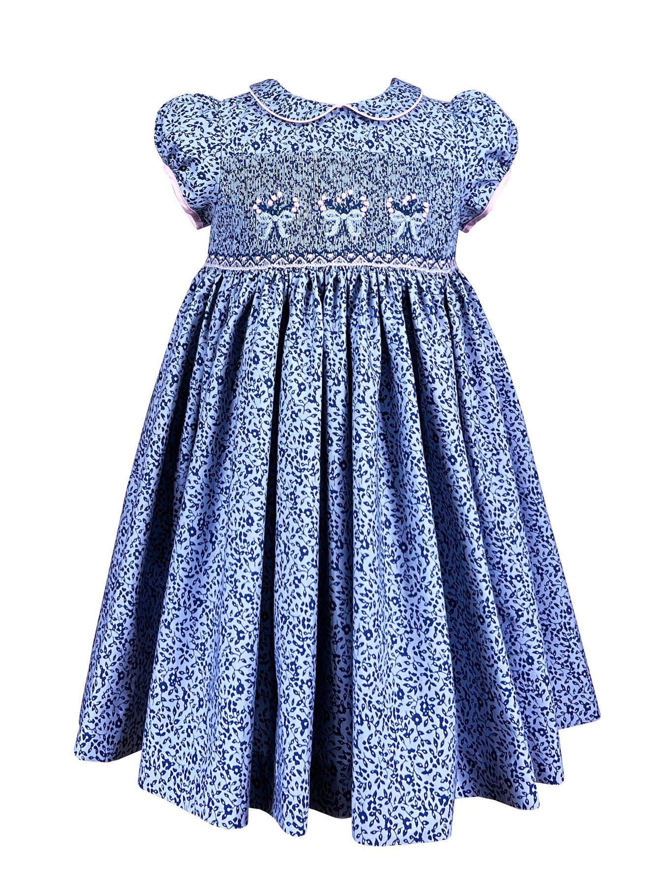 Une célébration de féminité délicate, cette robe enchanteresse combine des smocks complexes avec une charmante impression florale. Le tissu présente un motif fascinant de motifs botaniques marine sur bleu ciel doux, où de minuscules feuilles et fleurs dansent sur la surface dans une profusion gracieuse.