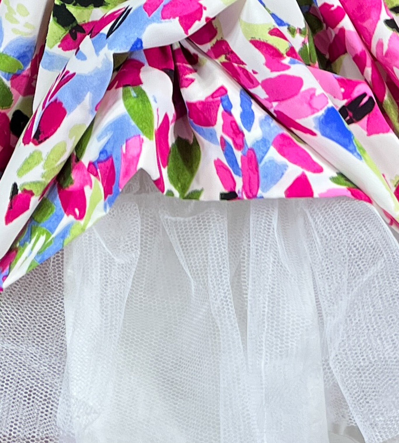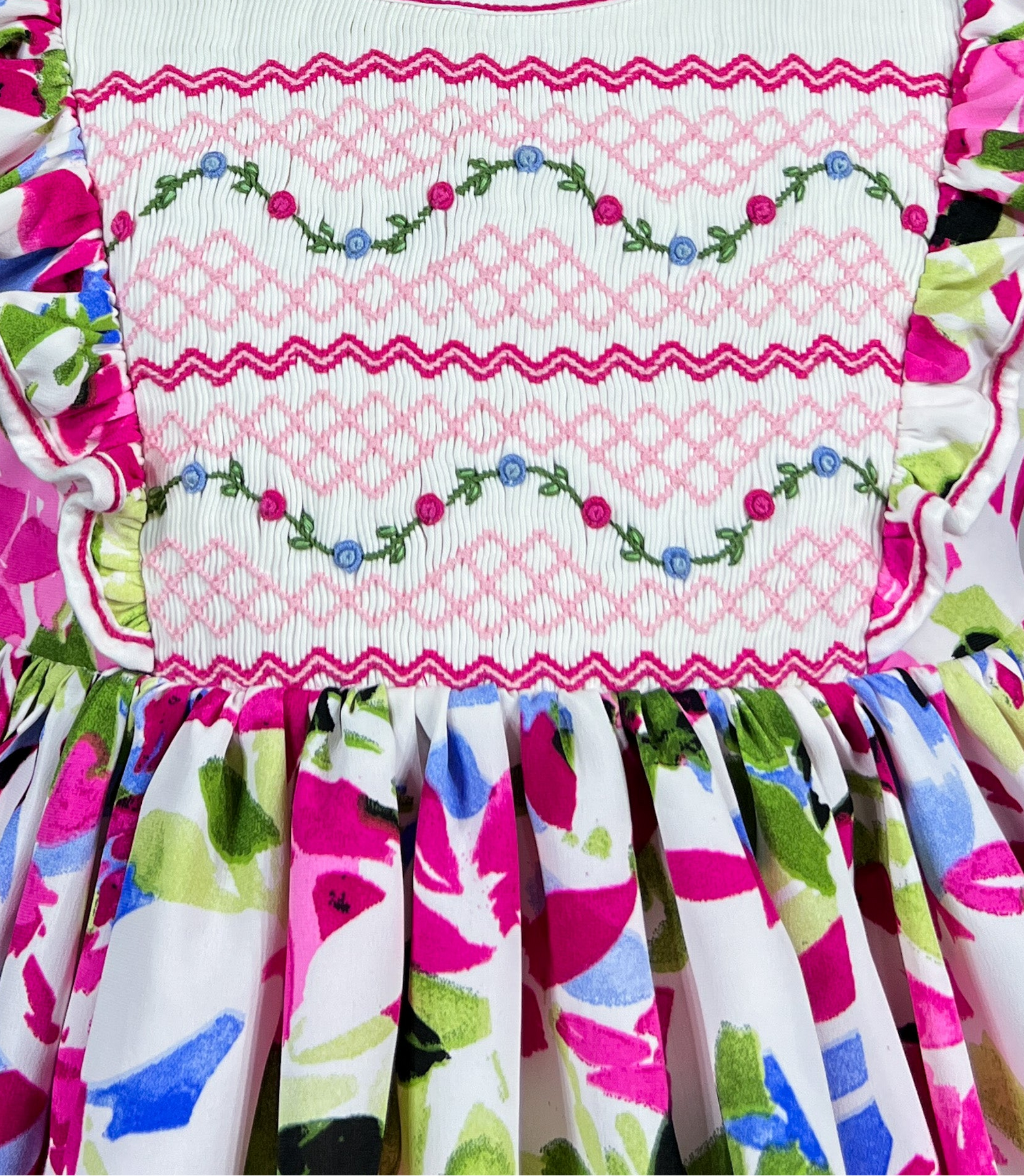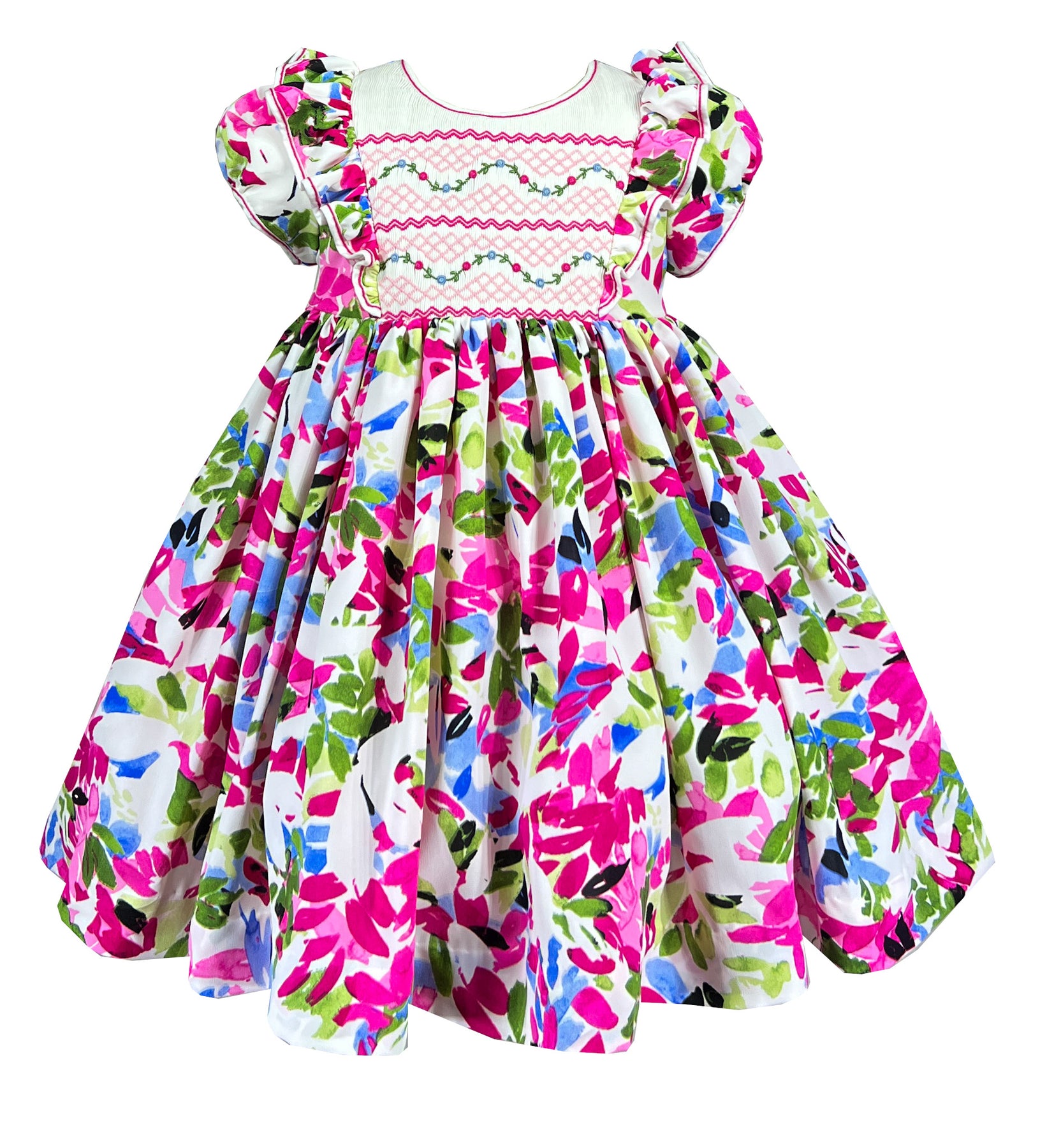 Le buste plissé blanc présente des smocks fait main avec des motifs géométriques roses, bleus et verts qui complètent l'imprimé floral éclatant. Il est encadré par de délicats volants qui tombent en cascade sur les épaules et la poitrine, flottant comme des ailes de papillon, et par des manches ballons classiques. Tout comme l'encolure ronde, elles sont toutes bordées d'un fil de tige fuchsia.