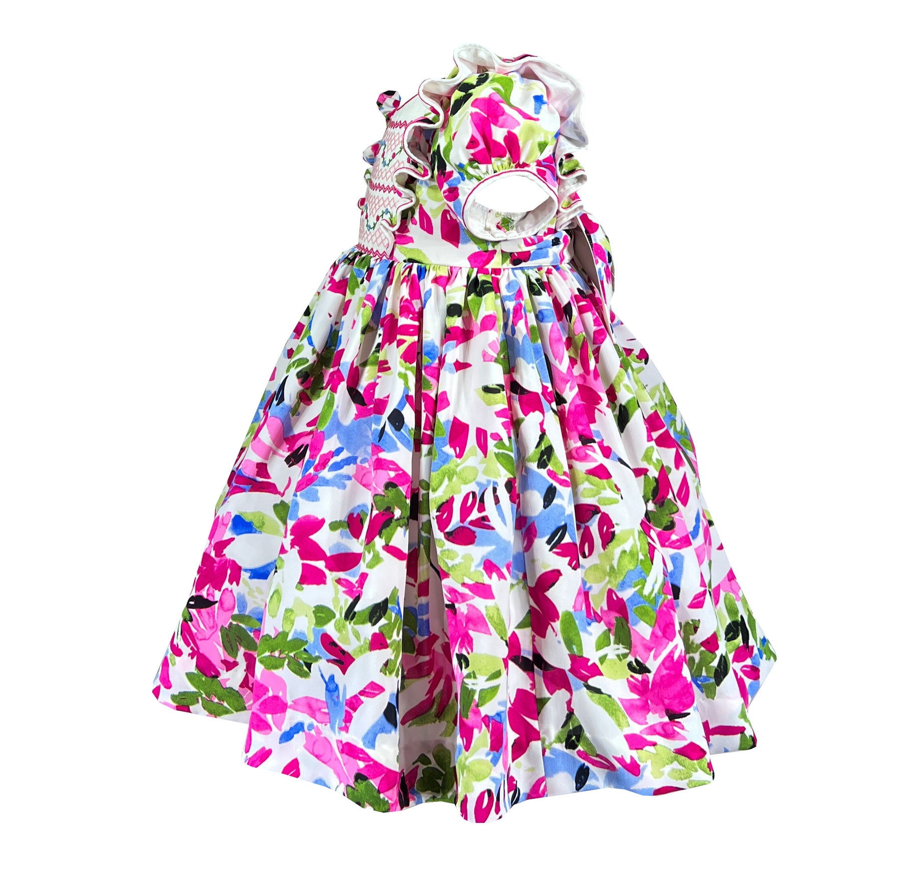 Véritable arc-en-ciel de joie dans un imprimé floral des plus éclatants, cette robe Netti célèbre la vie en couleurs. Des fleurs audacieuses dans des tons rose vif, fuchsia, vert et bleu dansent sur un tissu blanc immaculé, créant un jardin exubérant qui capture l'énergie débordante de l'enfance.