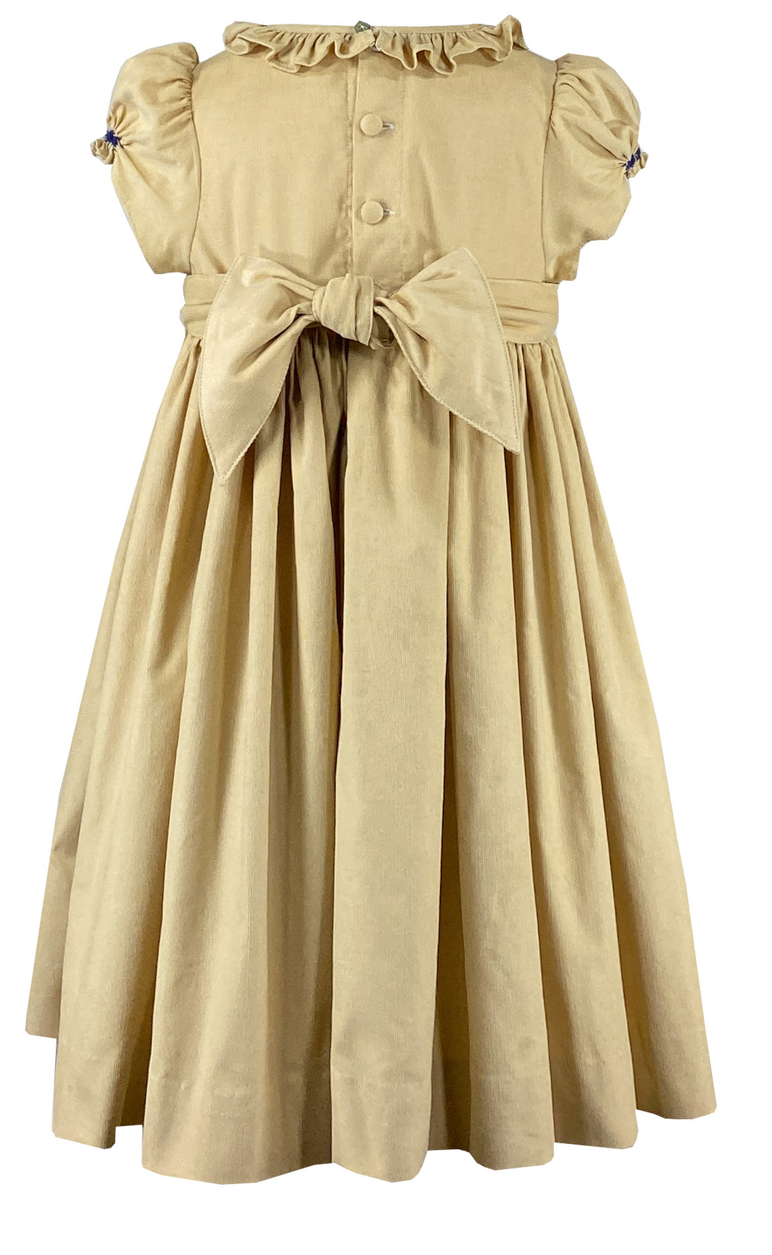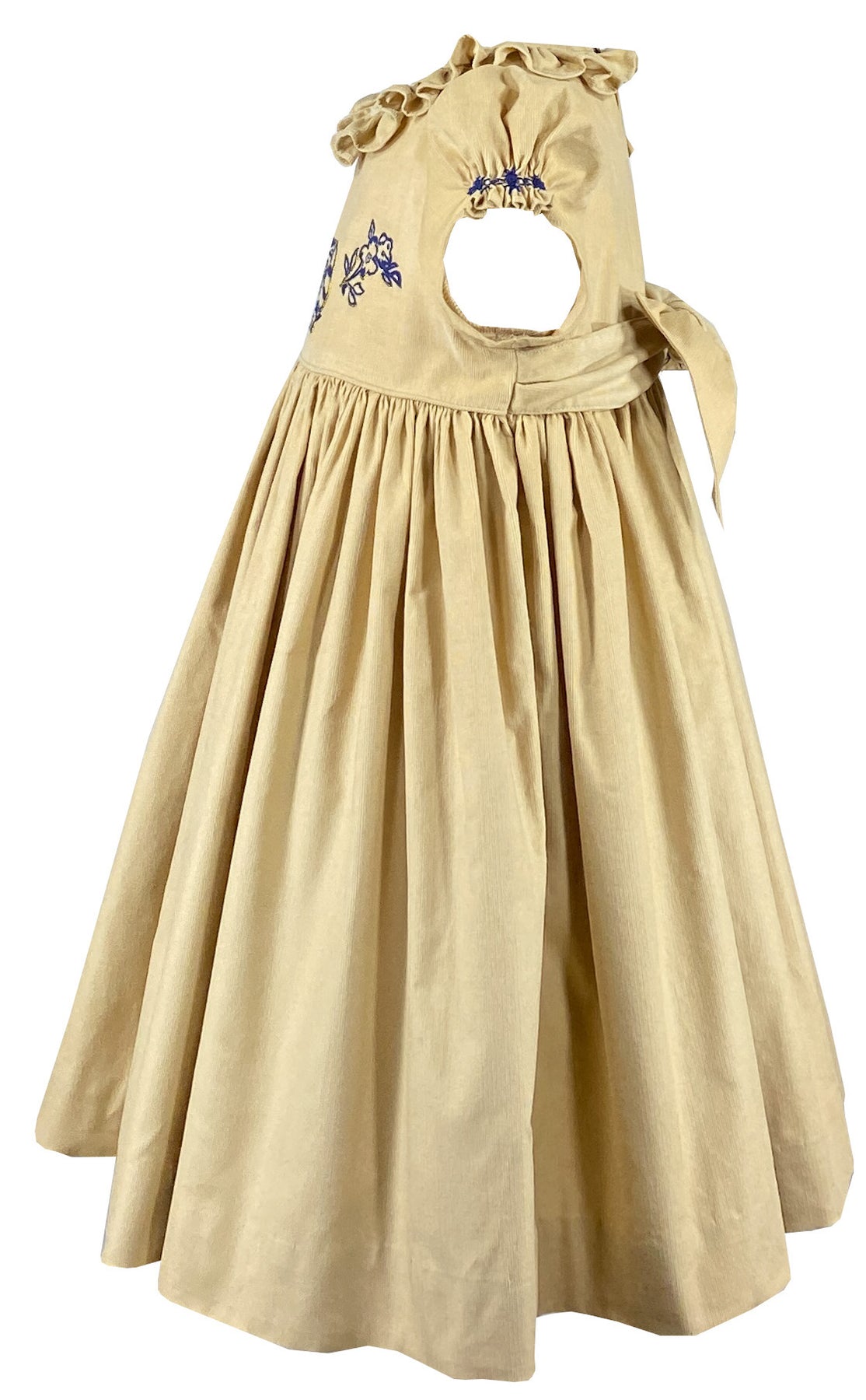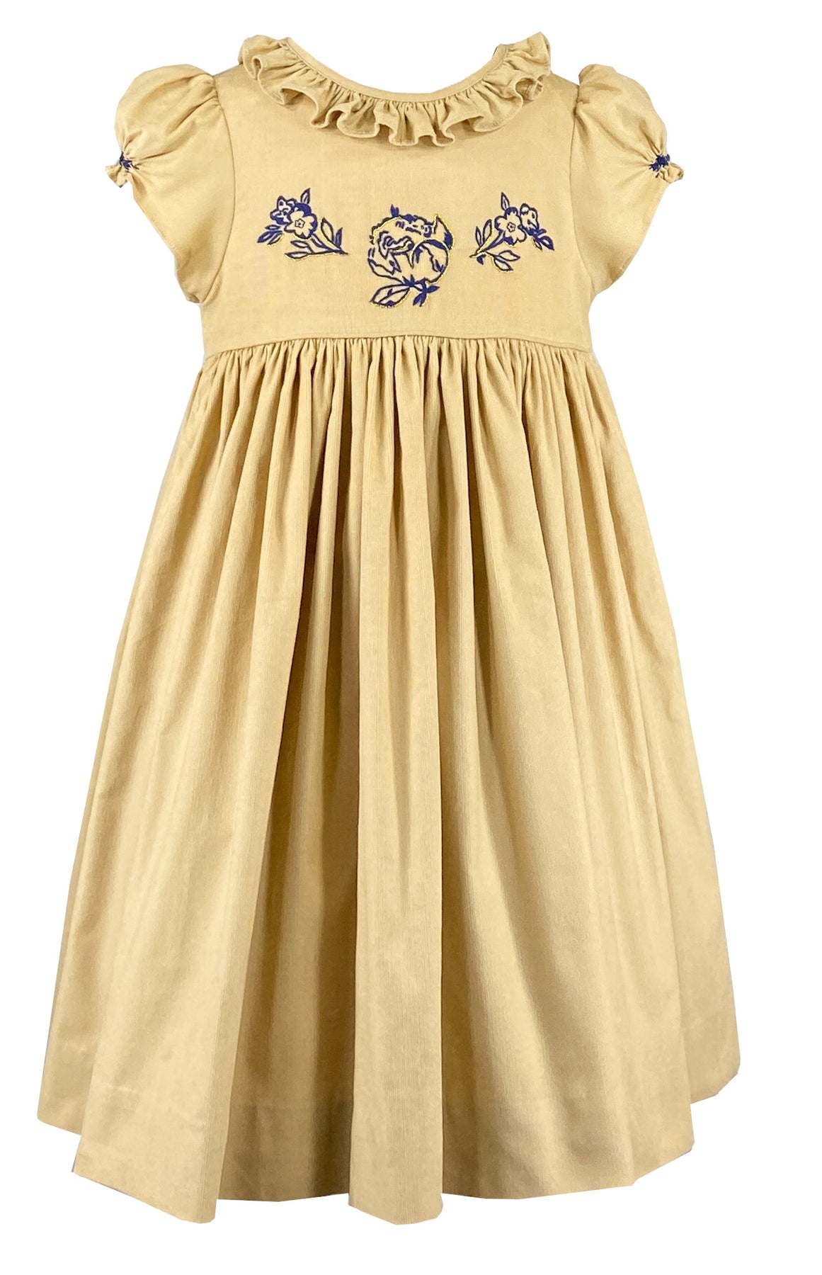A wide frilled collar frames the neckline with grace, while the romantically puffed sleeves are adorned with charming navy rose buds. A graceful butterfly bow at the back adds the final sophisticated touch.