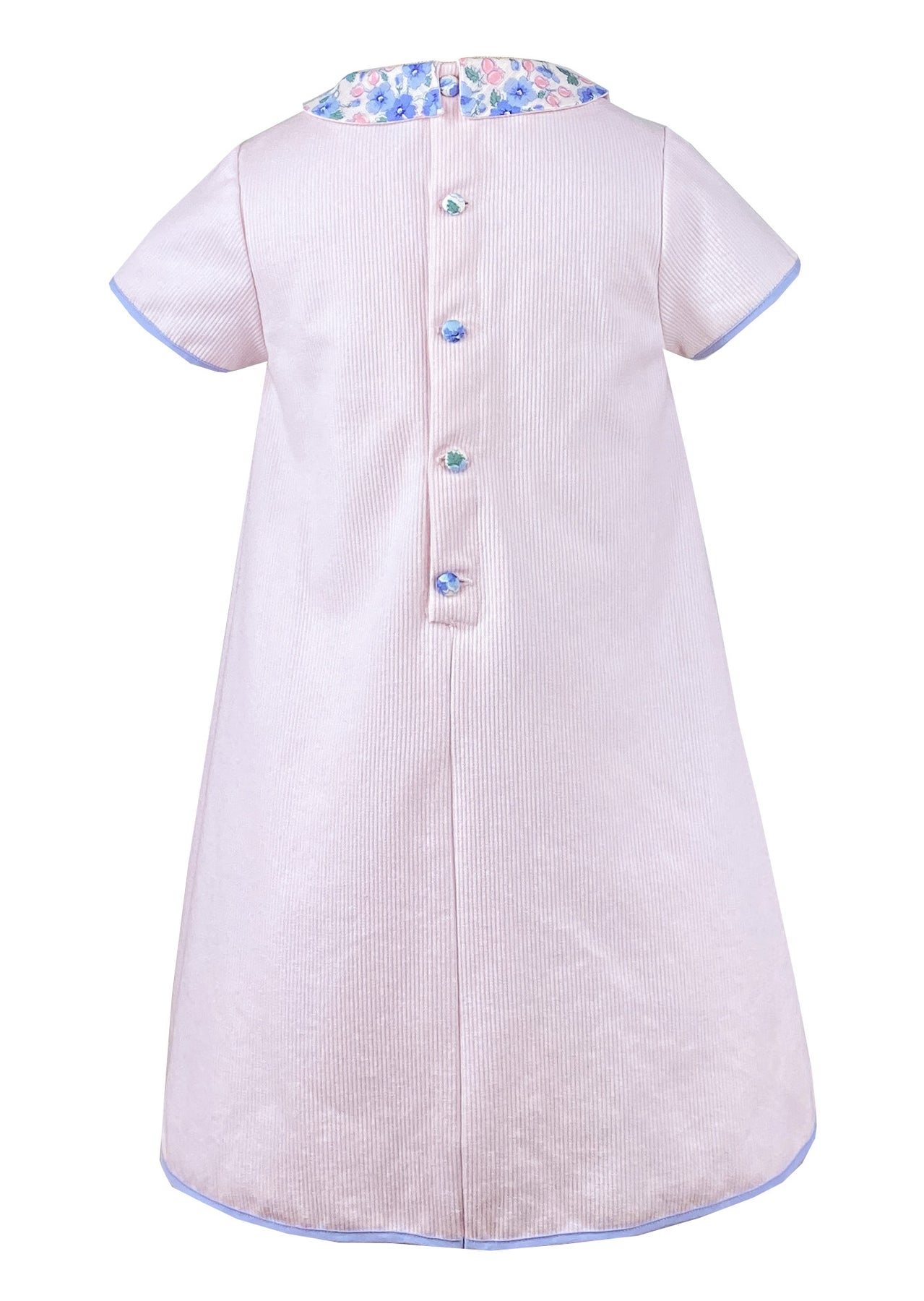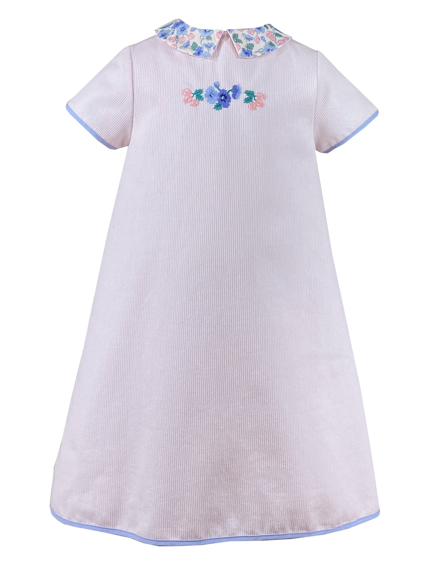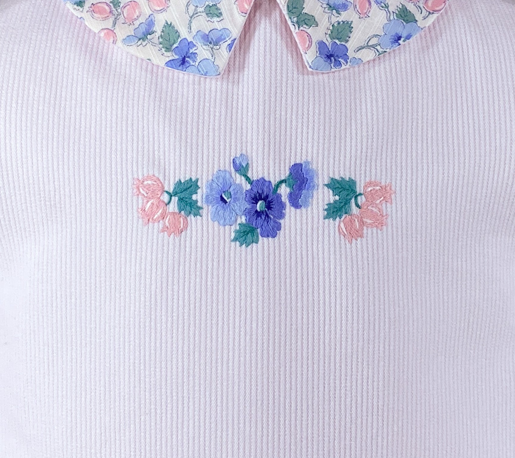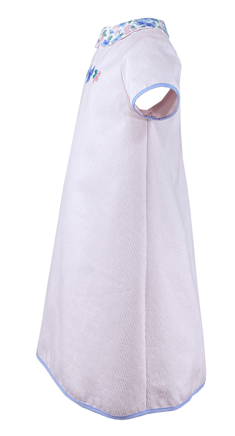 The dress features a distinctive floral print pointy collar while coordinating self-covered buttons create a seamless harmony. Delicate hand-embroidered florals bloom across the chest, each stitch carefully placed to create dimension and artistry.