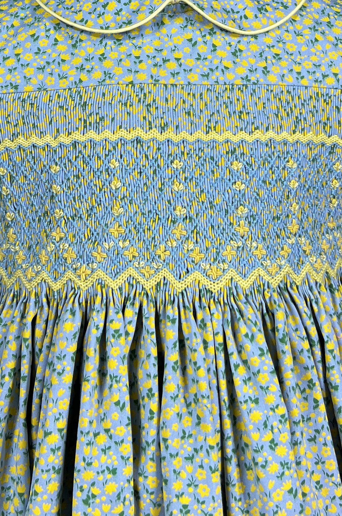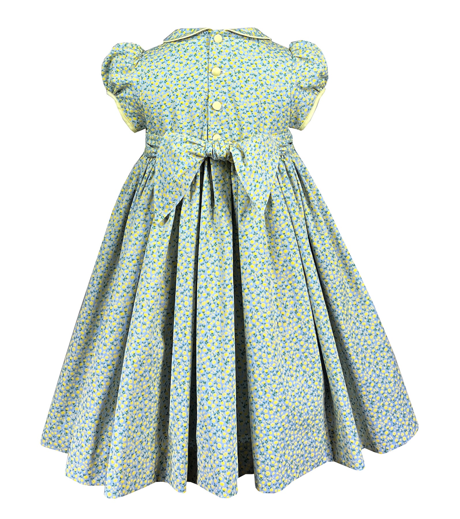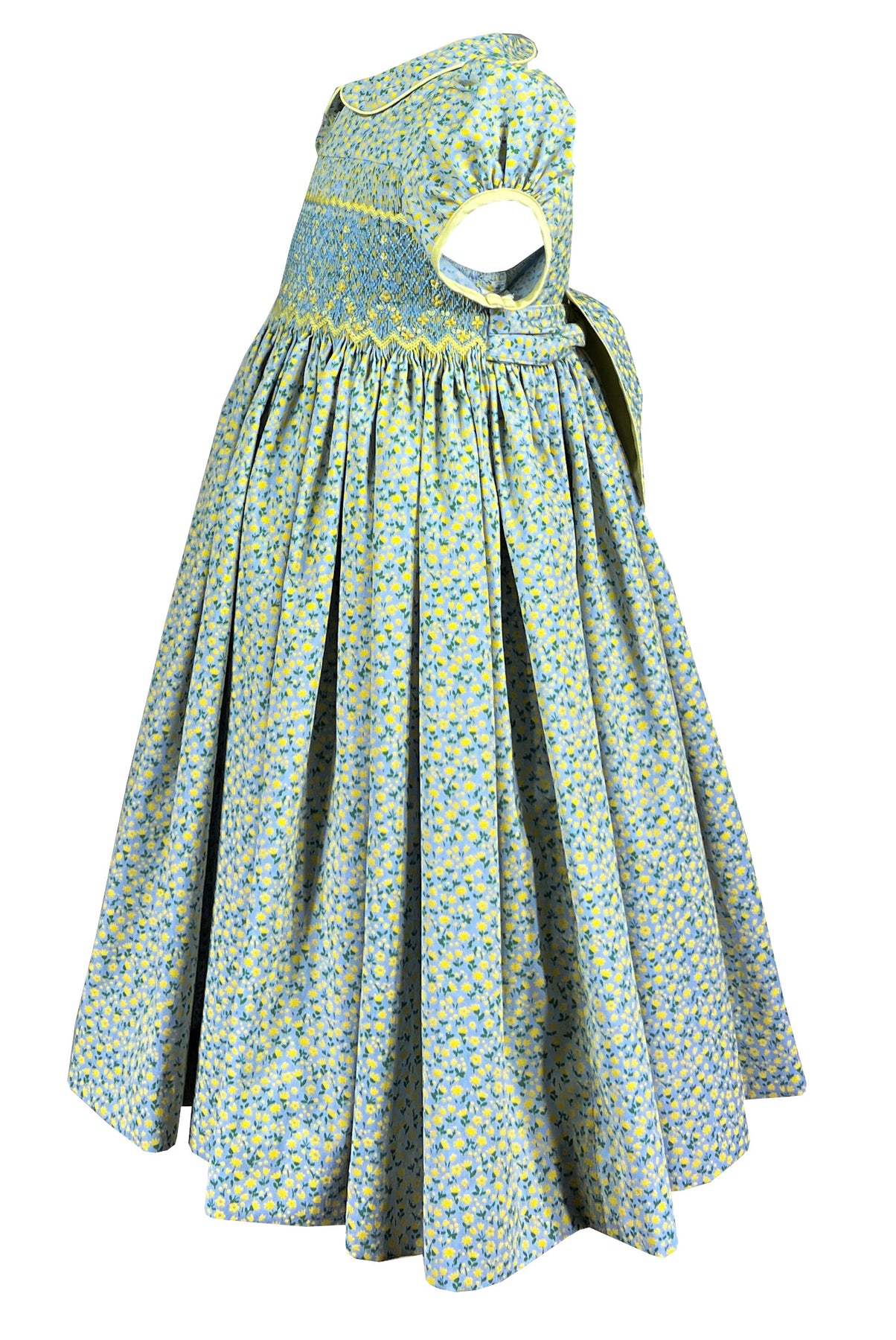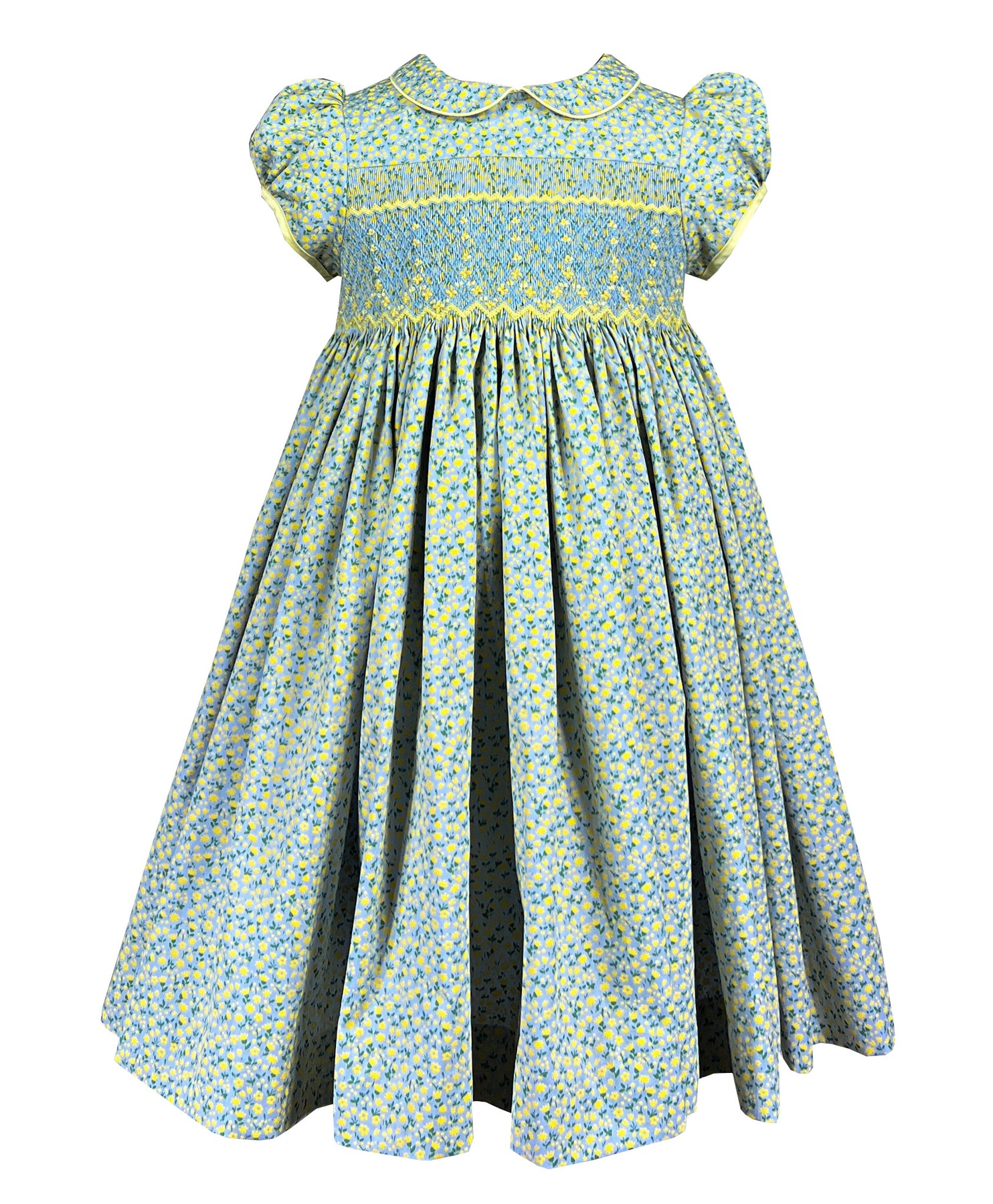 The Peter Pan collar and short puffed sleeves both trimmed in matching yellow add a charming vintage touch. The full gathered skirt flows gracefully from the hand-smocked bodice, offering beautiful movement and plenty of room for play and twirling.