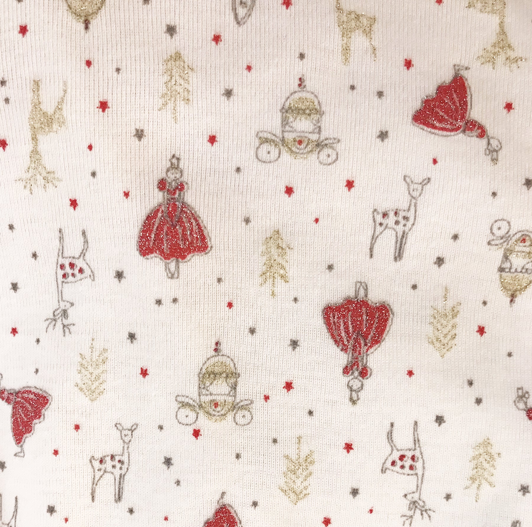 This print makes us travel to a fairytale world : with its red queens, stars, reindeers, princess coach and golden christmas trees, it is very precious. May it make your little one dream!