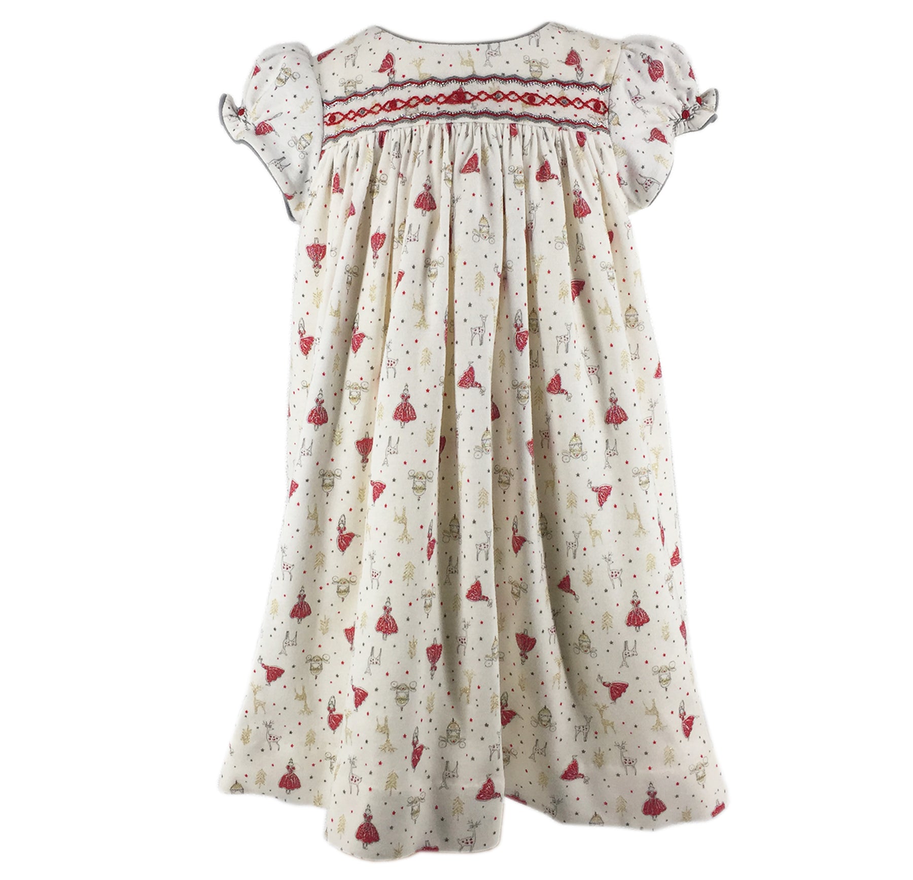 Beautifully handmade holiday smocked dress featuring red and silver smocks, short puffed sleeves with embroideries and visible lining and matching fabric covered buttons fastening.