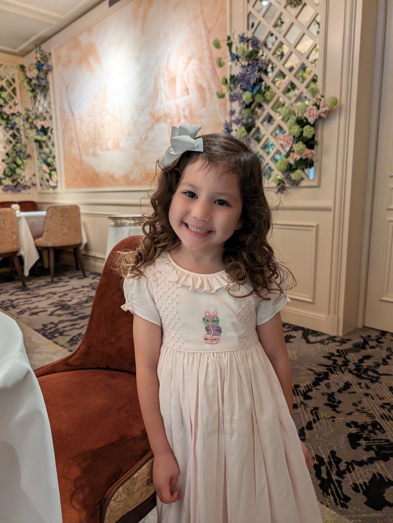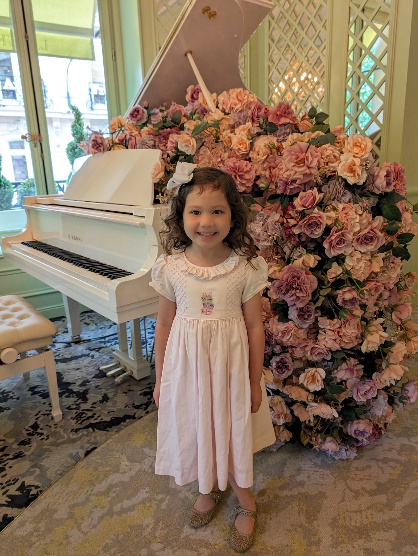 There's something utterly magical about stepping into a Parisian patisserie : the air filled with vanilla and almond, glass cases displaying rows of perfect macarons like precious jewels, and the gentle hum of whispered French conversations. This dress captures that enchanting moment when childhood wonder meets Parisian elegance. May your little one carry the sweetness of Paris in her heart and twirl through life with the grace and joie de vivre that makes every day feel like an adventure!