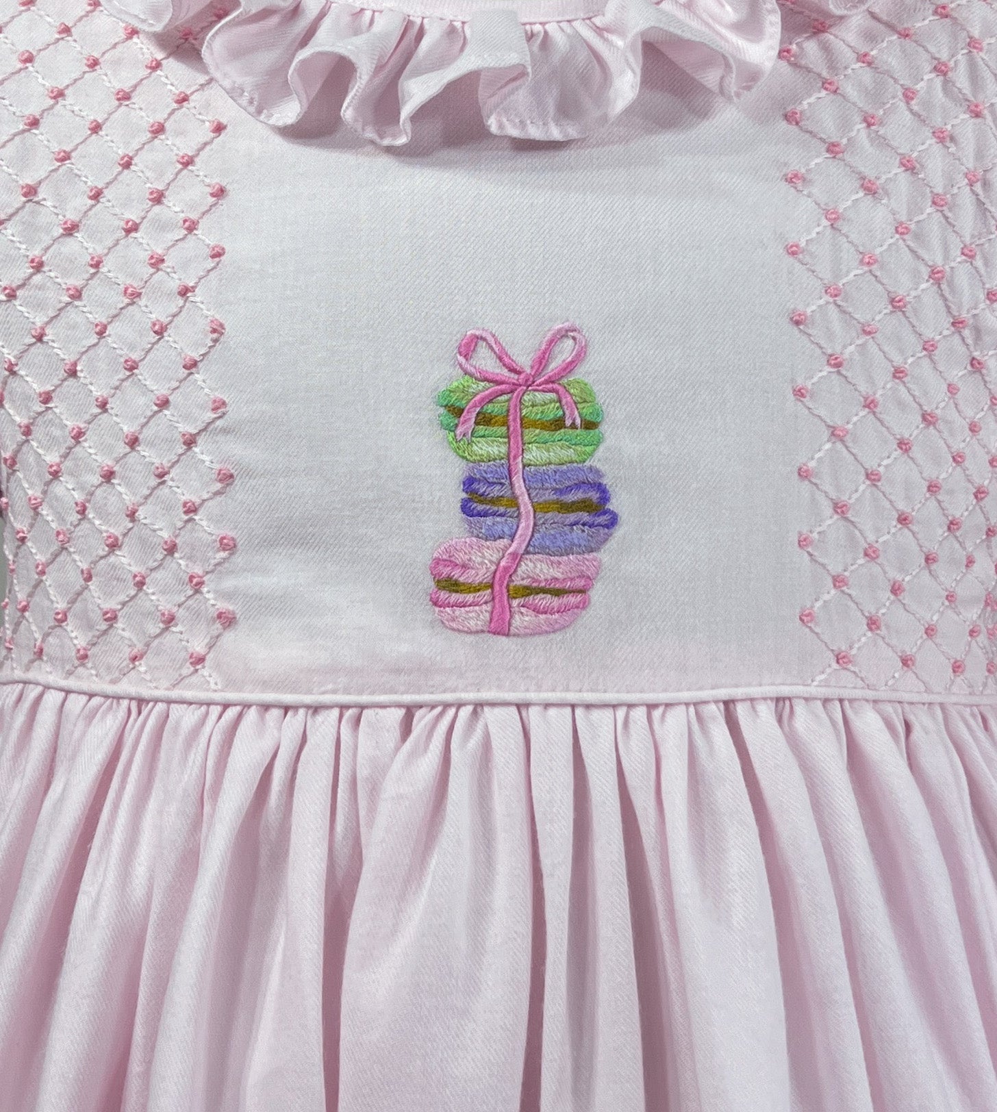 Adorned with exquisite hand-embroidered macarons, this enchanting soft pink dress is pure Parisian magic.