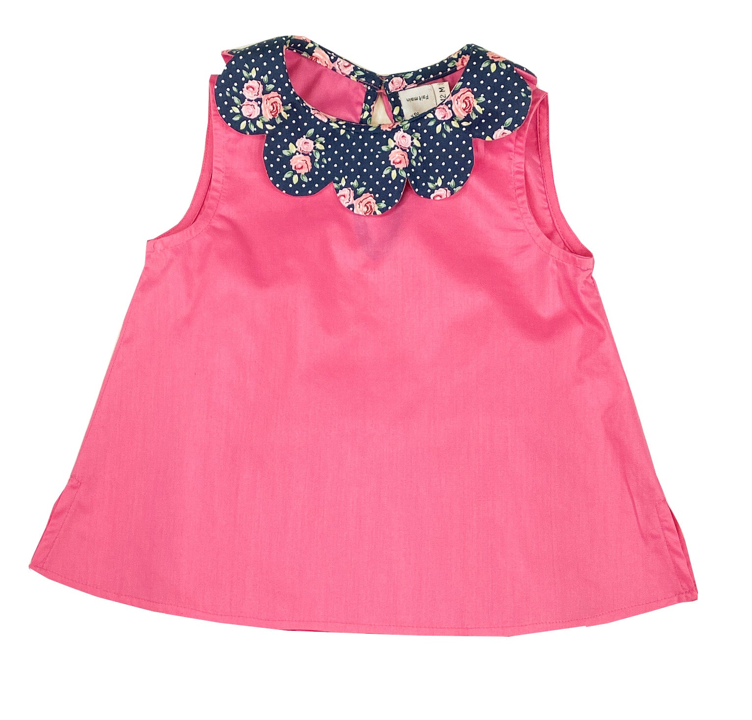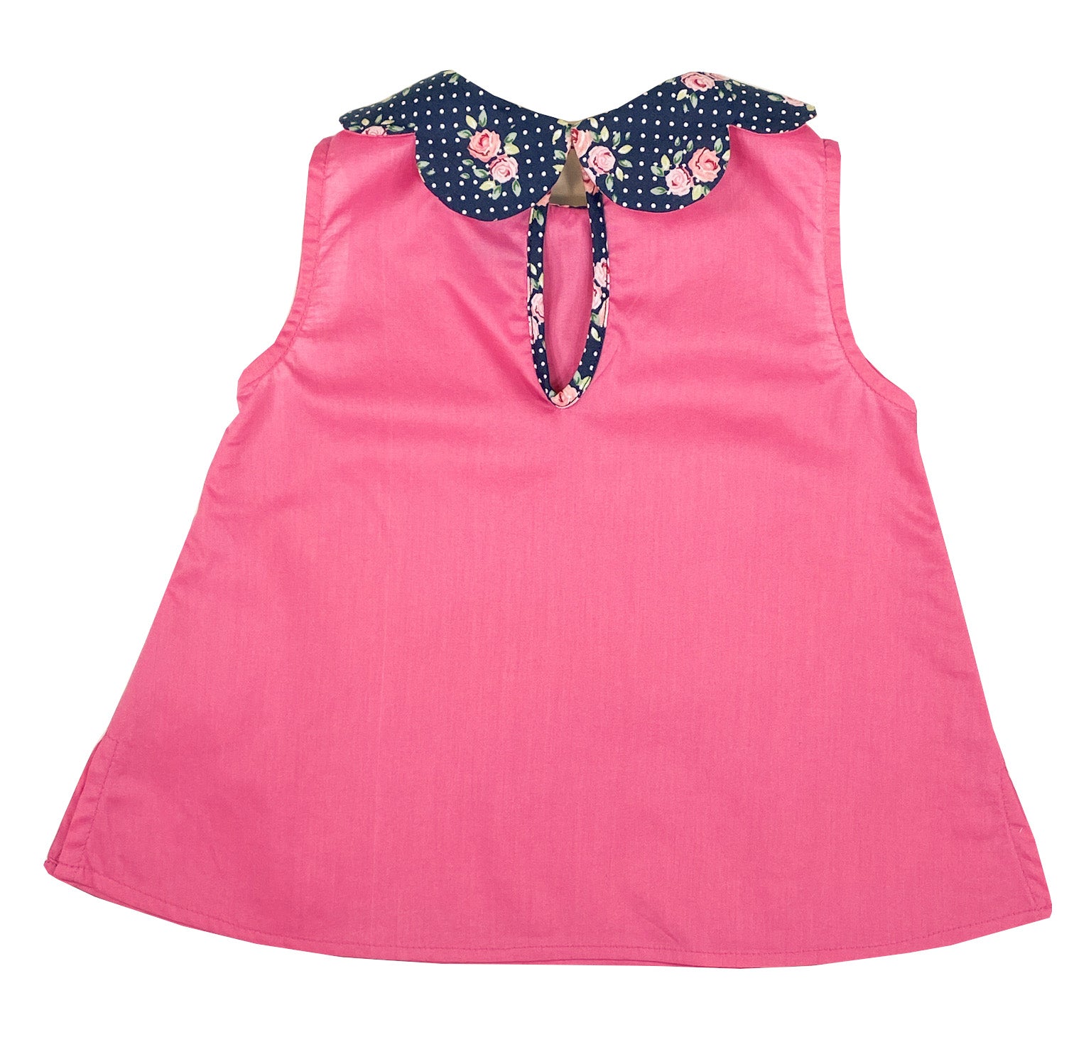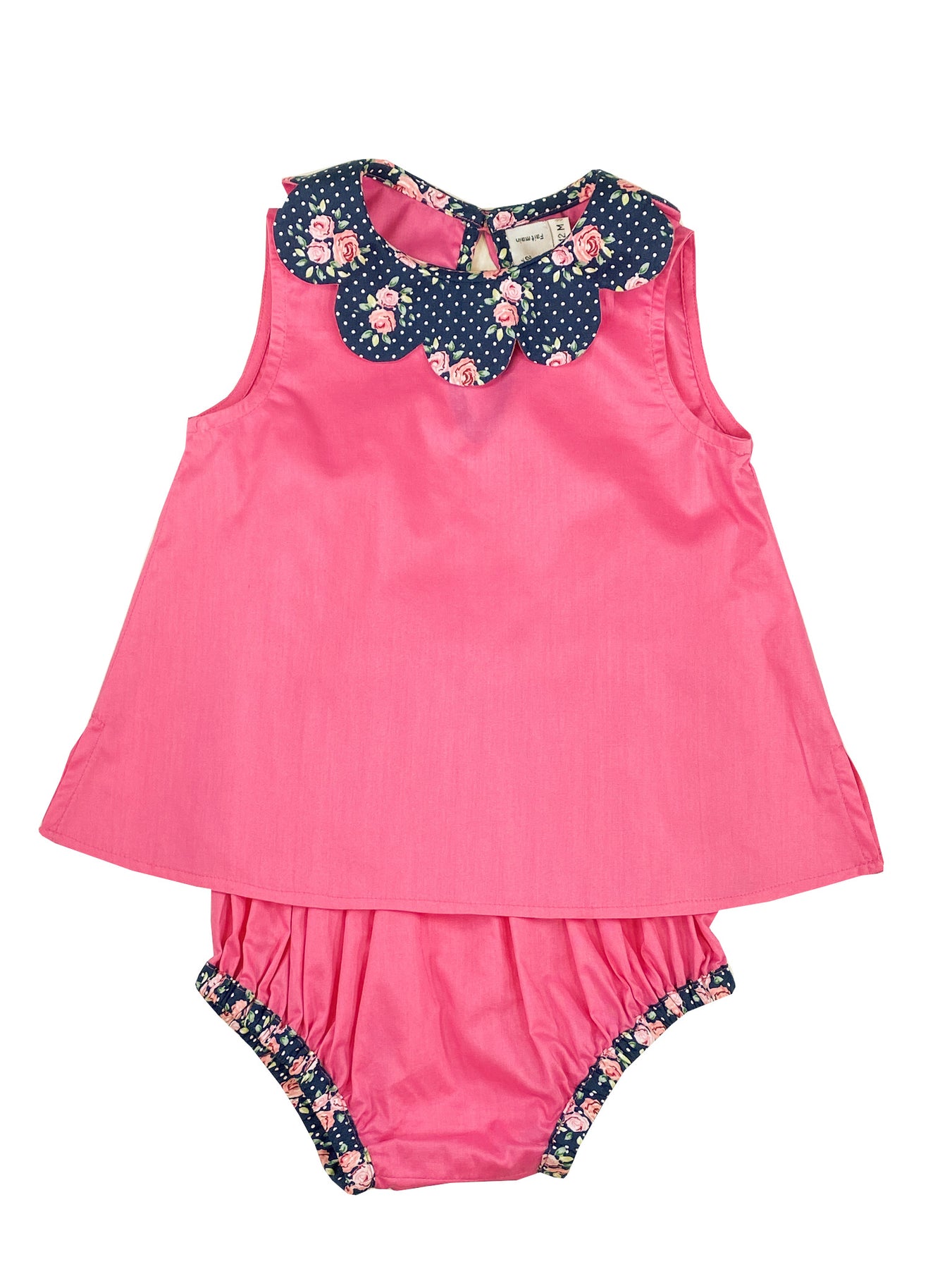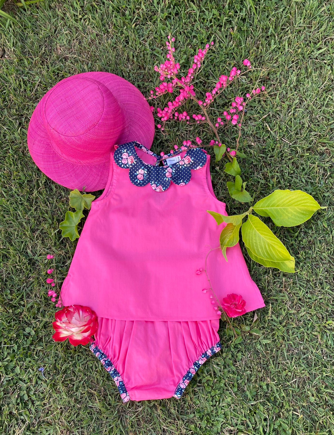 Beautiful co-ordinated summer outfit. Sleeveless petal collar blouse with fastening system in the back and matching bloomer.