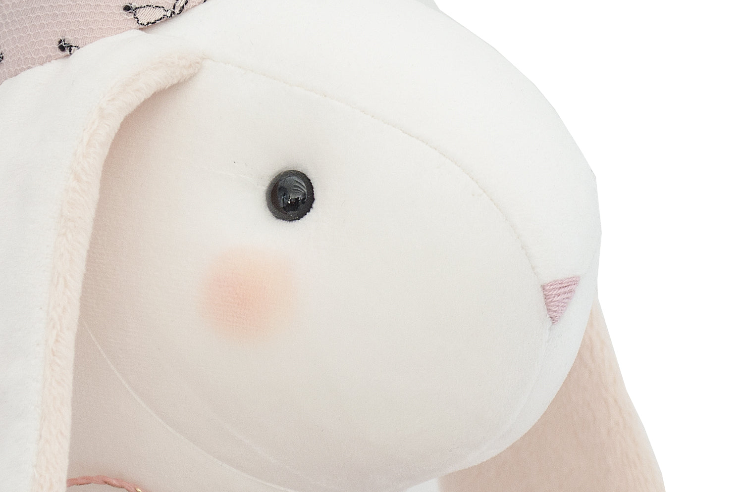 - The bunny’s body is made of white velvet. Very soft, the velvet is 100% polyester.
