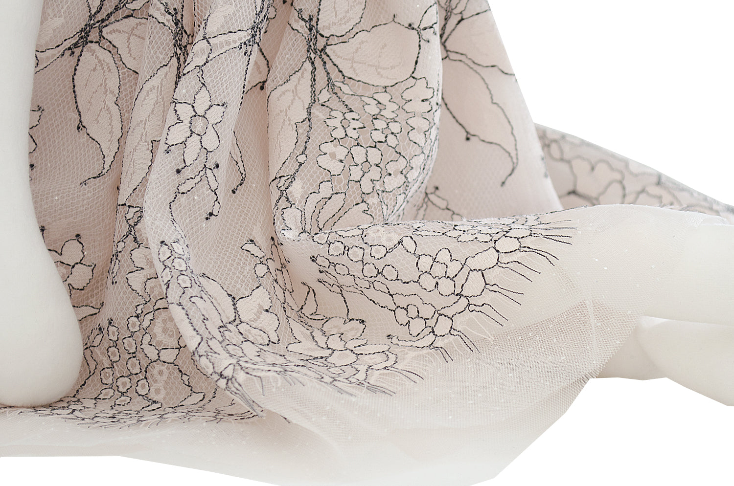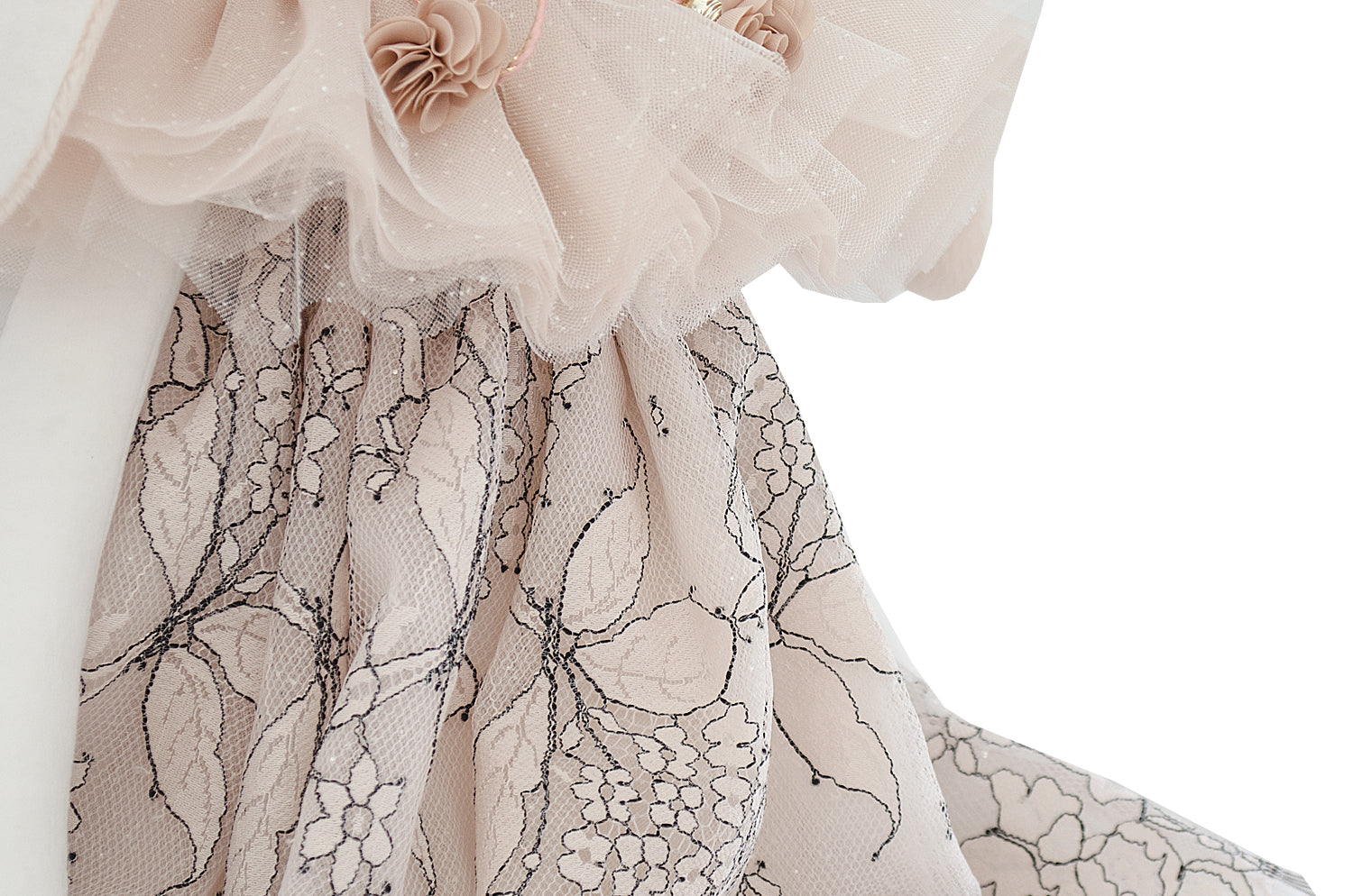 Dressed with a fancy party hat, gorgeous soft pink floral motif lace and tulle, Capucine is a beauty! Very feminine and romantic too.
