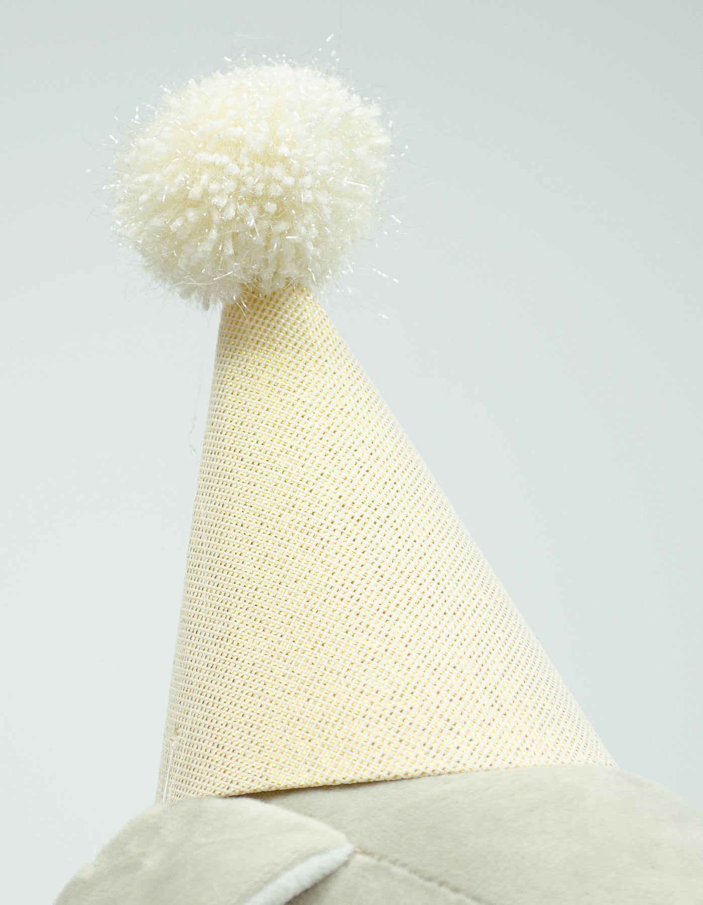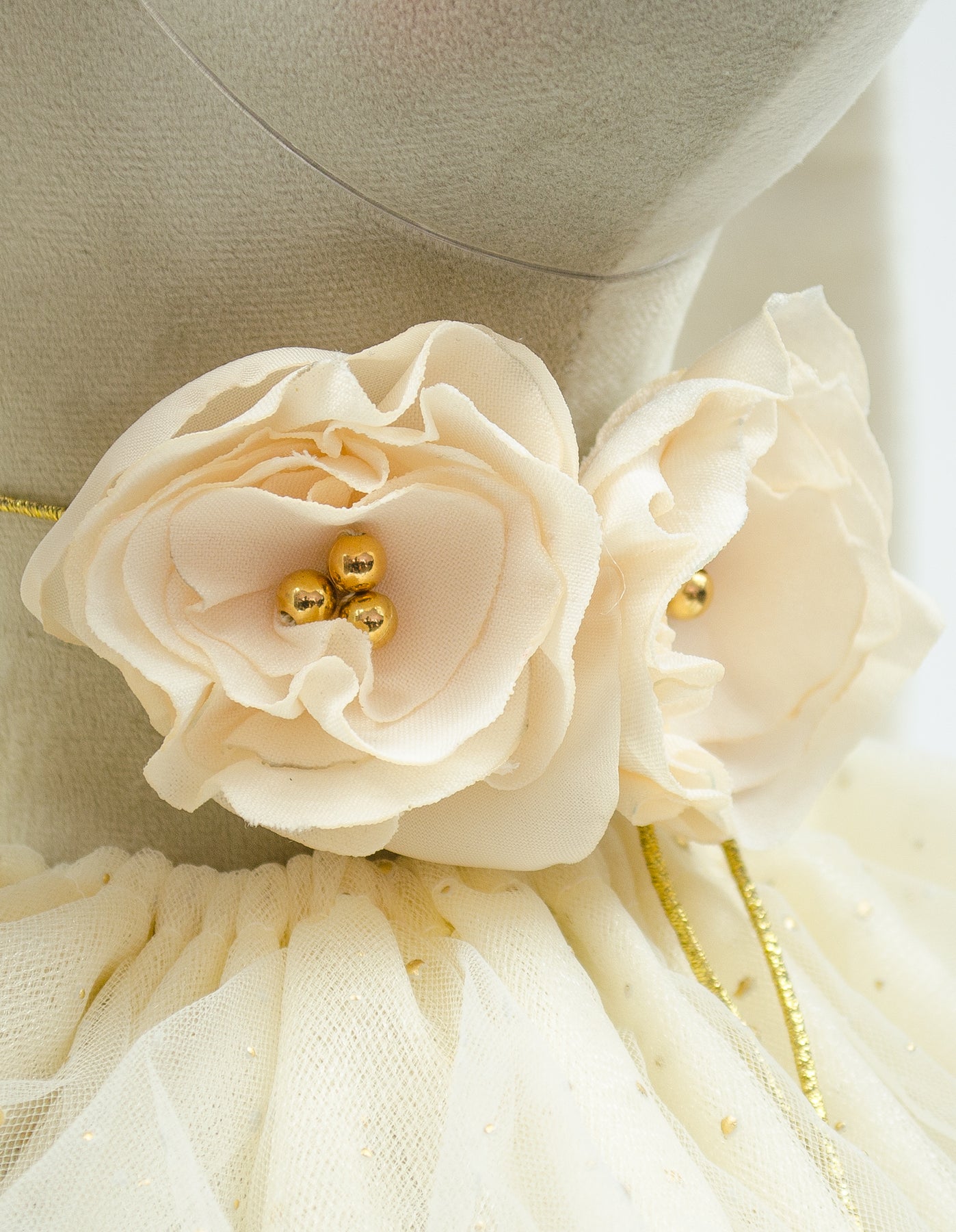 Dressed with a fancy pom pom party hat, a soft creamy ivory beige collar and skirt and wearing delicate blush roses upon her neck, Nina is highly elegant. Delicate and refined, she looks almost like a ballerina.