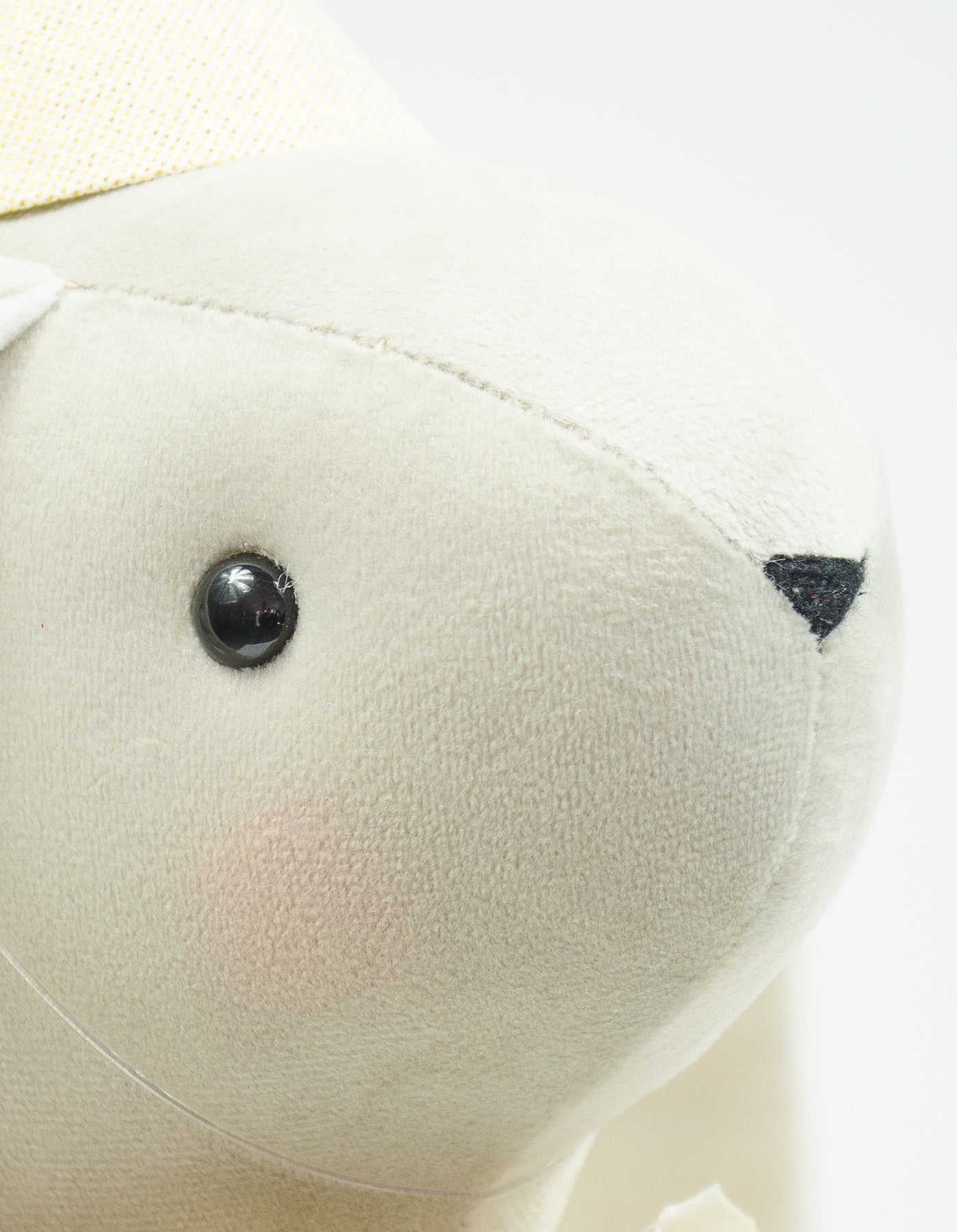 - The bunny’s body is made of light grey velvet. Very soft, the velvet is 100% polyester.
