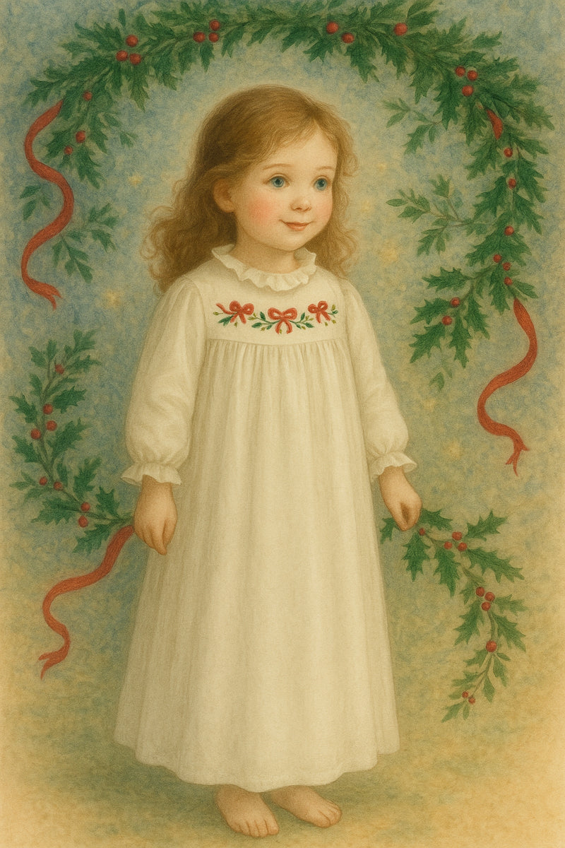 Enter a world where Christmas ribbons come alive with our magical nightgown. This enchanting piece transforms bedtime into a celebration of festive ribbons that dance and flutter, weaving through delicate holly to create the sweetest Christmas dreams.