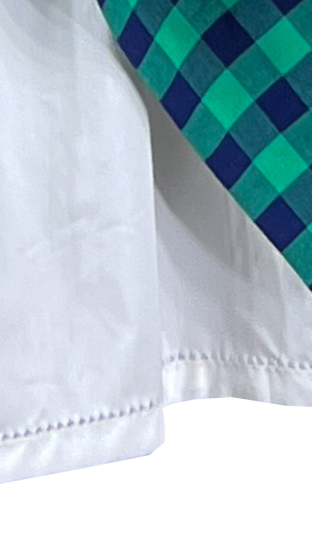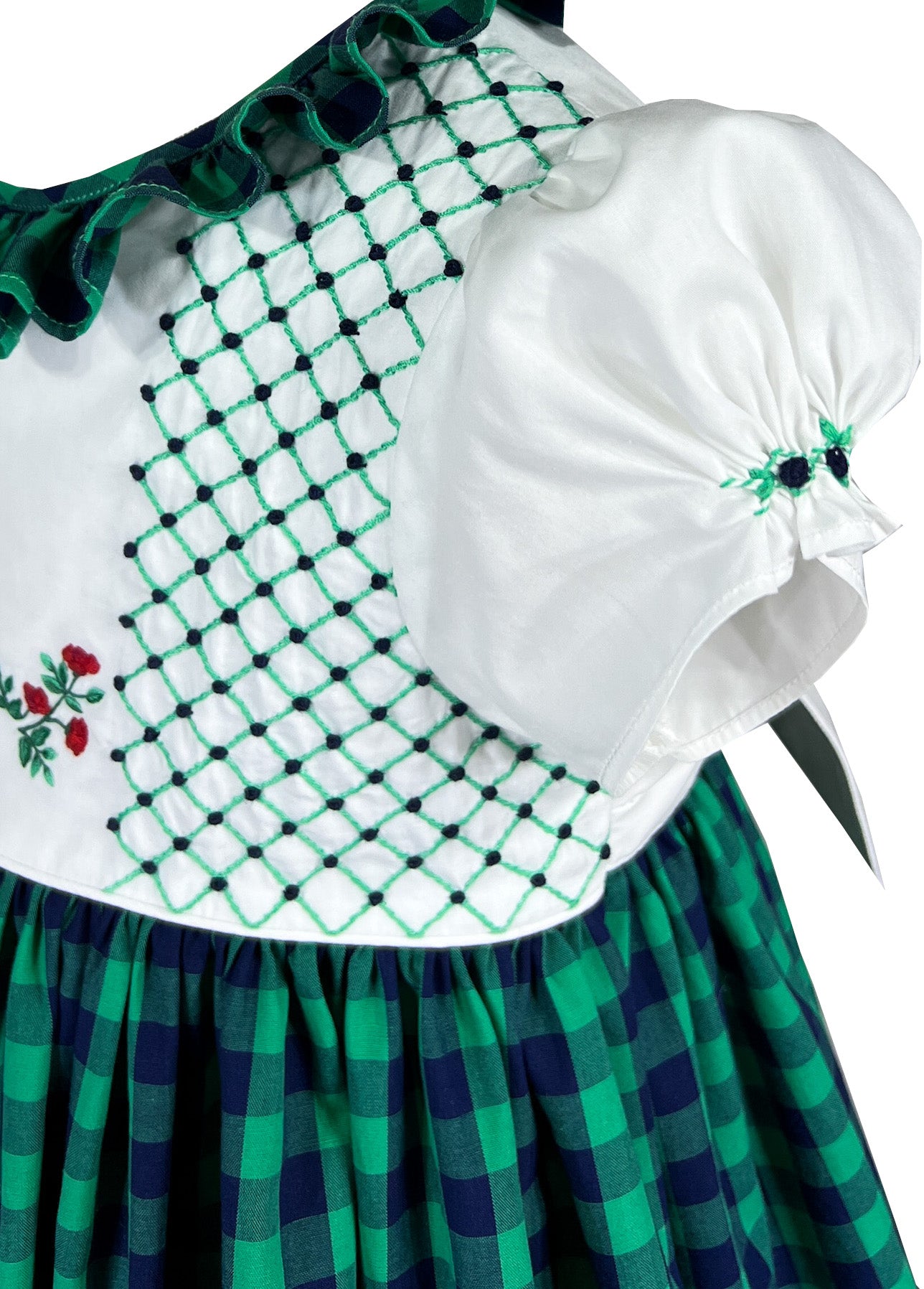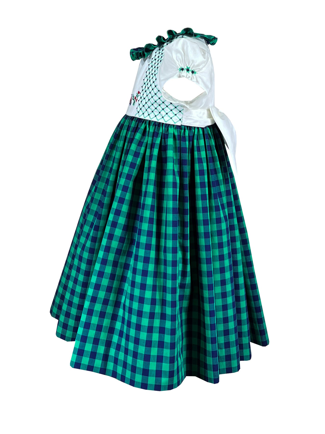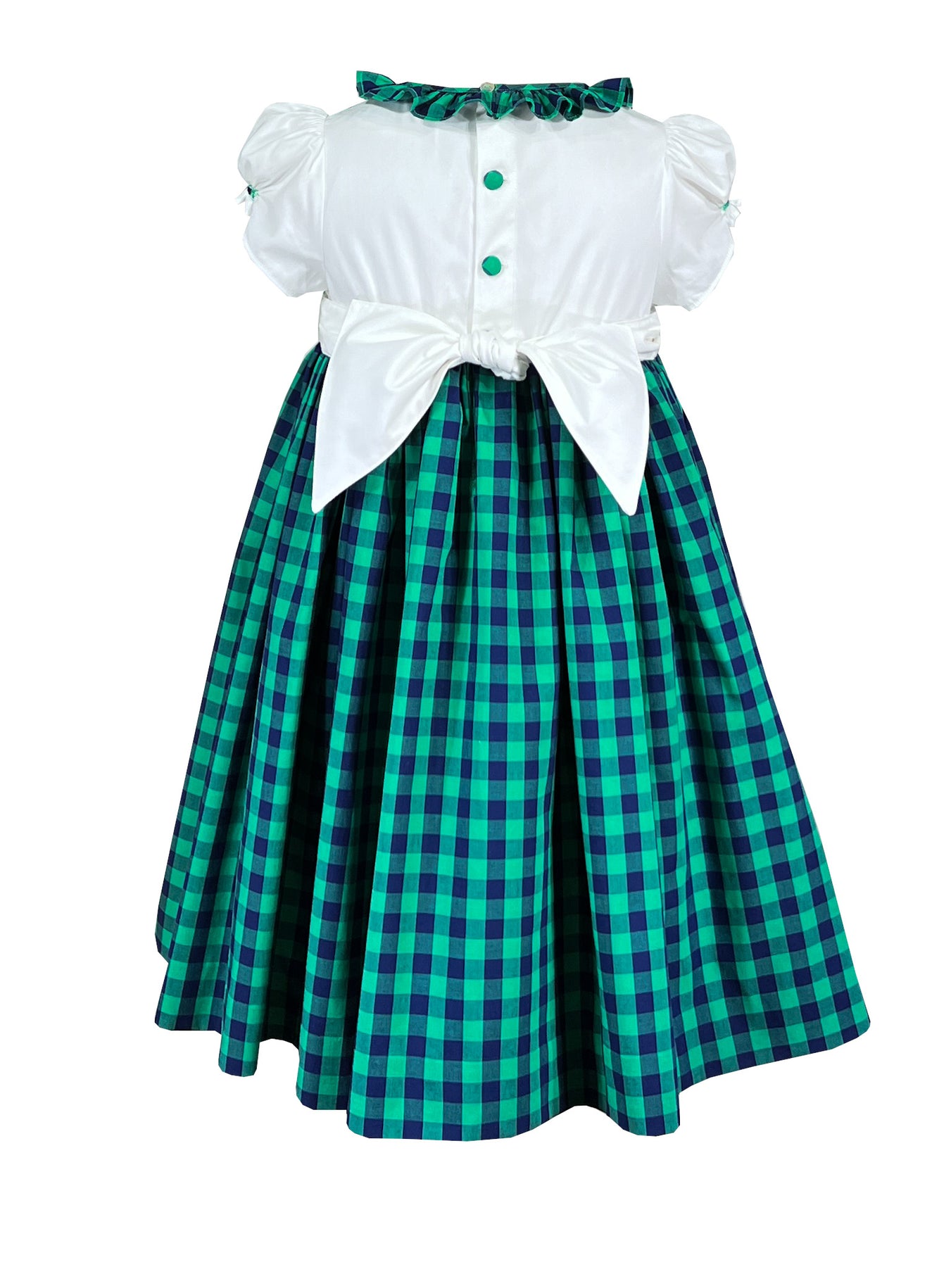 The skirt and wide pleated collar is crafted from high quality navy and emerald green checked cotton. This timeless pattern revisited in new shades offers a fresh twist.