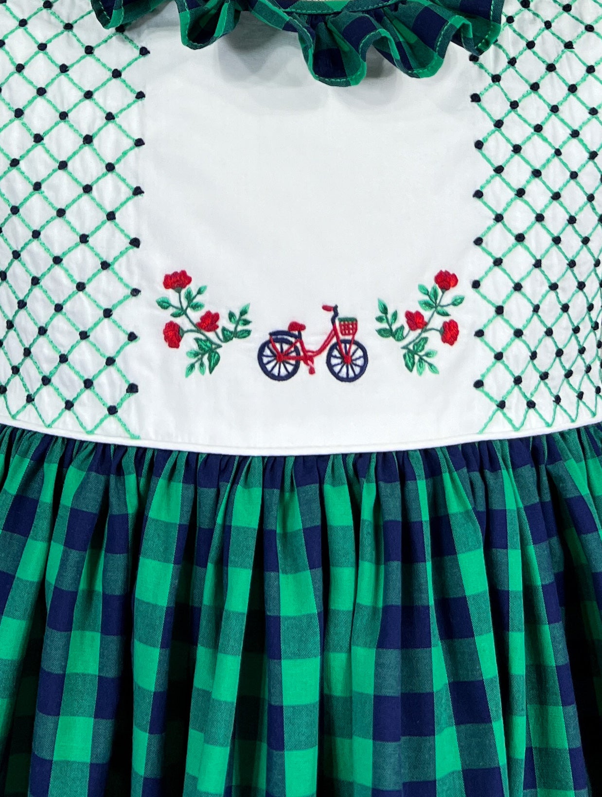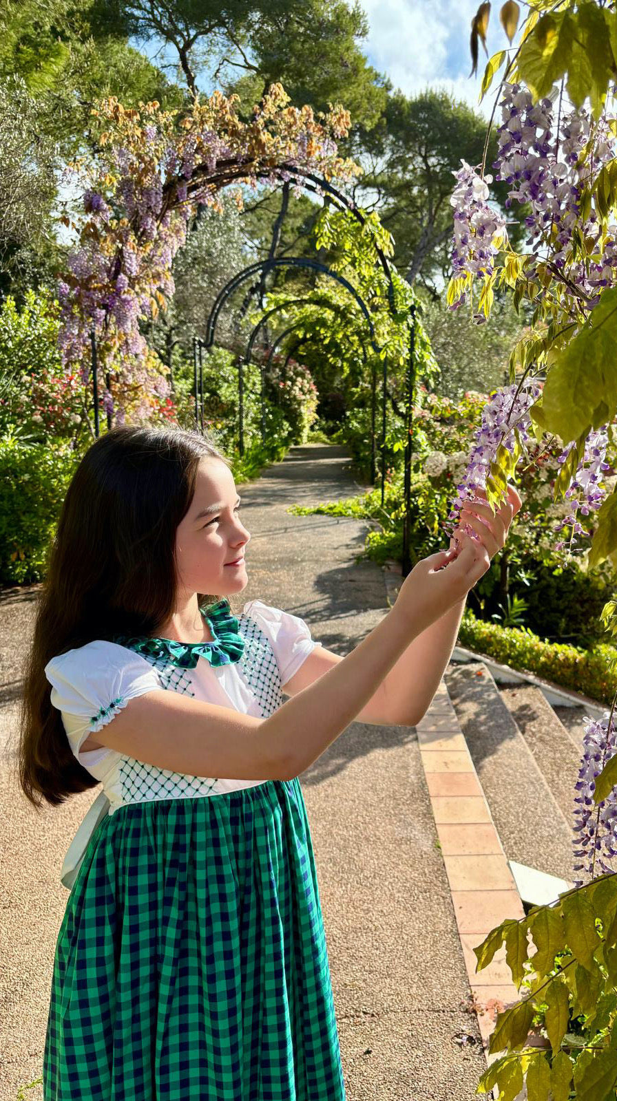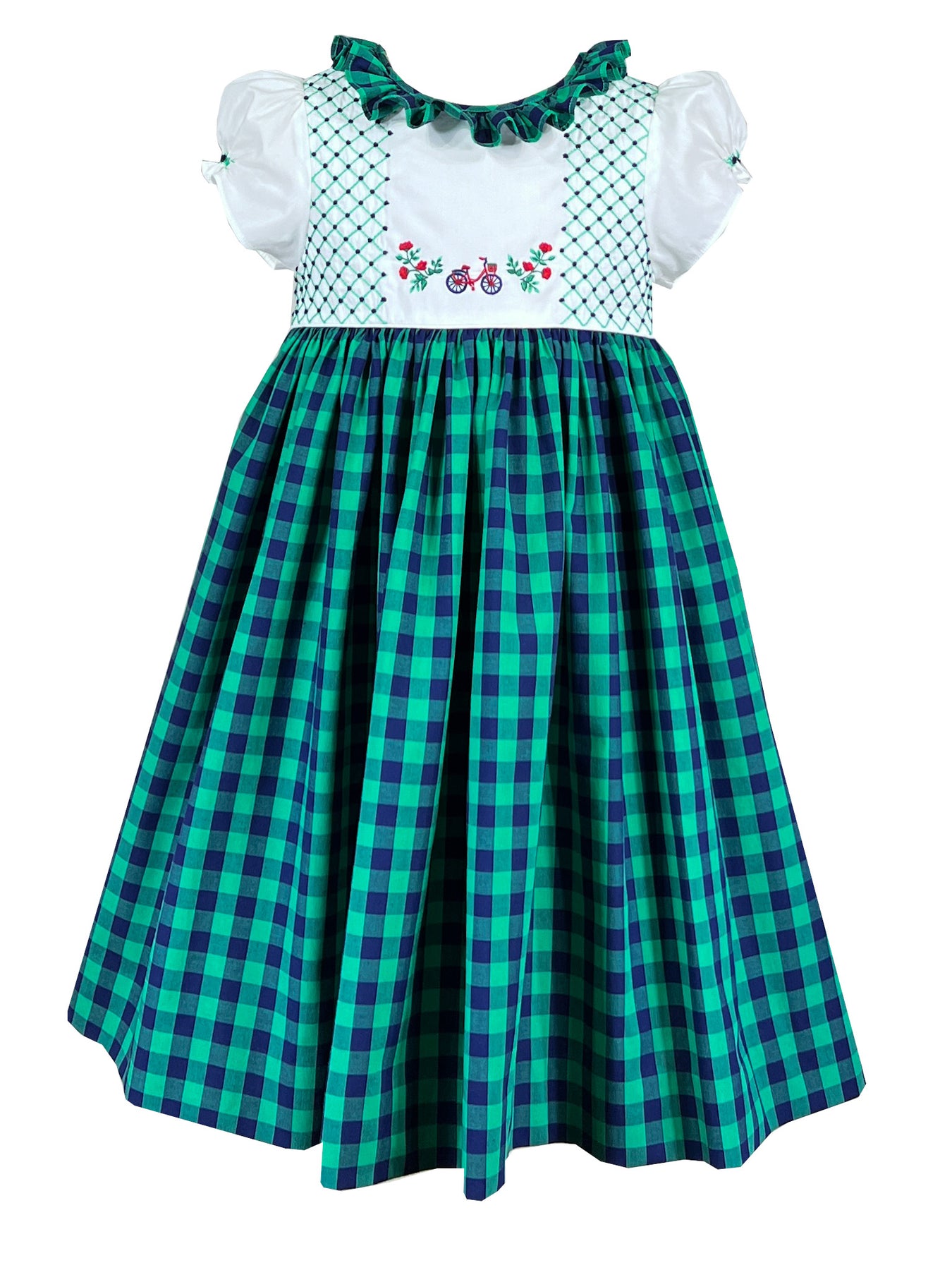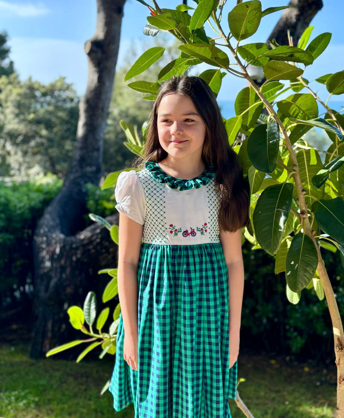 The skirt and wide pleated collar is crafted from high quality navy and emerald green checked cotton. This timeless pattern revisited in new shades offers a fresh twist.