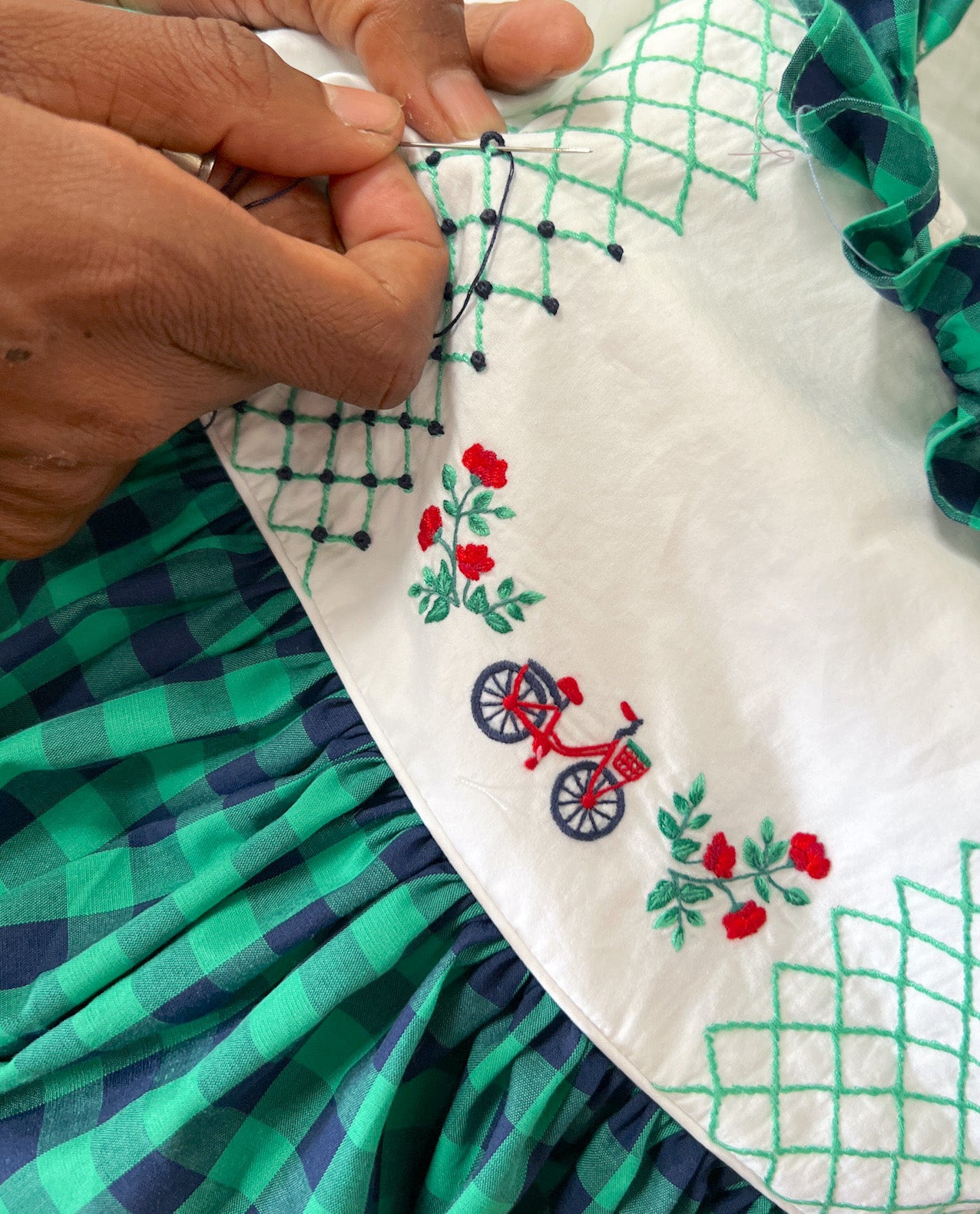 The pristine white bodice serves as a perfect canvas for a charming vintage red bicycle with wicker basket and floral stem embroideries. Placed with minute precision, every stitch is handmade, every thread color thoughtfully chosen.
