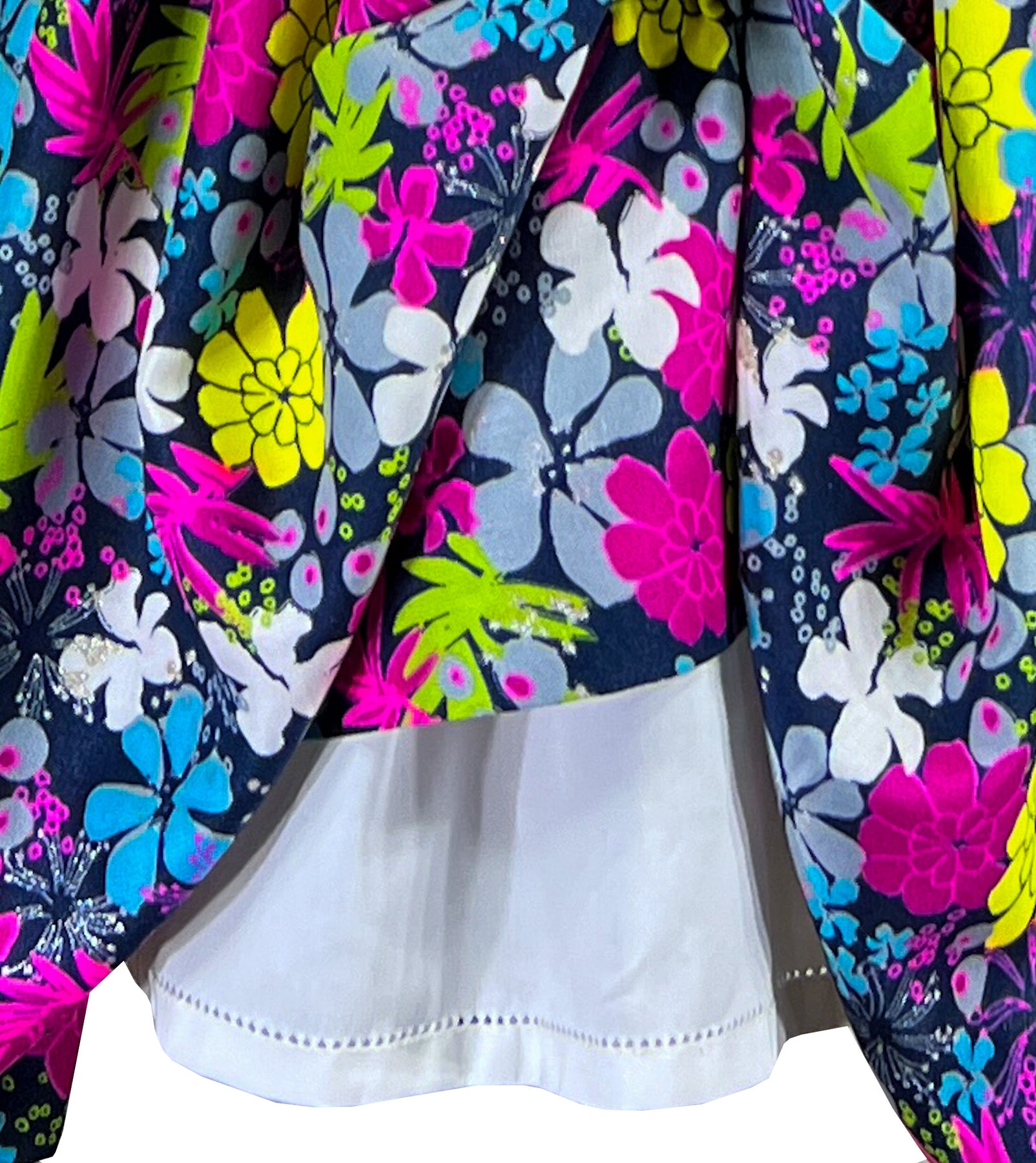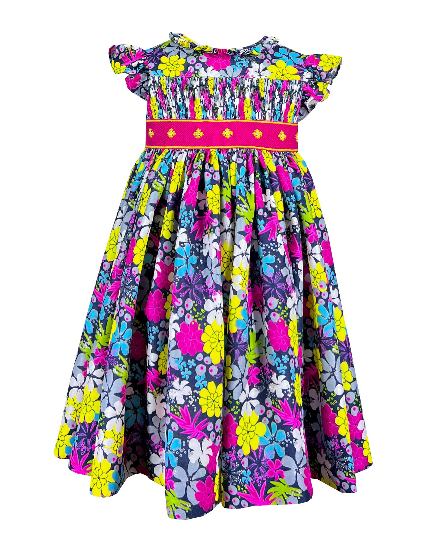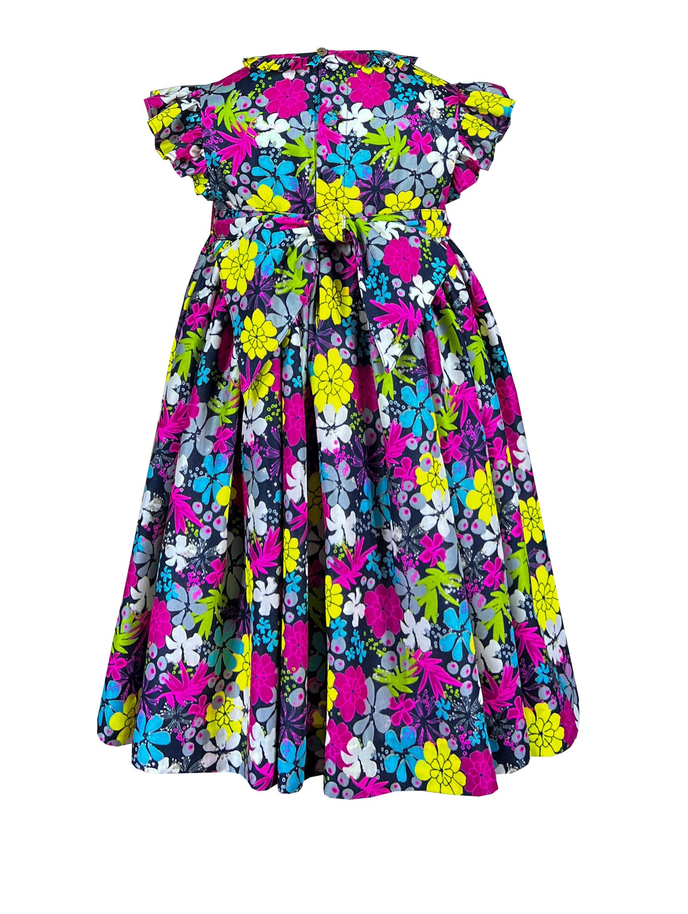 This vibrant dress showcases a magnificent floral print bursting with fuchsia, lemon, azure, and ivory blooms against a deep navy canvas. True embodiment of both timeless craftsmanship and carefree childhood joy, it revisits artisanal tradition with a fresh twist.