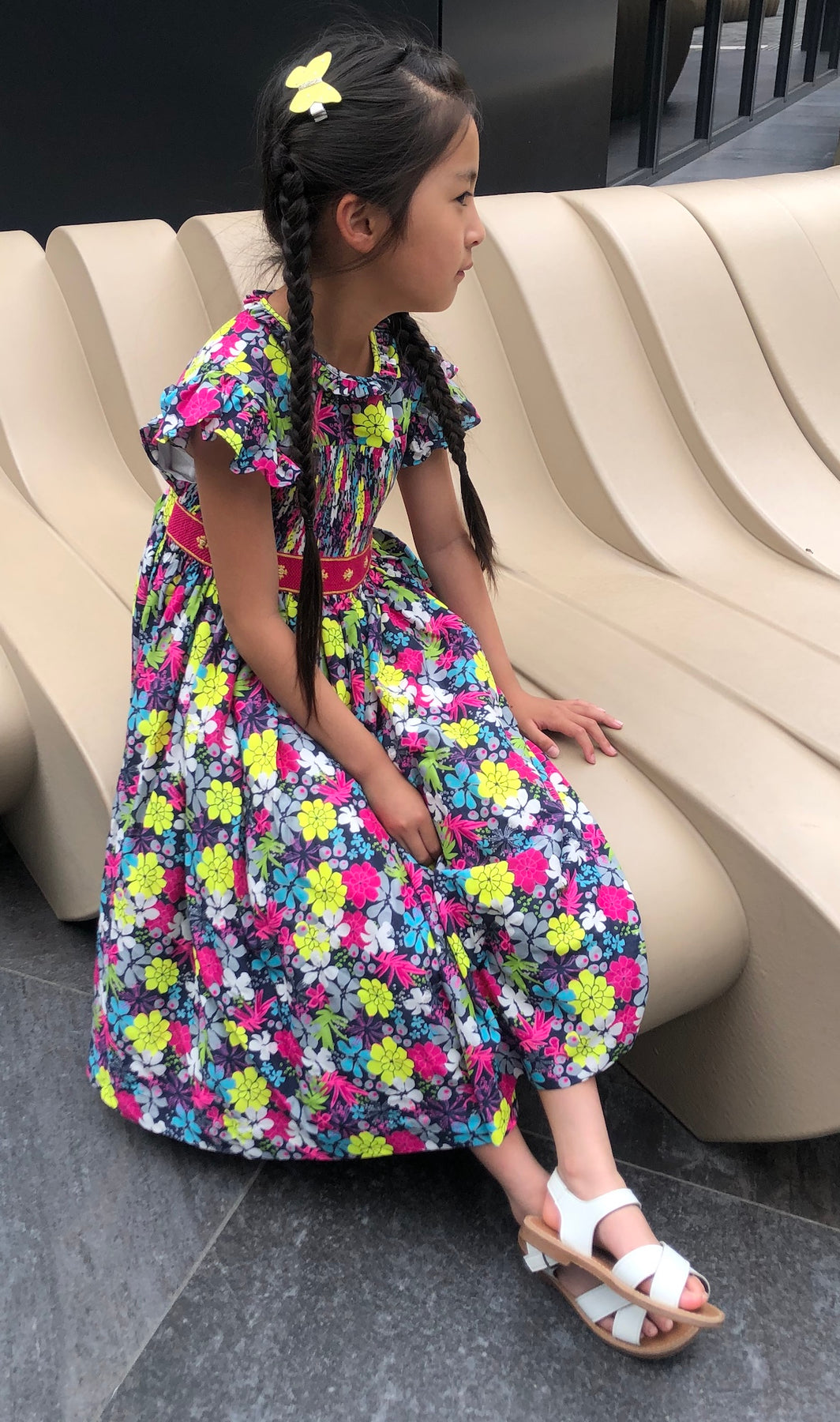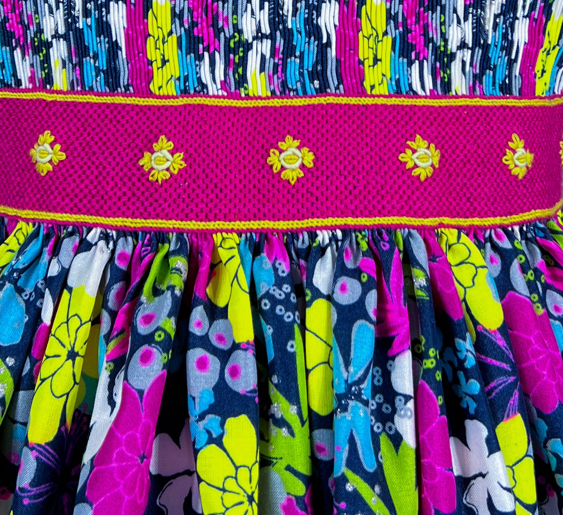 A rich fuchsia smocked waistband adorned with handcrafted yellow floral embroidery highlights the patterns’ shades while flutter sleeves and a delicate pleated ruffle collar structure the design. The voluminous gathered skirt creates a perfect silhouette for twirling through summer gardens,