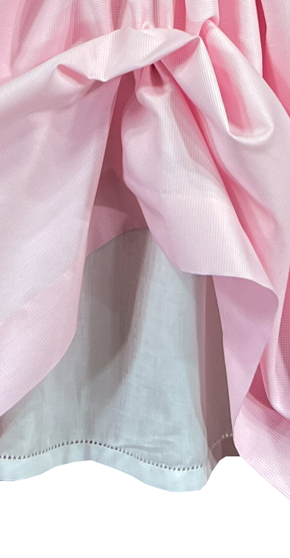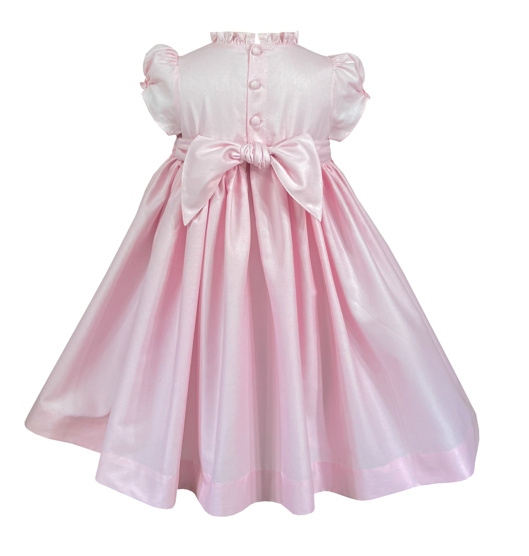 The full gathered skirt flows gracefully from the hand-smocked bodice, creating lovely movement with every step. Self-covered buttons fasten down the back, and a bow sash at the waist ensures a perfect fit.